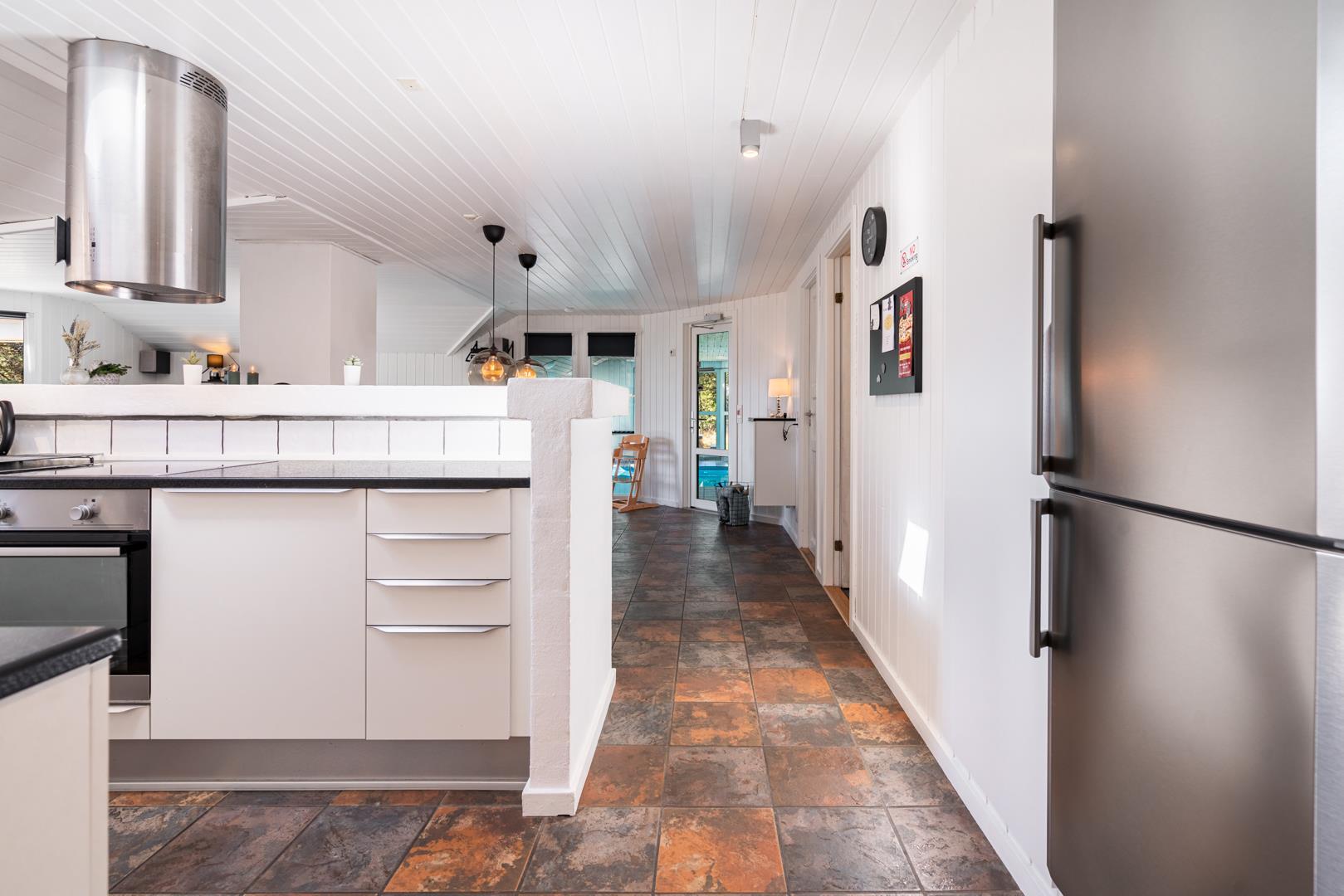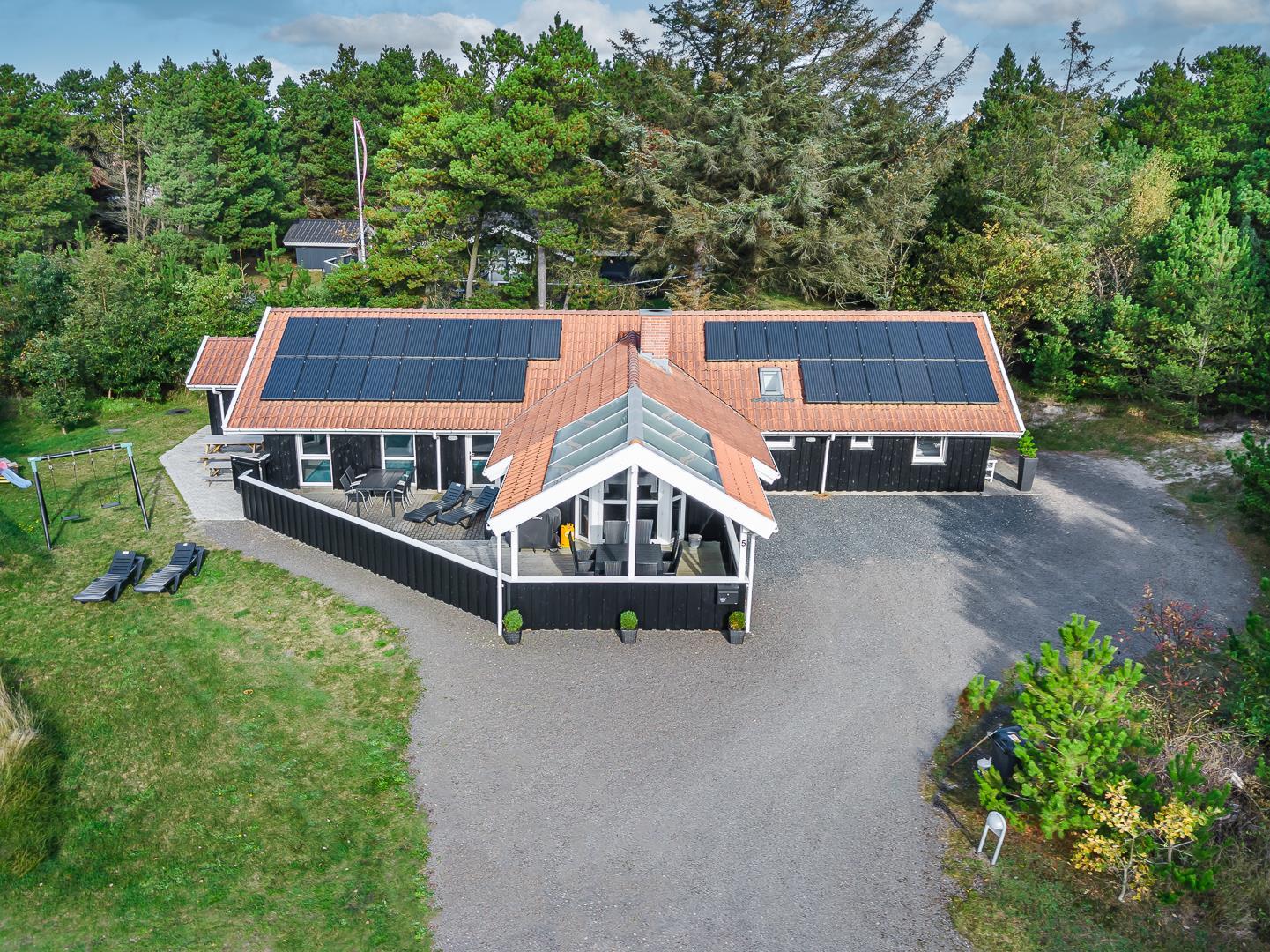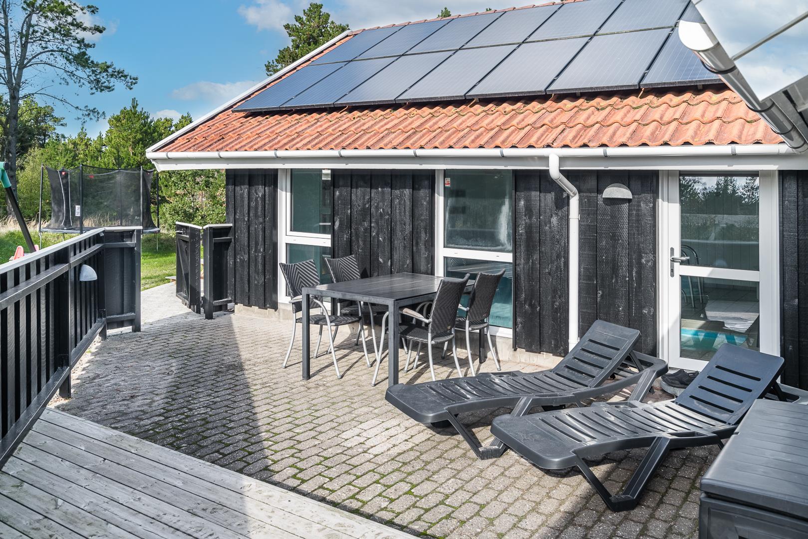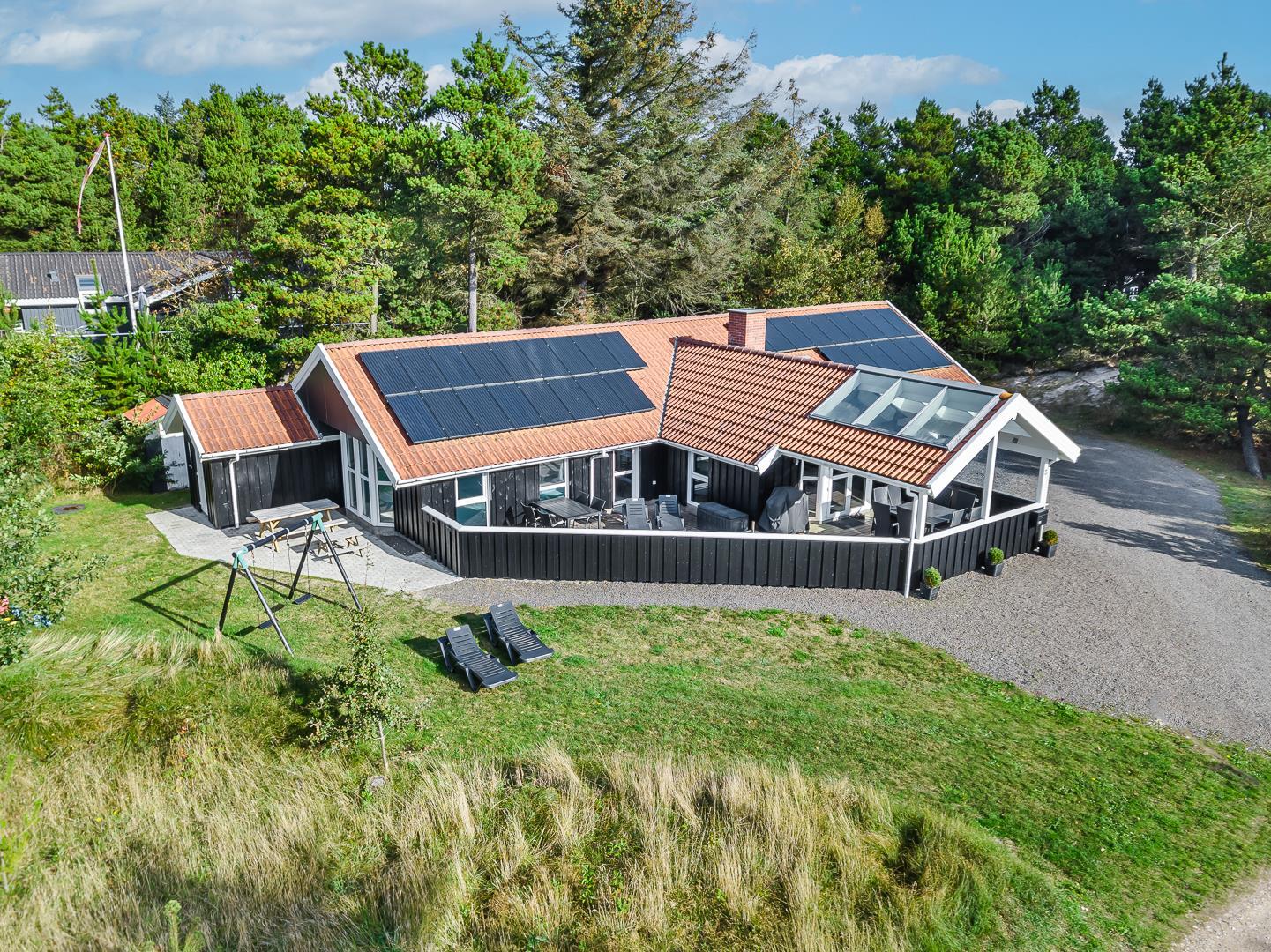 I det store swimmingpoolrum er den stor swimmingpool (4,0 x 6,0 m) Desuden er der en lille børnepool til de mindste, 6-pers. spa og direkte adgang til et af husets badeværelser, som er udstyret med bruser og sauna. Udenfor er der tænkt på husets små gæster, så her er der gynge og sandkasse.