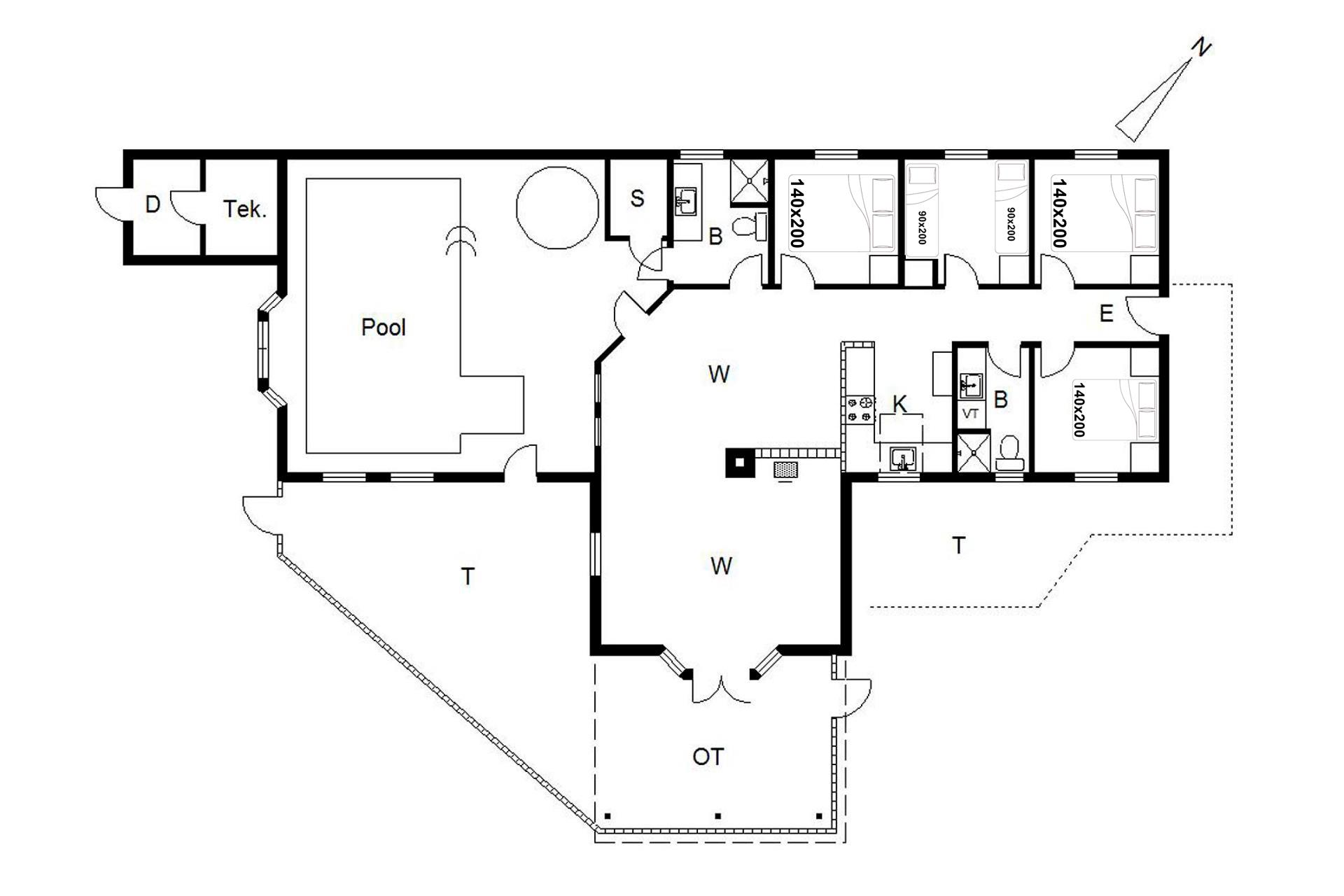 Sengestørrelse: 3 dobbeltsenge 140 x 200 cm + 2 enkeltsenge 90 x 200 cm