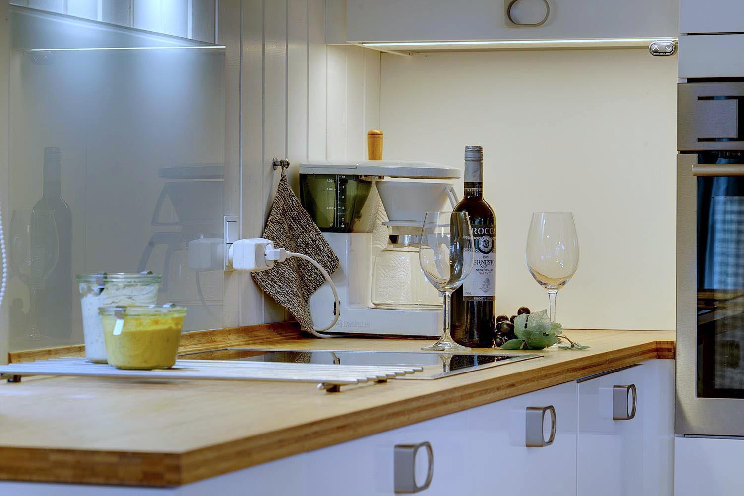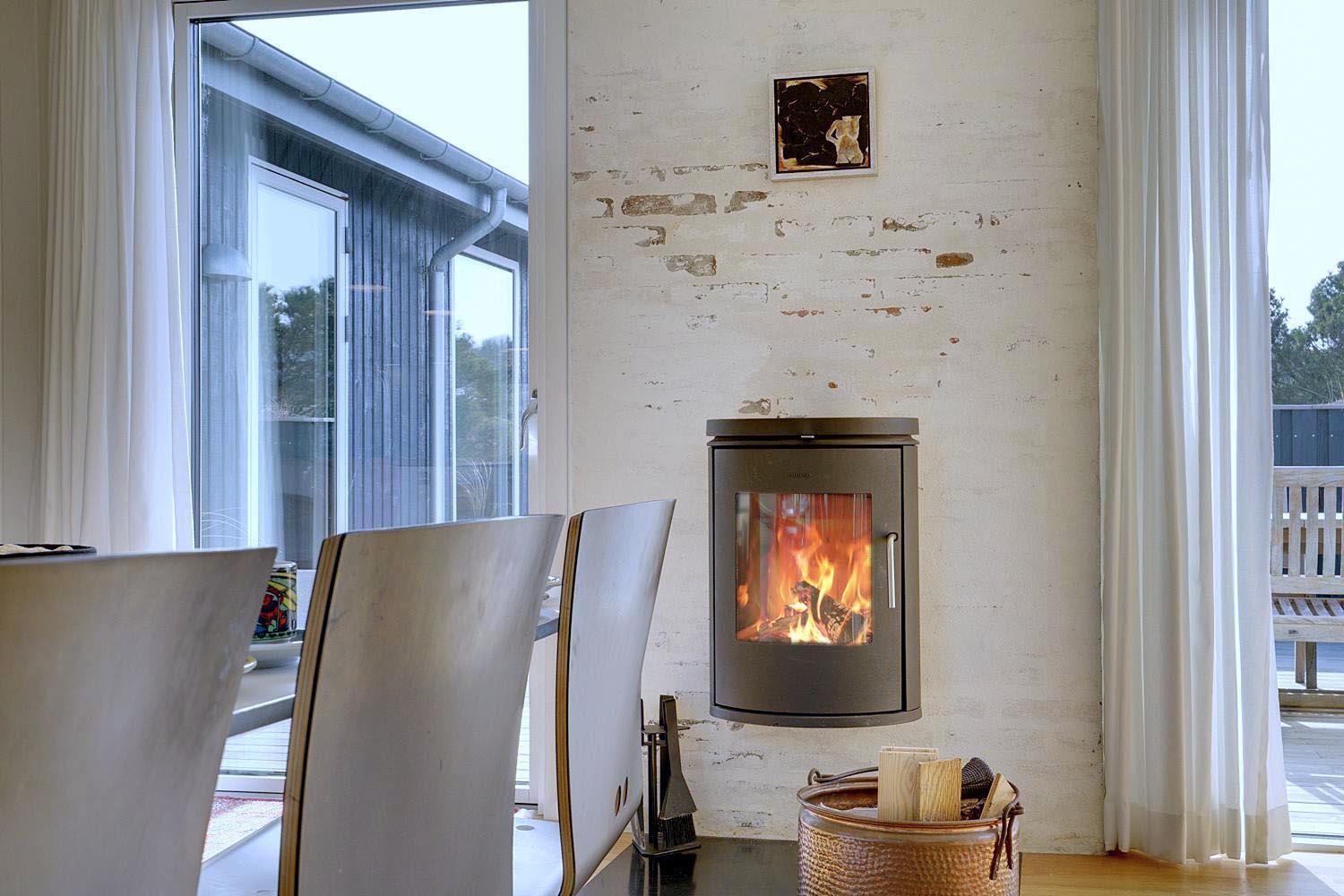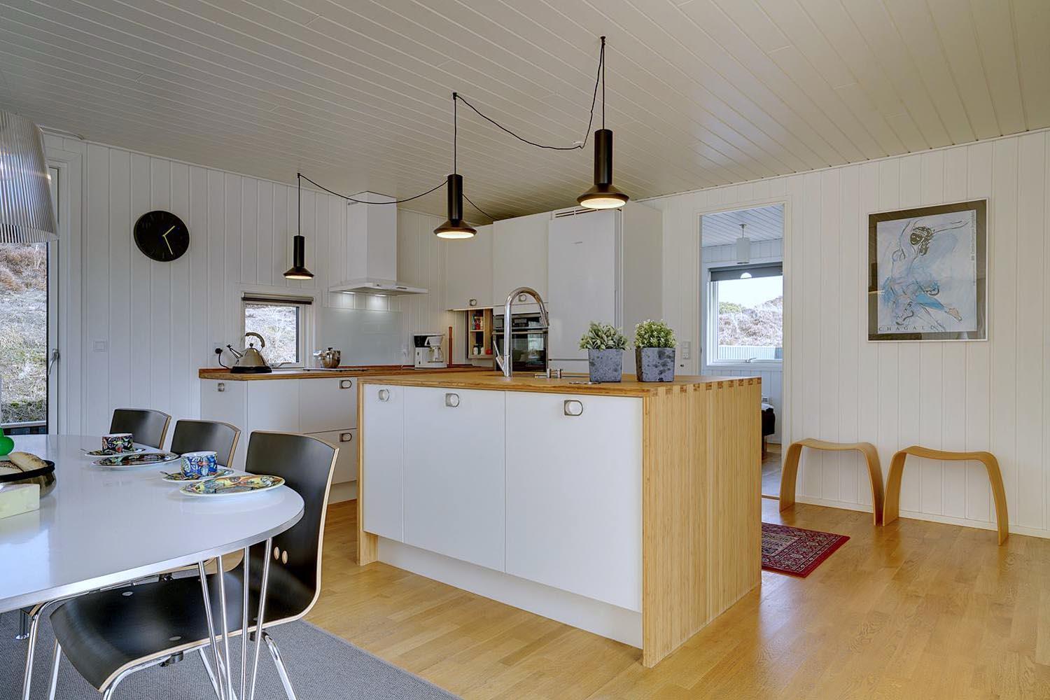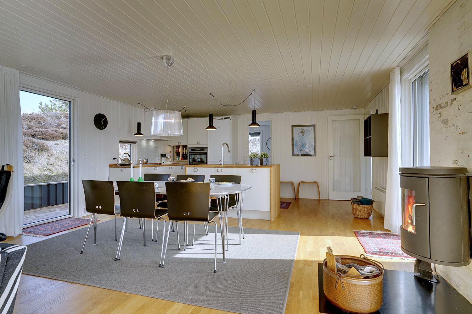 Huset er løbende moderniseret og fremstår lyst, indbydende og komfortabelt. Den store stue har smukke trægulve og en hyggelig brændeovn, der skaber en varm atmosfære på kølige dage. Køkkenet er lækkert og moderne, og den åbne forbindelse til stuen giver en rummelig og social stemning.