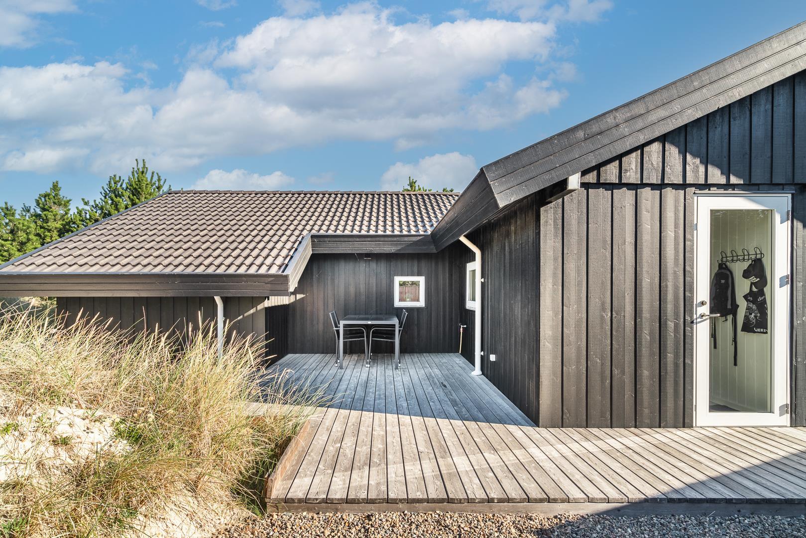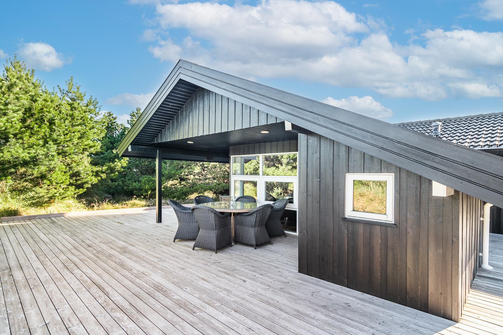 Rundt om huset breder sig store, solrige træterrasser, hvor I altid kan finde en læfyldt krog – uanset tidspunkt på dagen. Her er plads til grillhygge, solbadning eller bare en stille stund med en god bog.