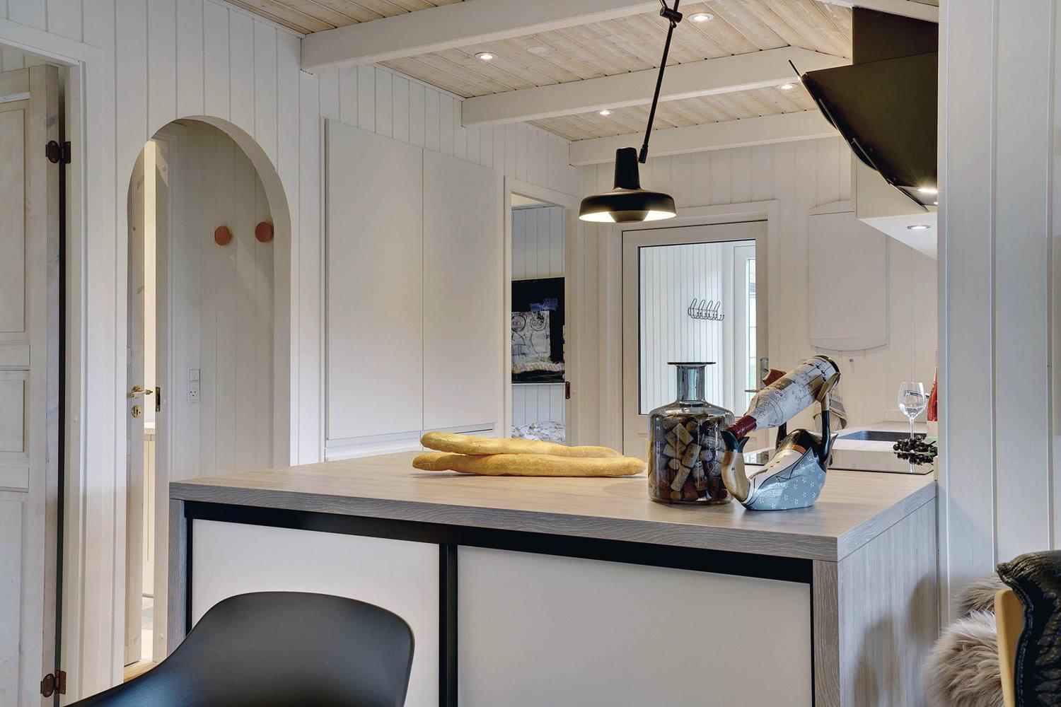 Det nyere køkken ligger i åben forbindelse med den smagfuldt møblerede stue, hvor I kan samles til madlavning, spil og afslapning foran brændeovnen.