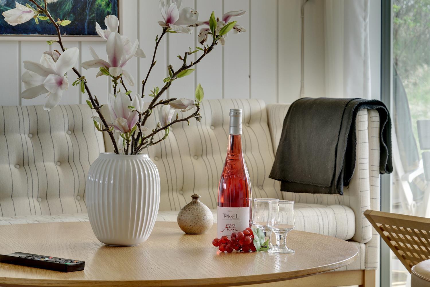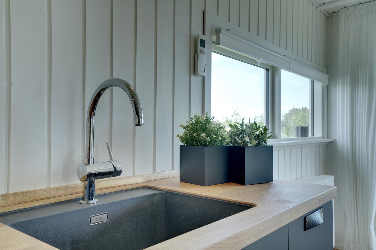 Hjelmevej 154 - Henne Strand er smagfuldt og hyggeligt indrettet med kvalitetsmøbler og trægulve i hele huset, hvilket skaber en varm og indbydende atmosfære. Det moderne køkken ligger i åben forbindelse med stuen, hvilket gør det nemt at samles til gode måltider og hyggelige stunder.
