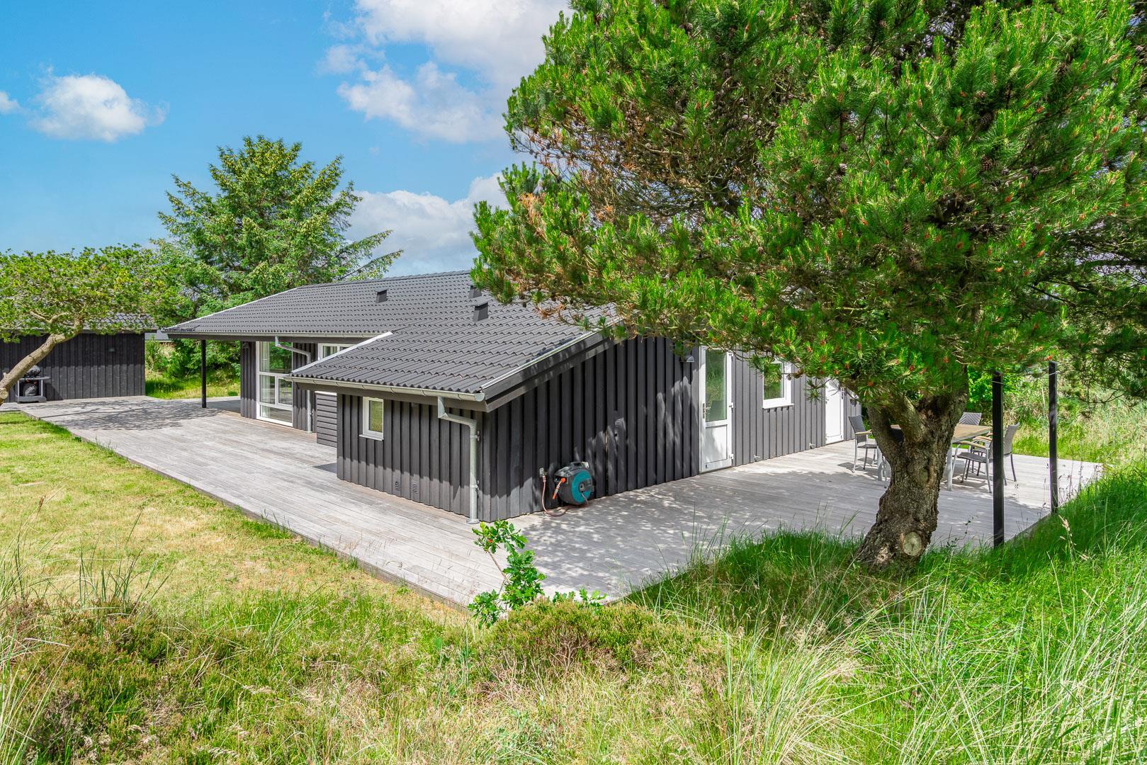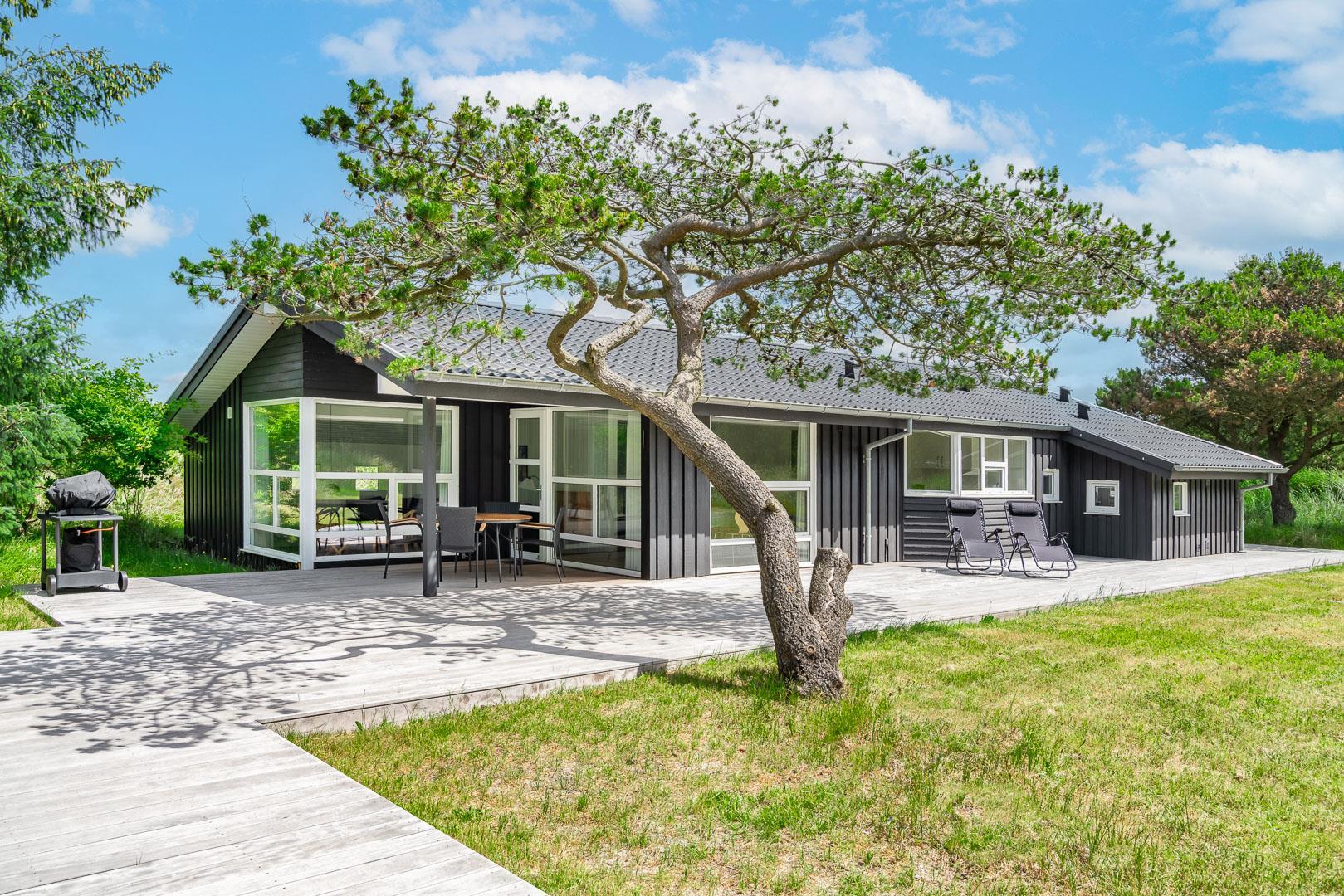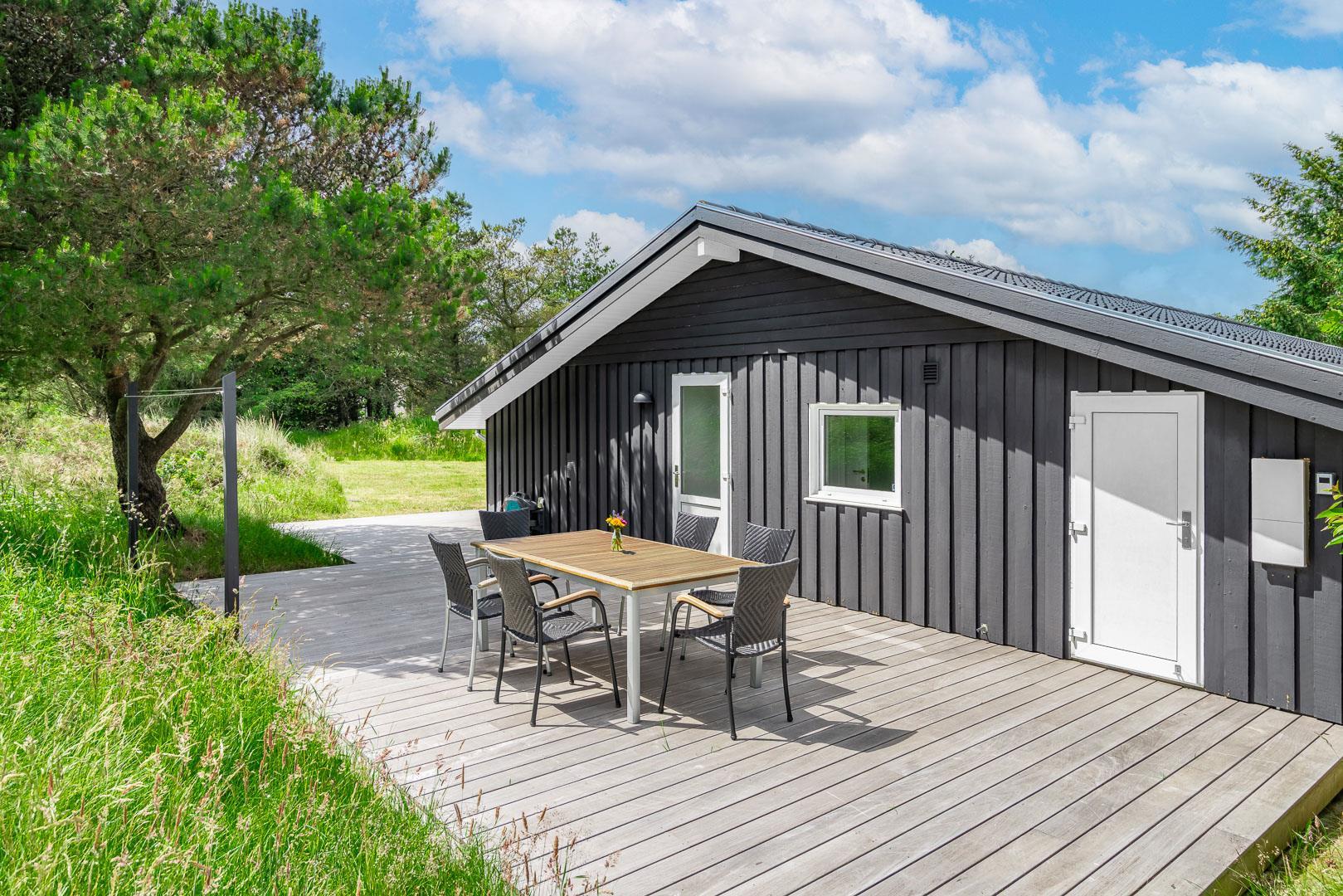 Lyst og velholdt feriehus ved fredet hedeområde med spabad, sauna og flere terrasser tæt på Henne Strand.