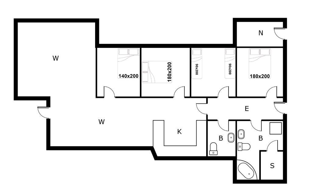 Sengestørrelser: 2 dobbeltsenge 180 x 200 cm + 1 dobbeltseng 140 x 200 cm + 2 enkeltsenge 90 x 200 cm.