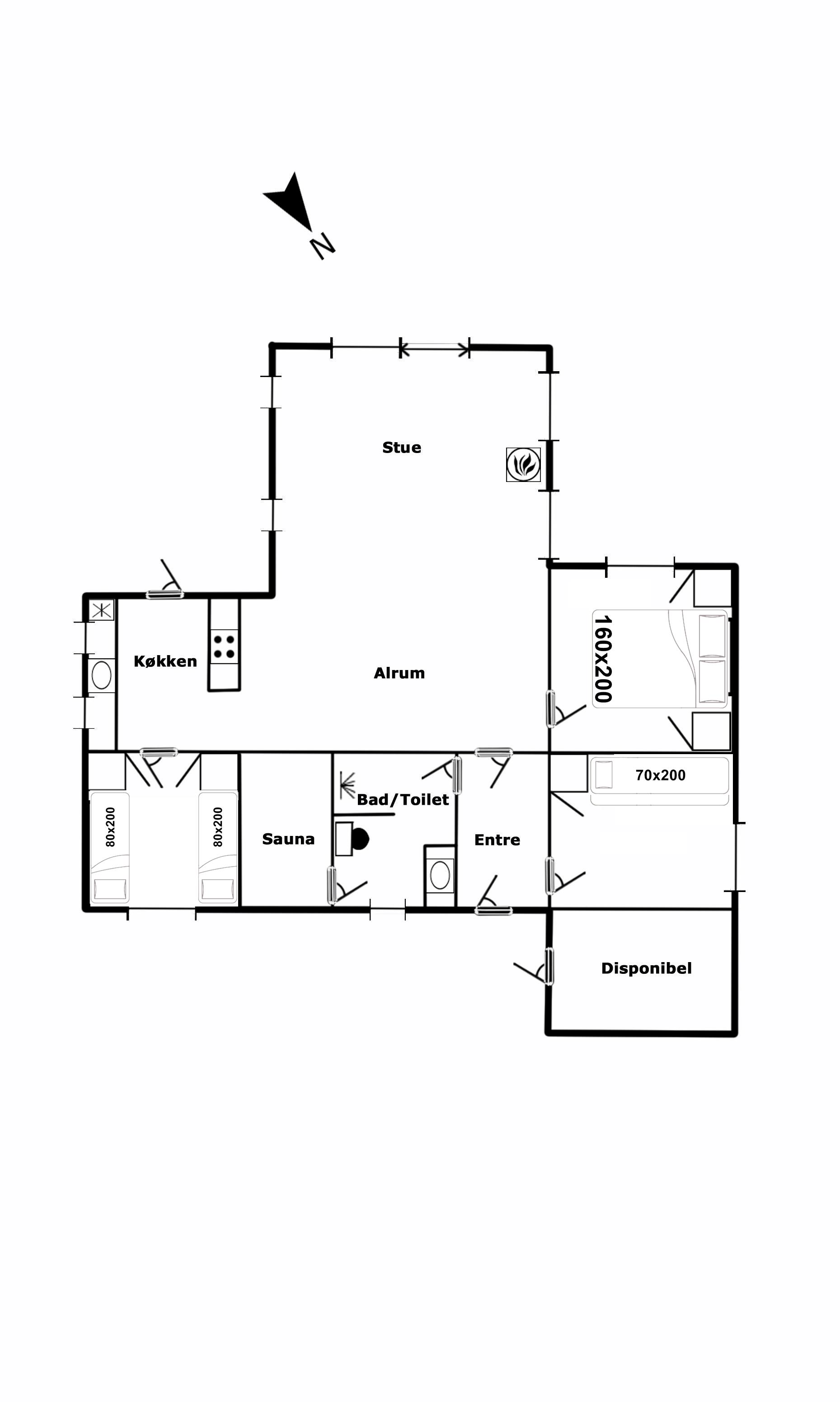Sengestørrelser: 1 dobbeltseng 160 x 200 cm + 2 enkeltsenge 80 x 200 cm + køjeseng 70 x 200 cm.
