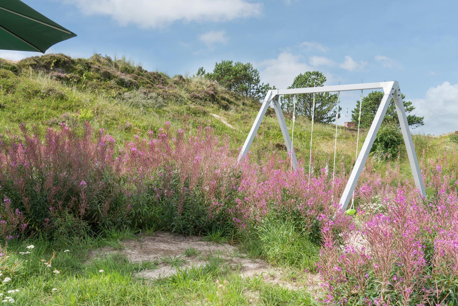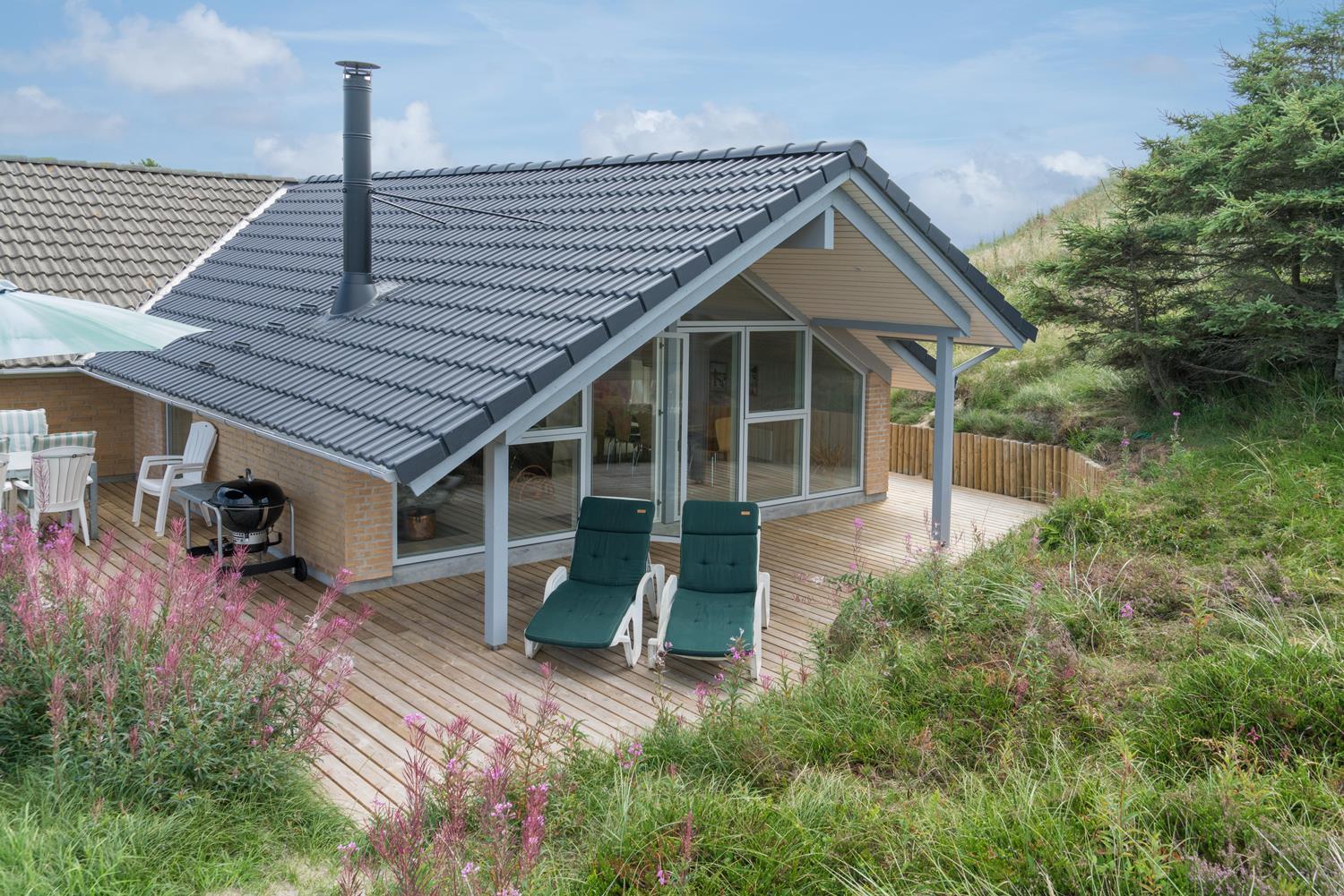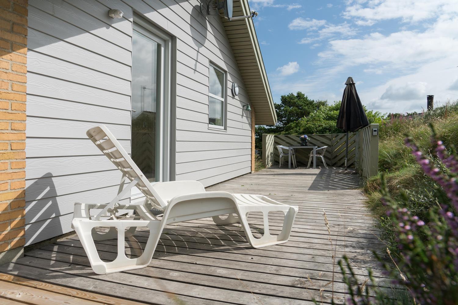 En del af terrassen er overdækket, så man kan flytte ind under tag når duggen falder. Bag huset er der en høj klit, som giver læ på terrassen. Der er også tænkt på de små gæster. Der er både sandkasse og gynge.