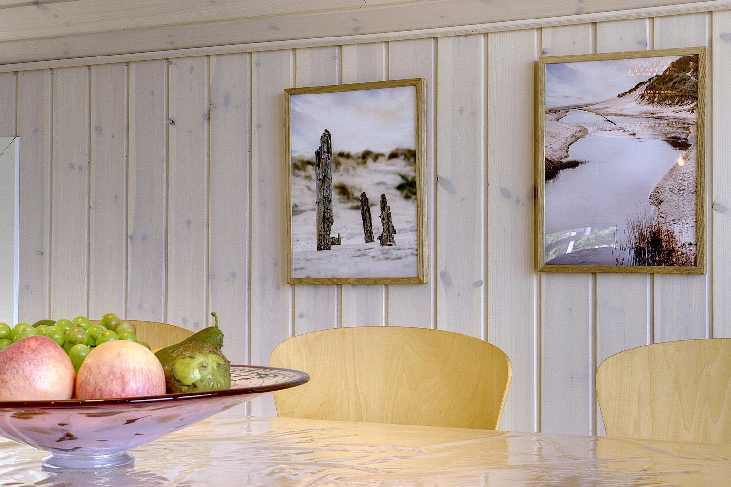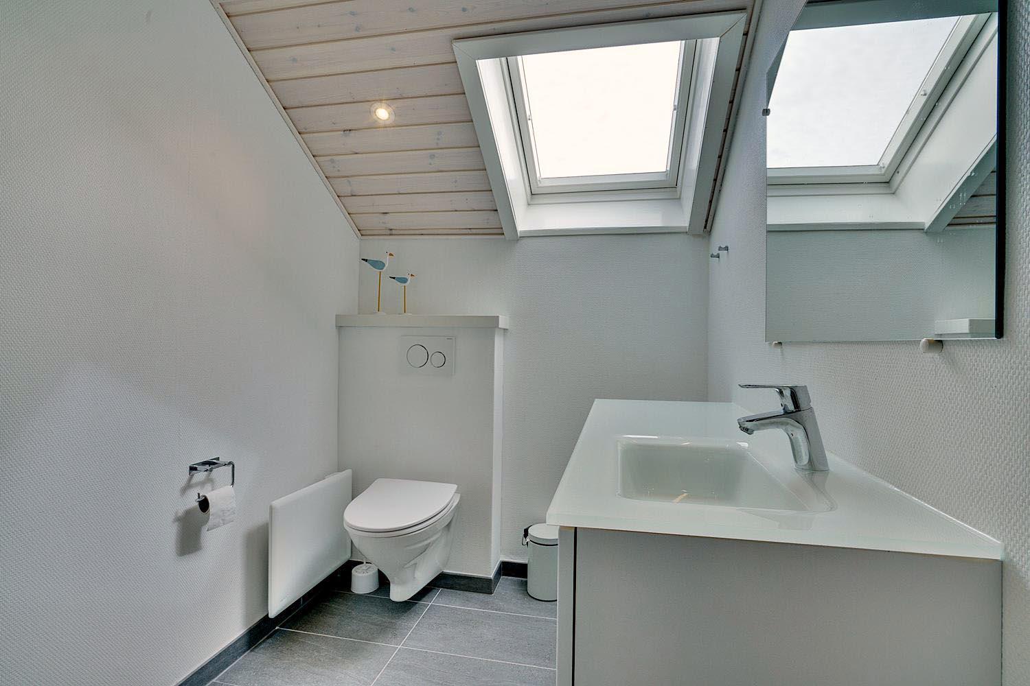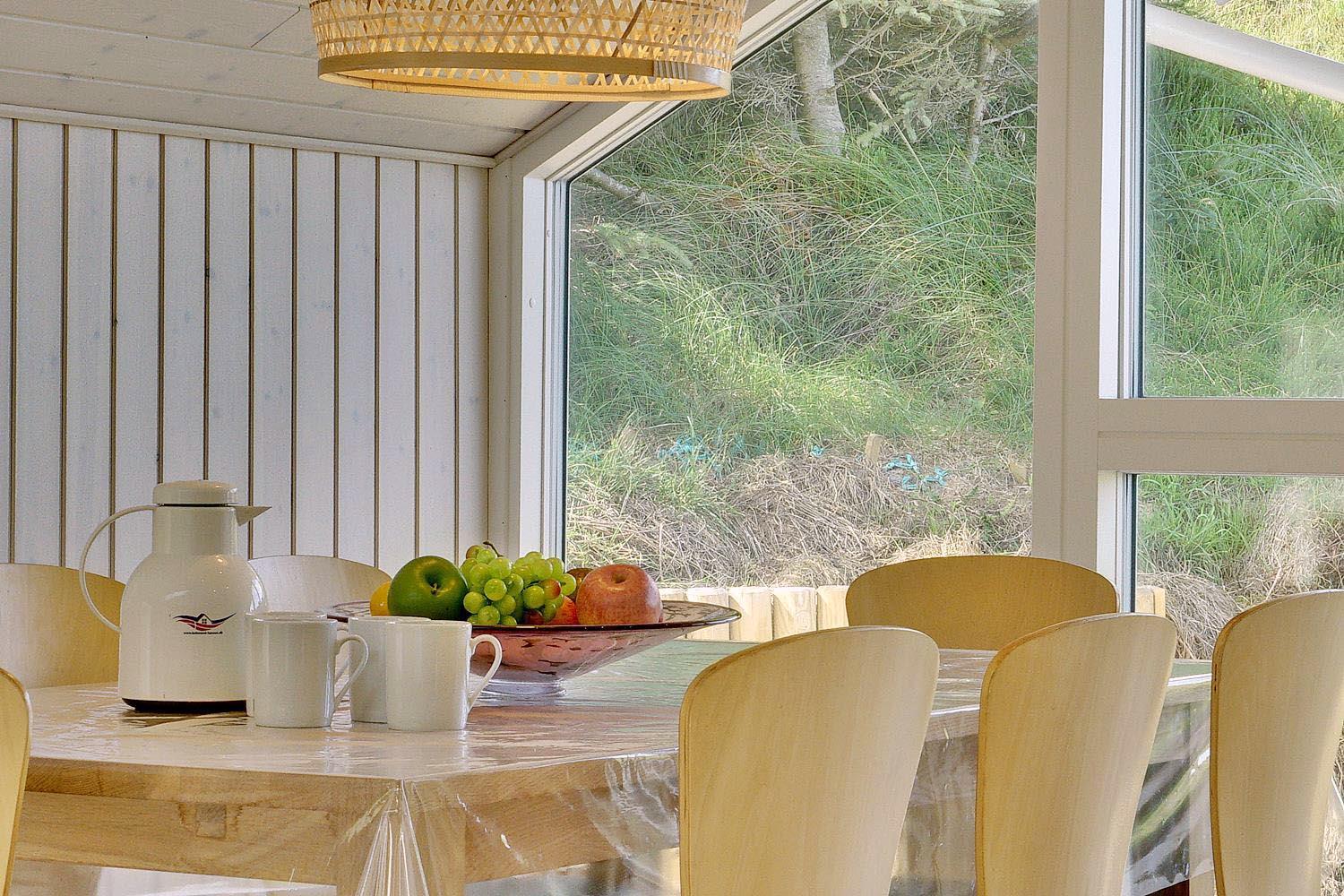 En del af terrassen er overdækket, så man kan flytte ind under tag når duggen falder. Bag huset er der en høj klit, som giver læ på terrassen. Der er også tænkt på de små gæster. Der er både sandkasse og gynge.