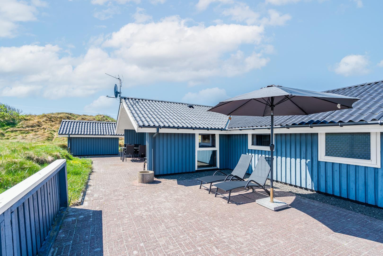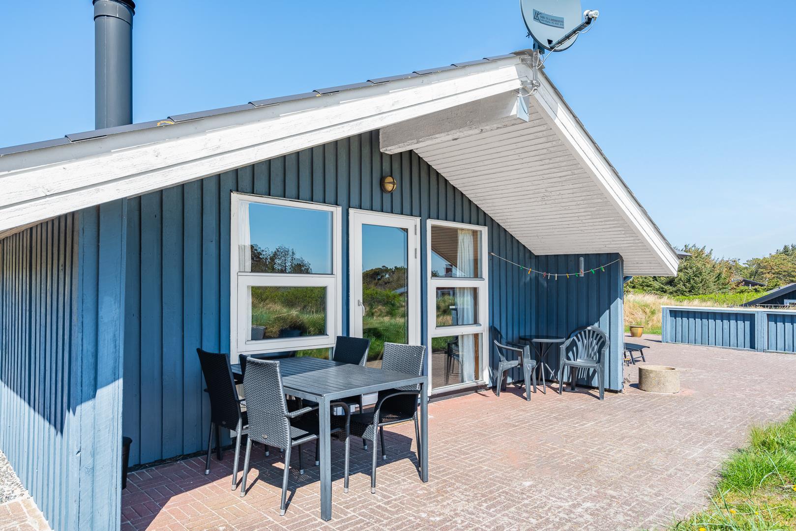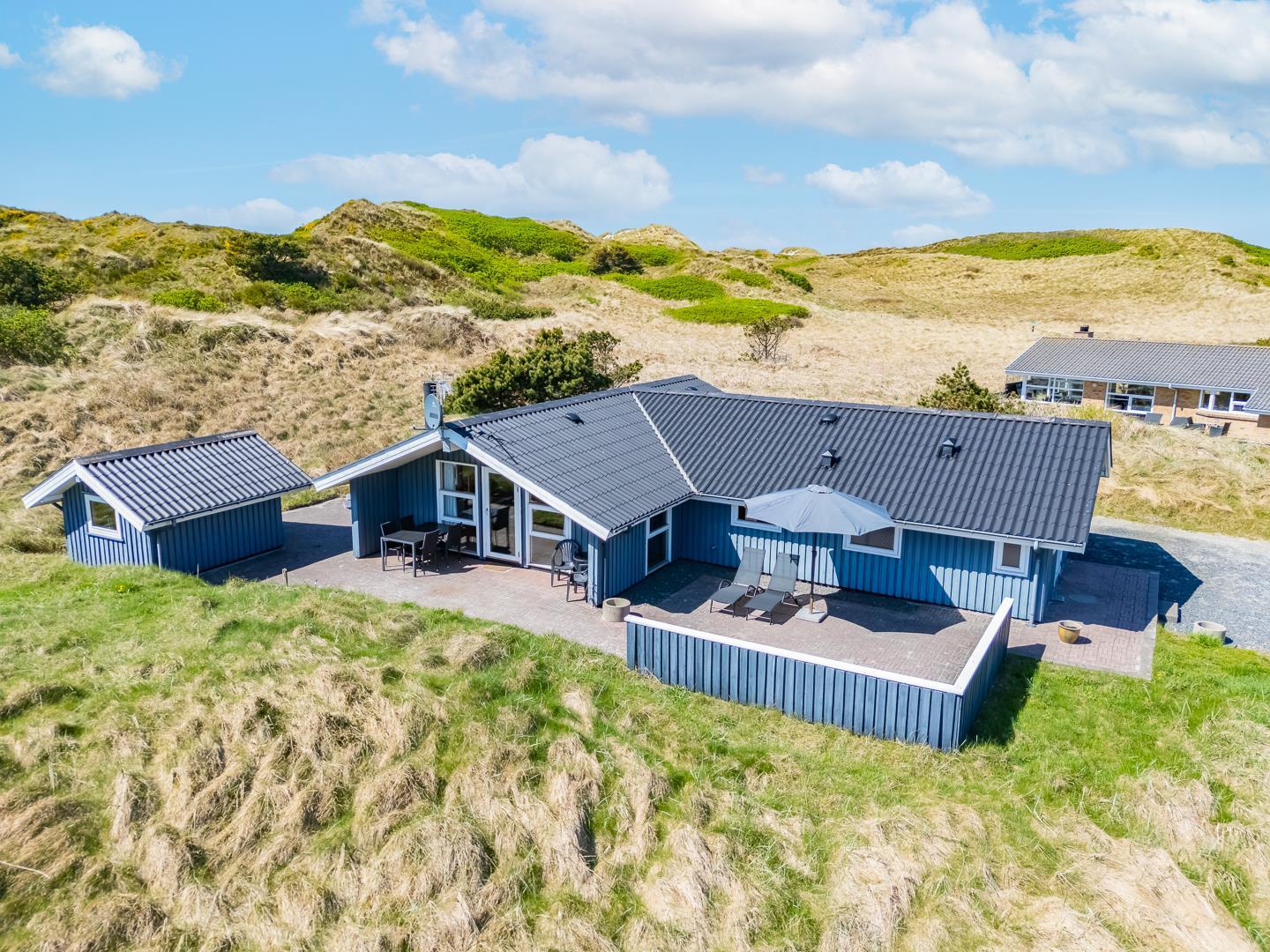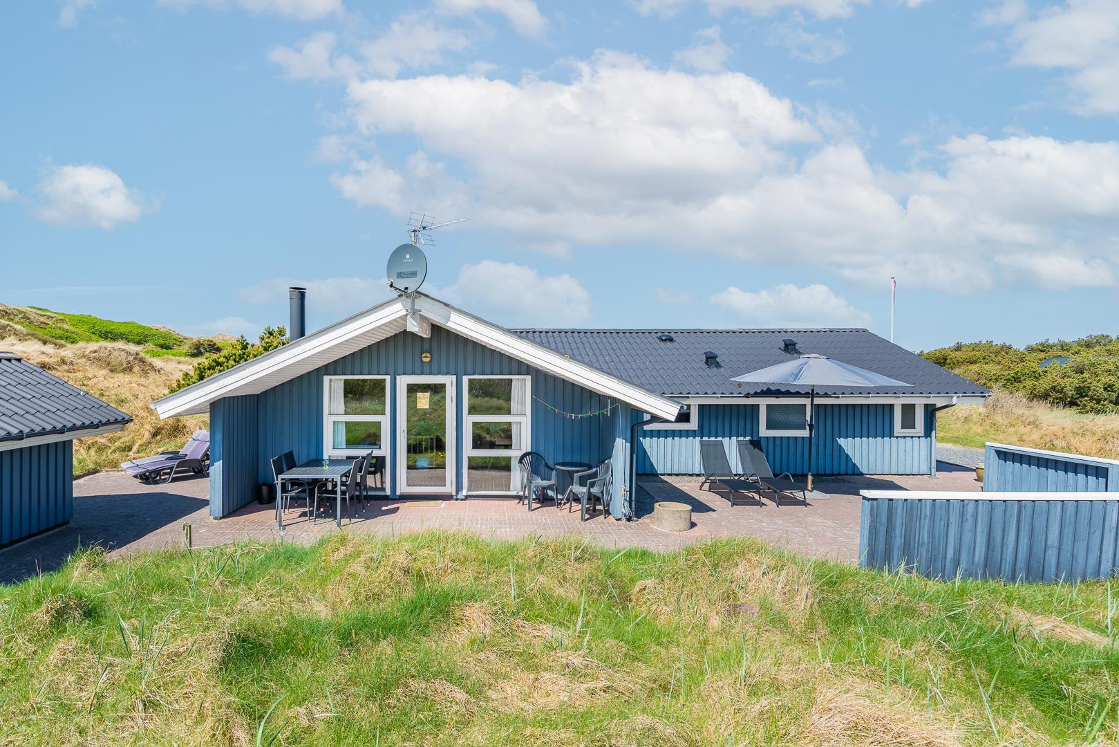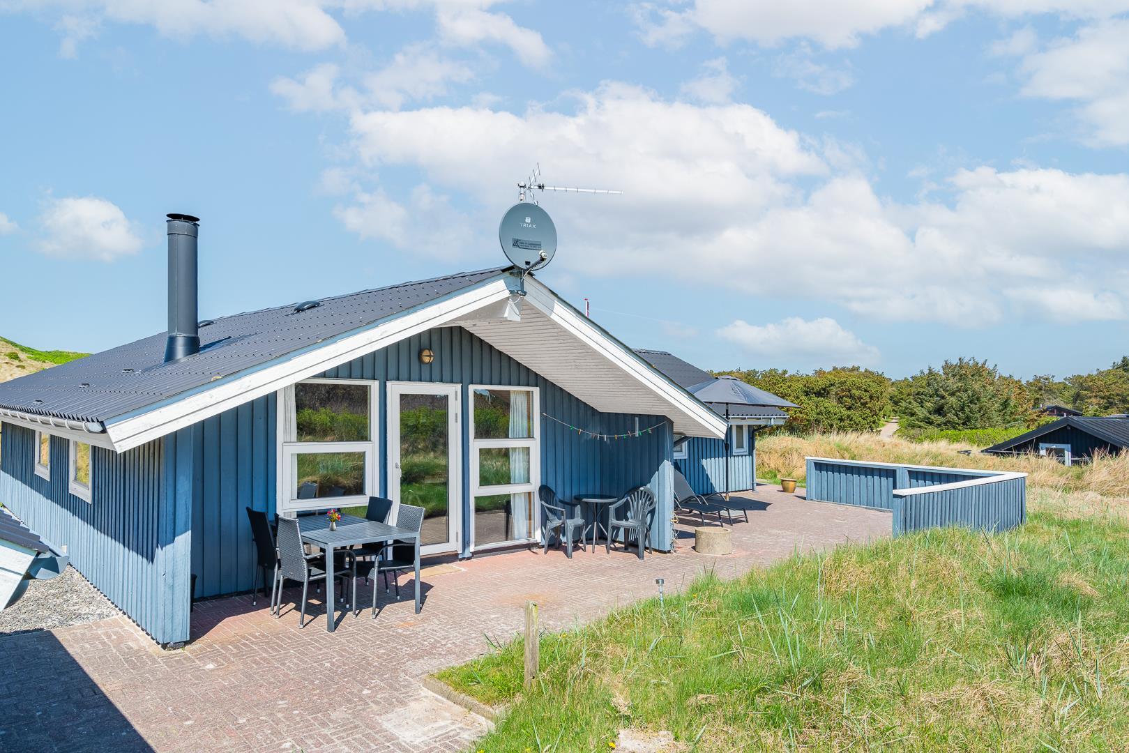 På en pragtfuld kuperet klitgrund tæt ved Henne Mølle Å og Vesterhavet ligger dette hyggelige og velholdte feriehus. Nyere badeværelser, hvoraf det ene er med spa og sauna. Stort køkken i åben forbindelse til rummelig stue. Herfra udgang til delvis overdækket, stor og ugenert terrasse hvorfra der er en flot udsigt over klitterne. Der forefindes en anneks/redskabsrum på grunden.