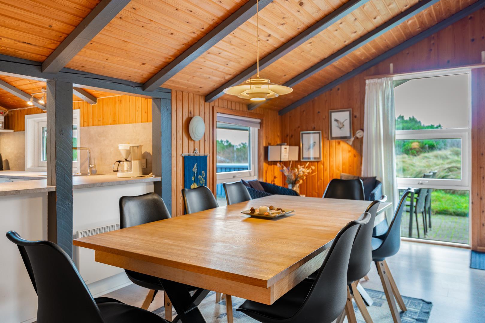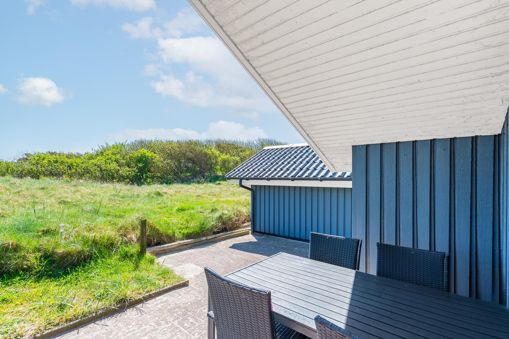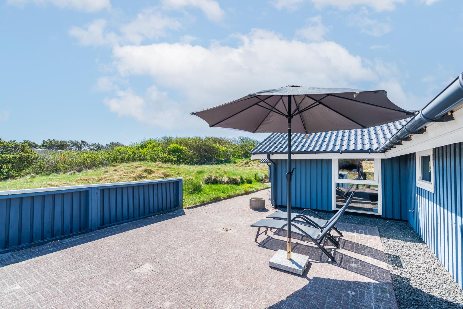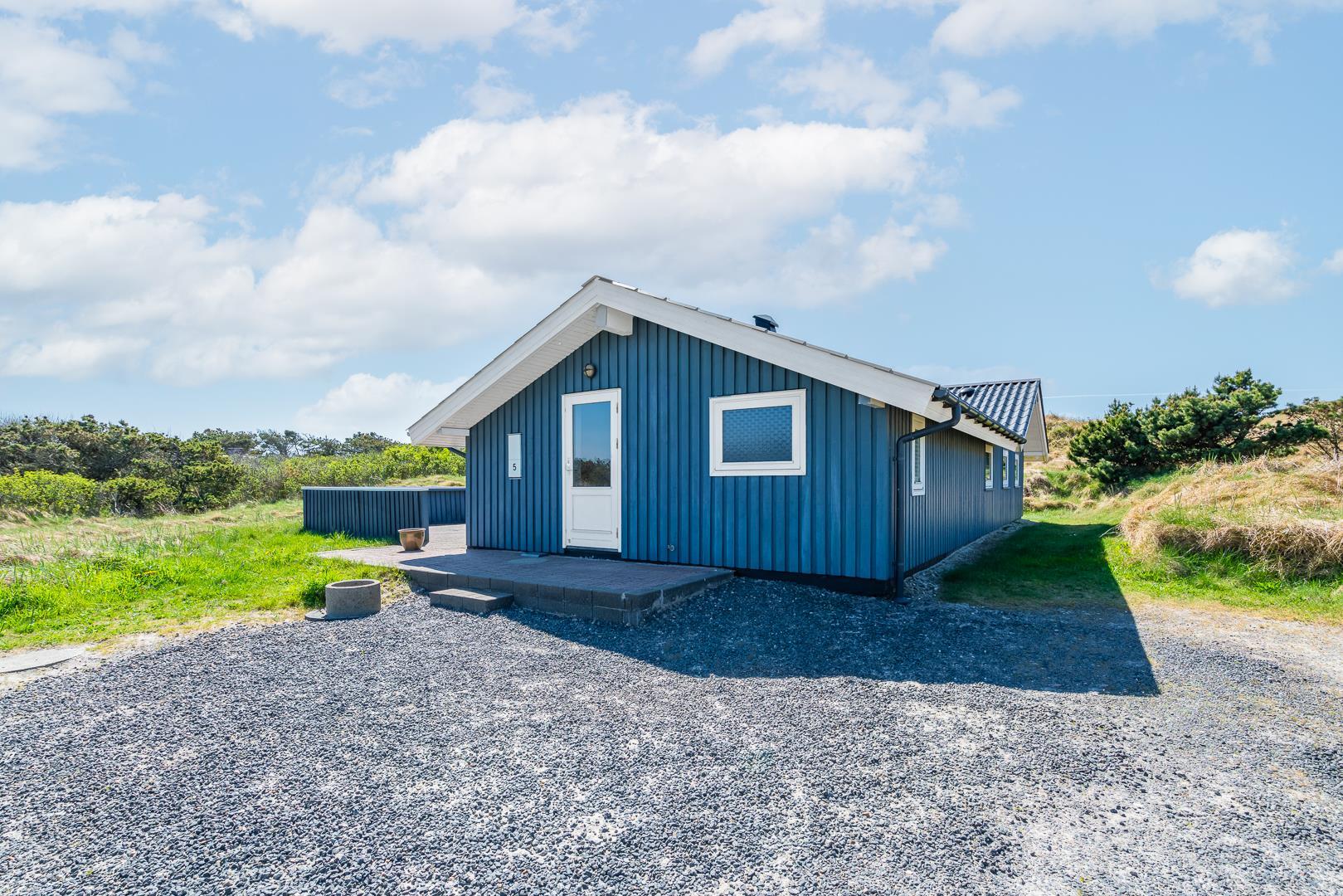 På en pragtfuld kuperet klitgrund tæt ved Henne Mølle Å og Vesterhavet ligger dette hyggelige og velholdte feriehus. Nyere badeværelser, hvoraf det ene er med spa og sauna. Stort køkken i åben forbindelse til rummelig stue. Herfra udgang til delvis overdækket, stor og ugenert terrasse hvorfra der er en flot udsigt over klitterne. Der forefindes en anneks/redskabsrum på grunden.