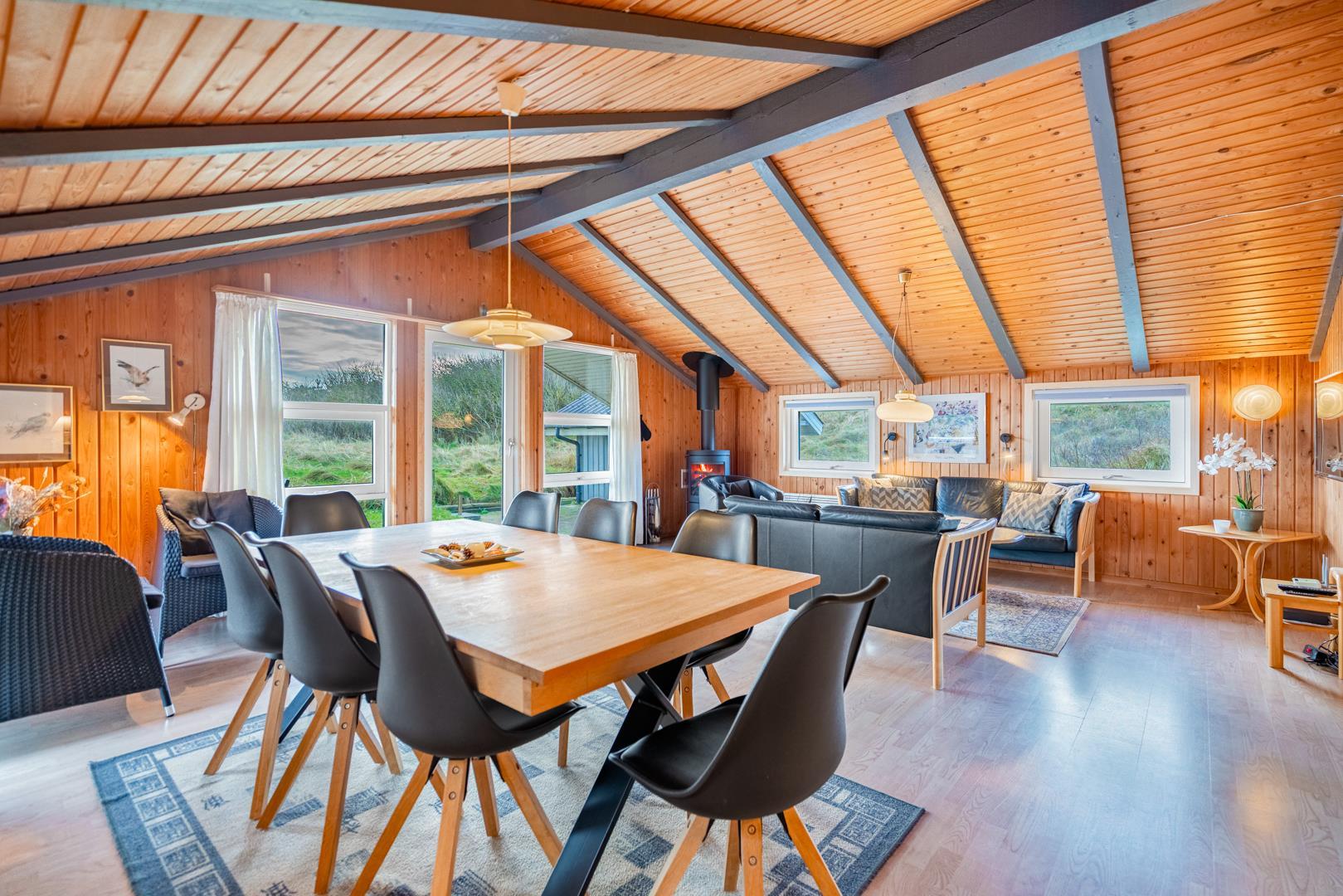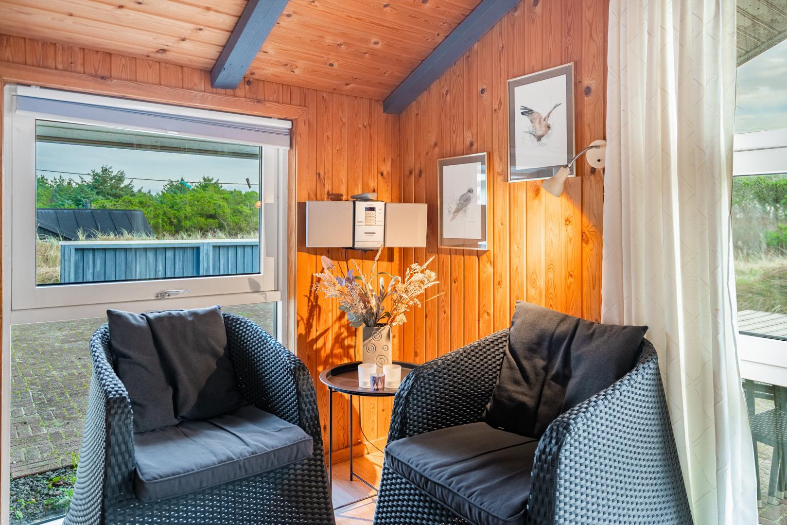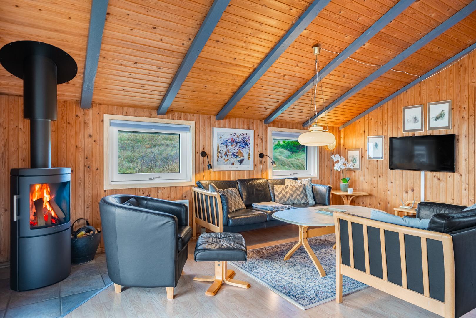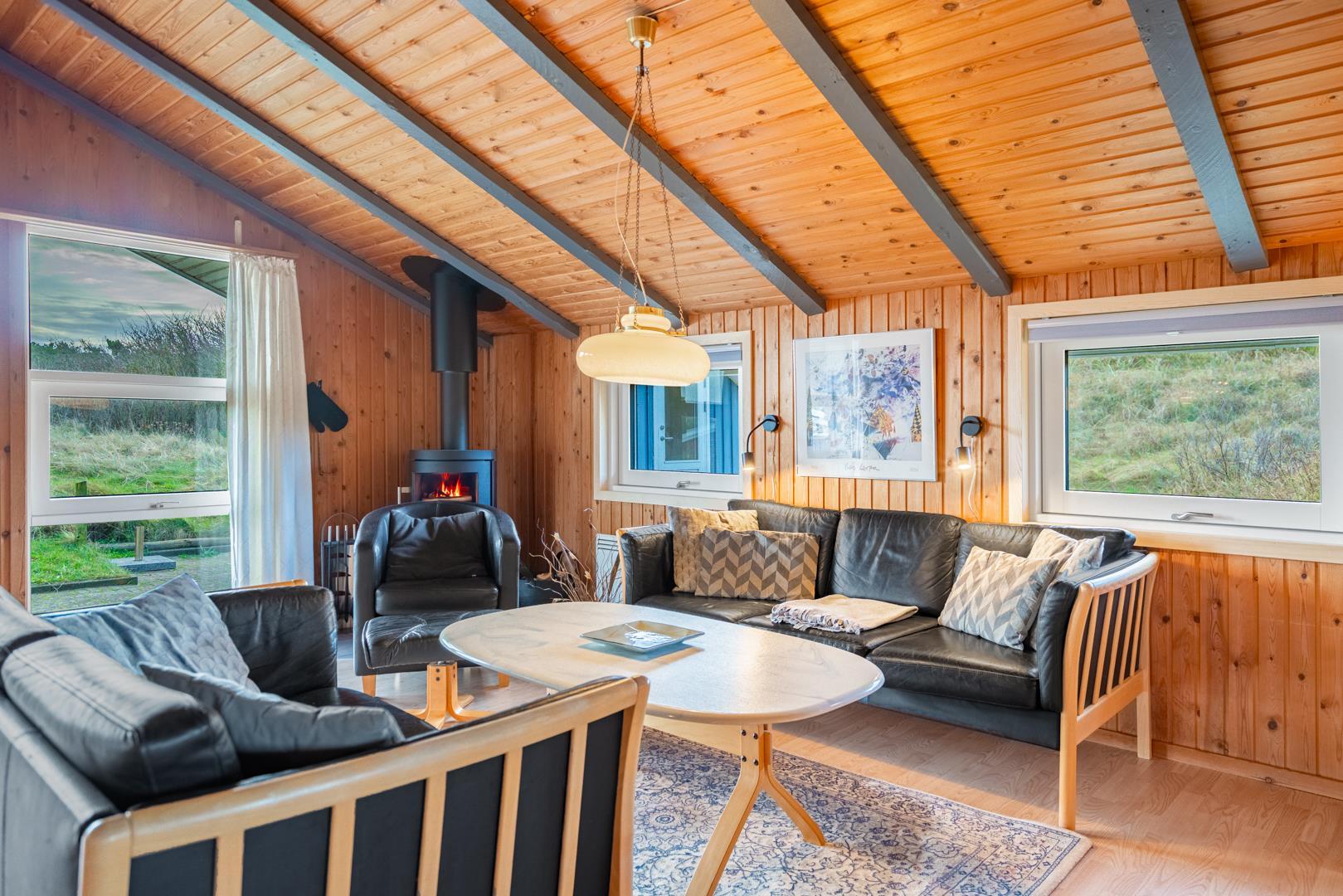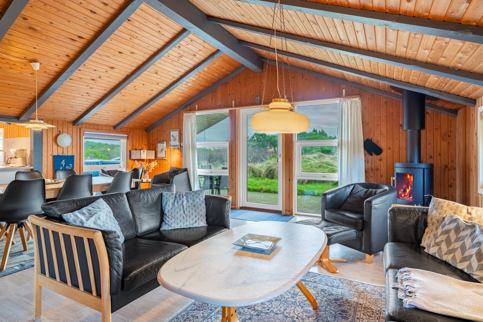 På en pragtfuld kuperet klitgrund tæt ved Henne Mølle Å og Vesterhavet ligger dette hyggelige og velholdte feriehus. Nyere badeværelser, hvoraf det ene er med spa og sauna. Stort køkken i åben forbindelse til rummelig stue. Herfra udgang til delvis overdækket, stor og ugenert terrasse hvorfra der er en flot udsigt over klitterne. Der forefindes en anneks/redskabsrum på grunden.