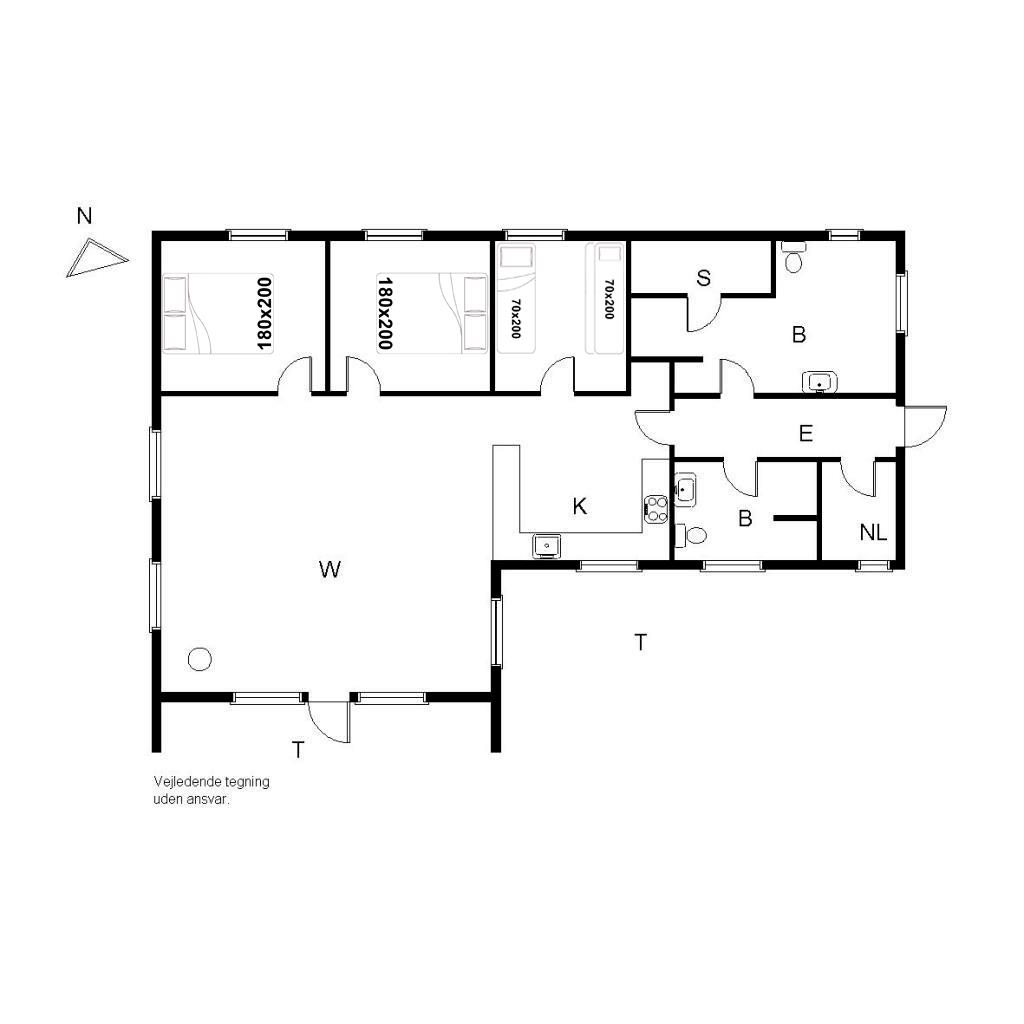 Sengestørrelse: 2 dobbeltsenge 180 x 200 cm (1 topmadras) + 1 enkeltseng 70 x 200 cm + 1 køjeseng 70 x 200 cm.