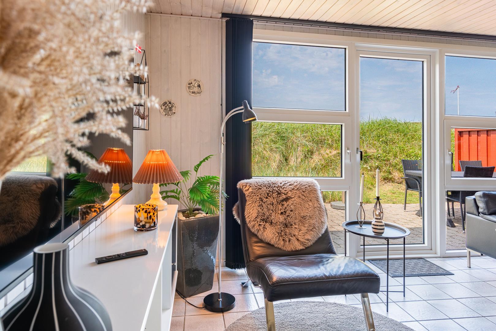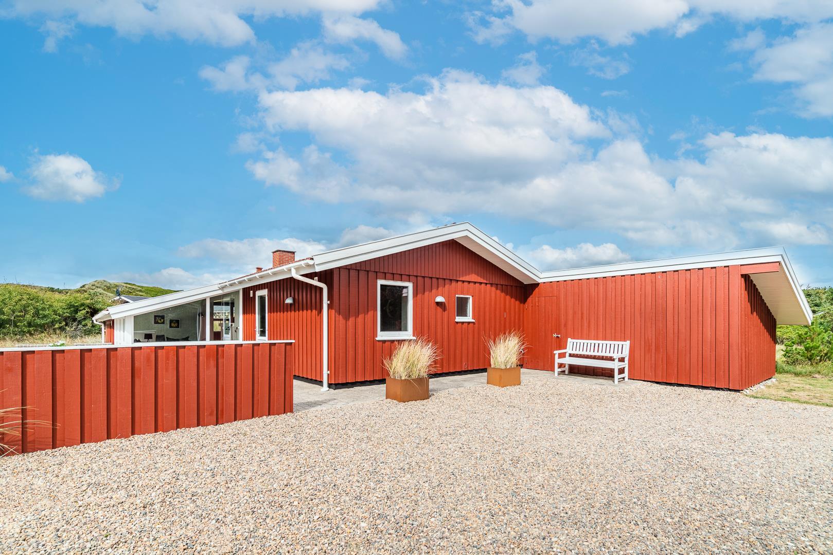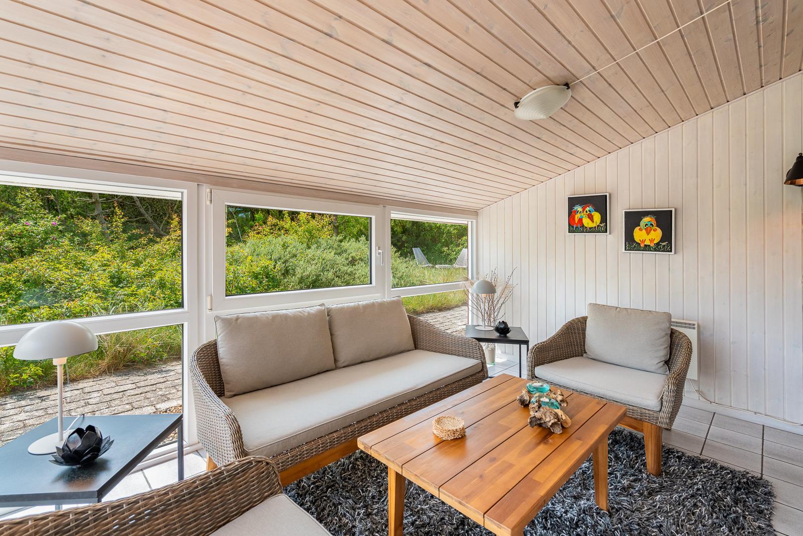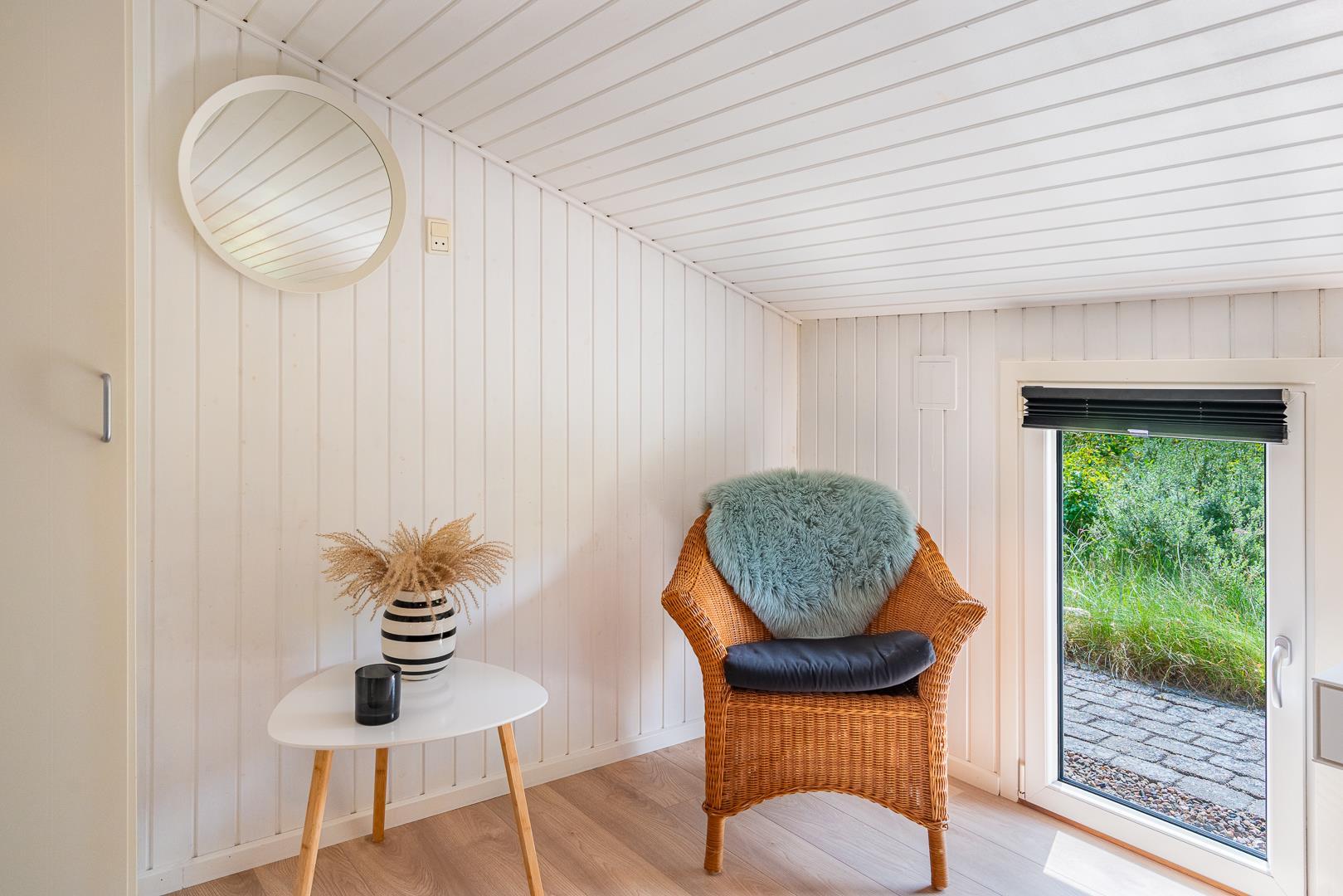 Yderligere faciliteter inkluderer en fin entré med vaskemaskine og en dejlig udestue, hvor du har rig mulighed for at nyde udsigten til den omkringliggende natur med en god kop kaffe. I udestuen er der også god plads til at konkurrere i familiespil eller fordybe sig i en god bog i rolige omgivelser. Men en terrasse der inviterer til afslapning under åben himmel tæt på naturen, skaber dette sommerhus den perfekte ramme for en mindeværdig ferie året rundt ved Henne Strand.Parkering med autocamper på grunden ikke tilladt.