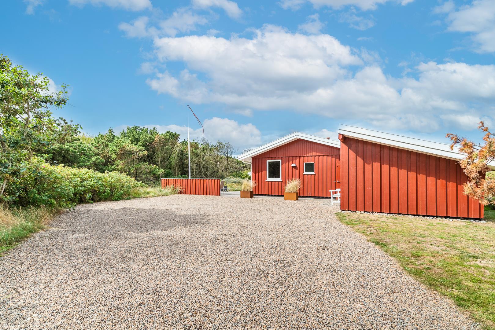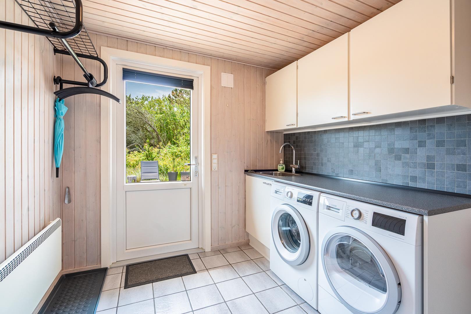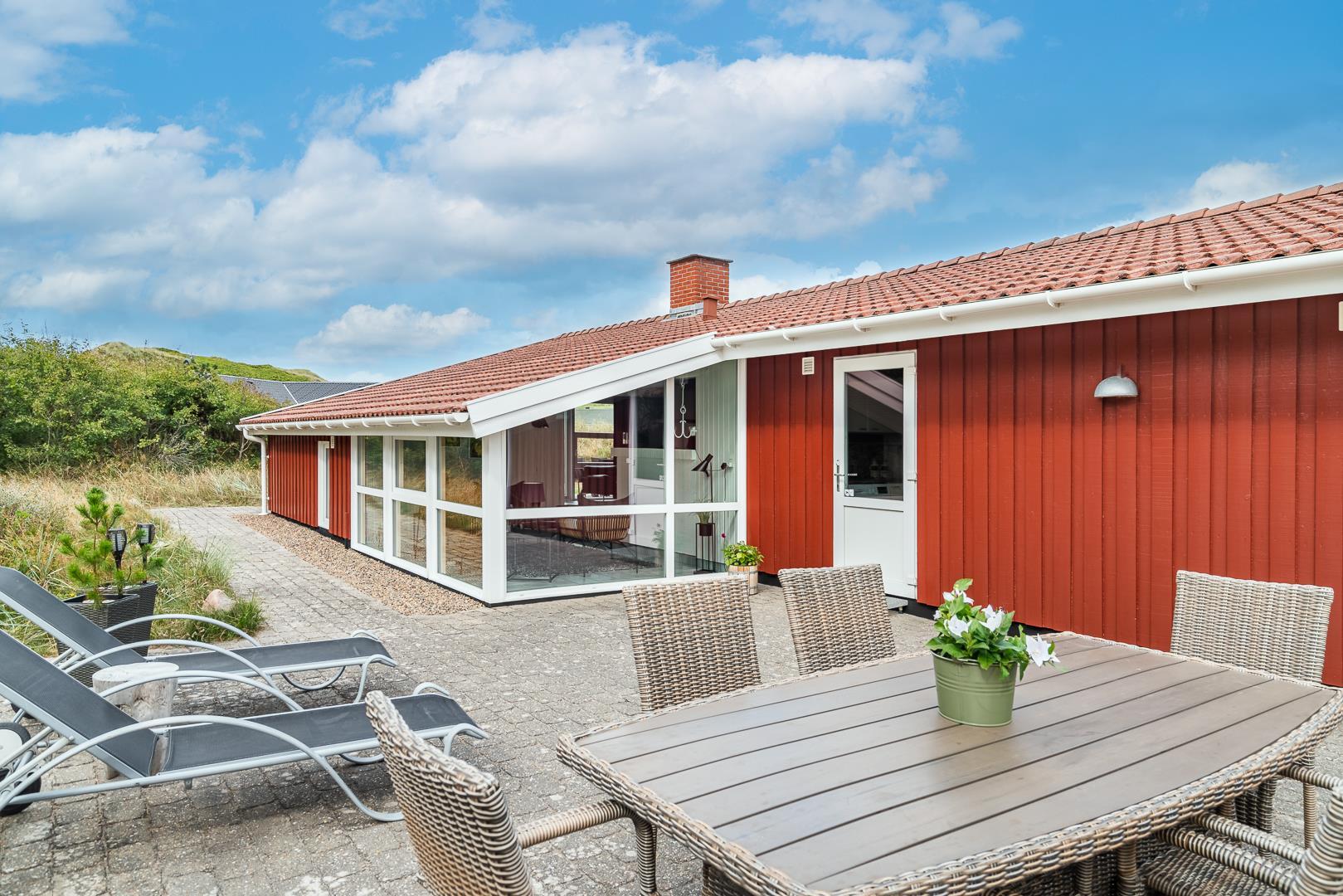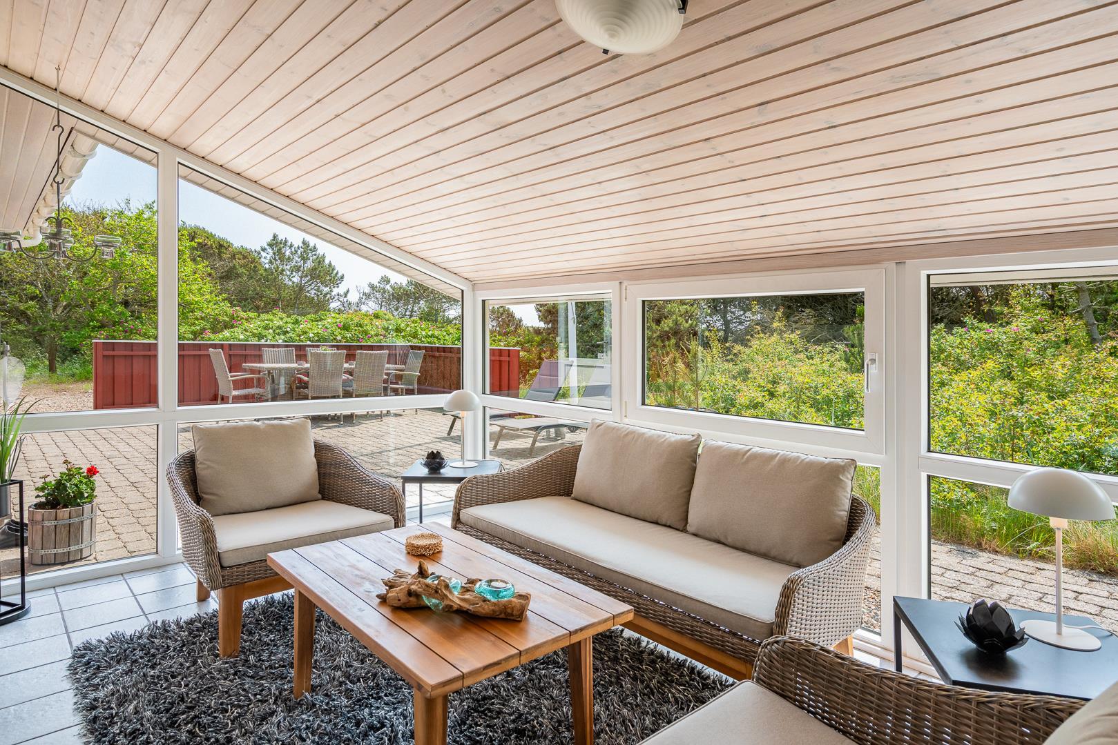 Yderligere faciliteter inkluderer en fin entré med vaskemaskine og en dejlig udestue, hvor du har rig mulighed for at nyde udsigten til den omkringliggende natur med en god kop kaffe. I udestuen er der også god plads til at konkurrere i familiespil eller fordybe sig i en god bog i rolige omgivelser. Men en terrasse der inviterer til afslapning under åben himmel tæt på naturen, skaber dette sommerhus den perfekte ramme for en mindeværdig ferie året rundt ved Henne Strand.Parkering med autocamper på grunden ikke tilladt.