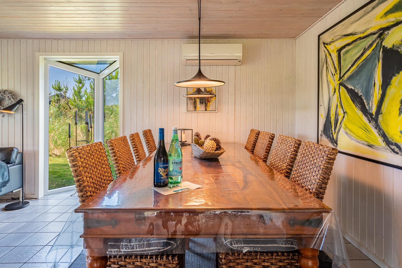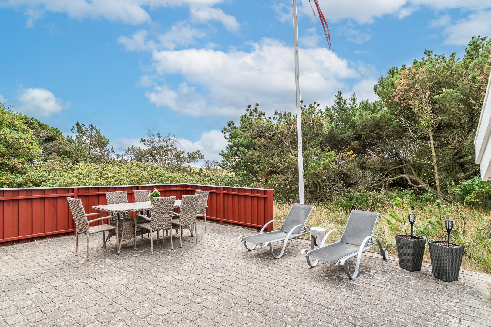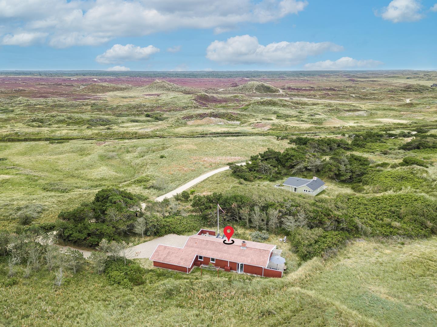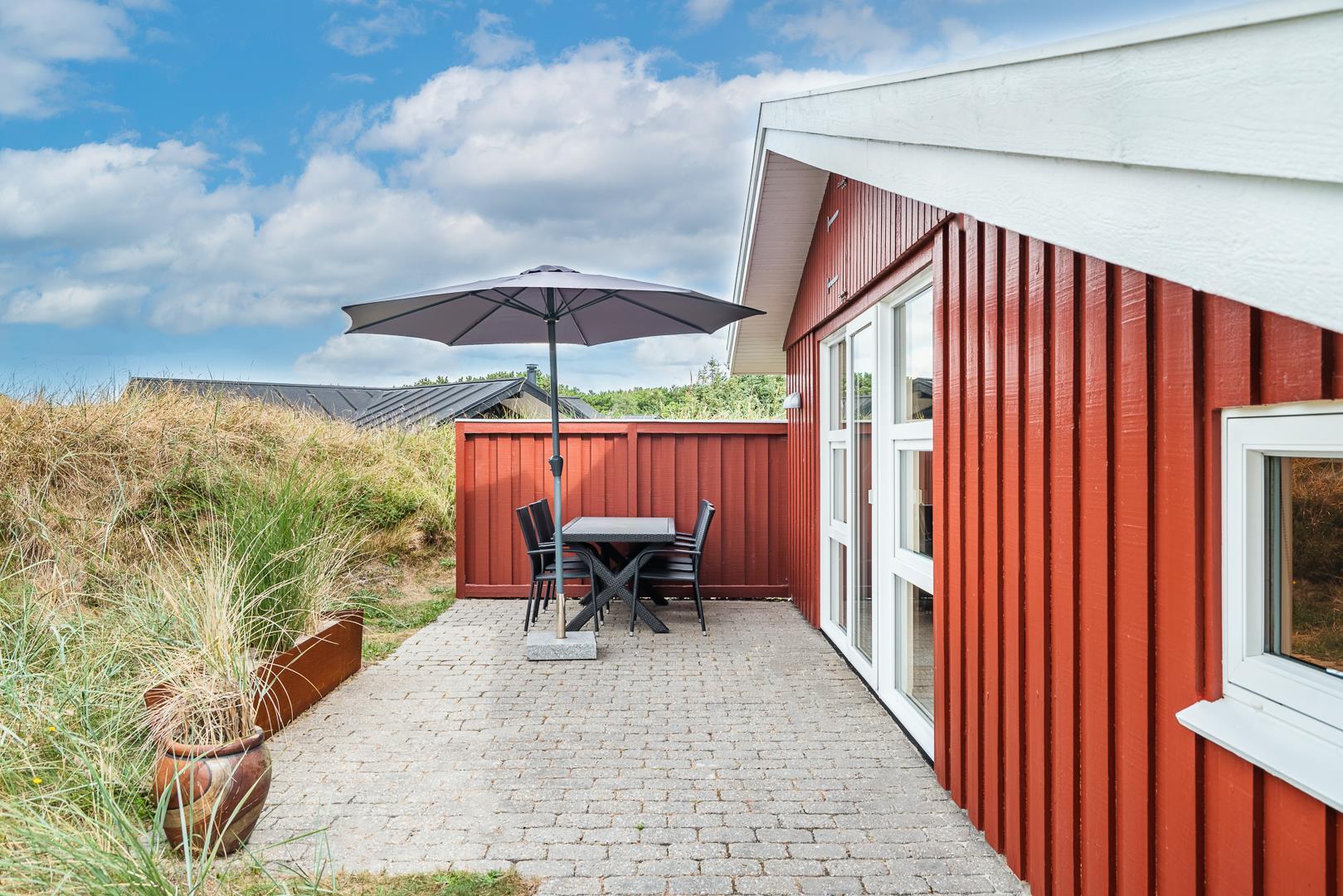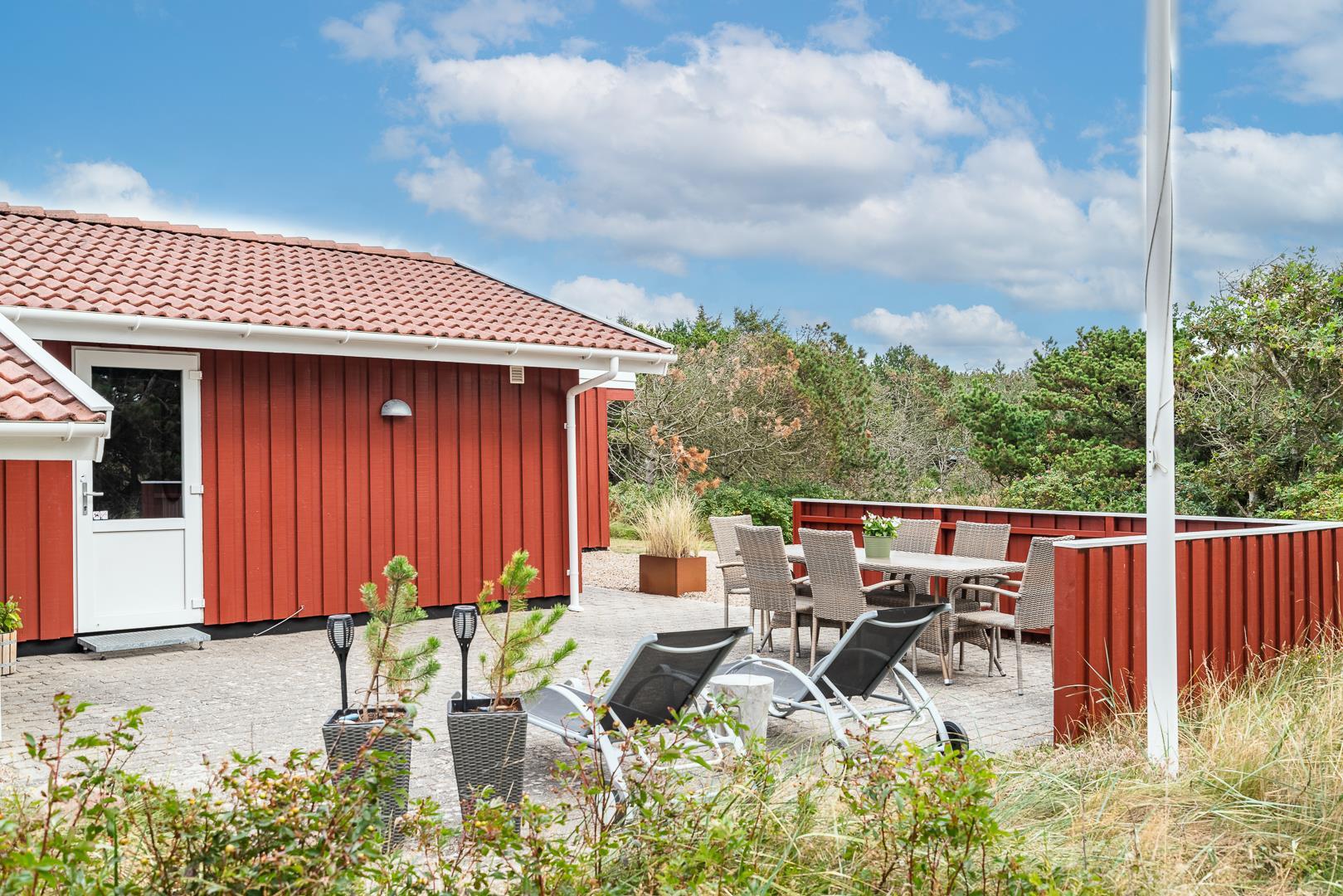 Yderligere faciliteter inkluderer en fin entré med vaskemaskine og en dejlig udestue, hvor du har rig mulighed for at nyde udsigten til den omkringliggende natur med en god kop kaffe. I udestuen er der også god plads til at konkurrere i familiespil eller fordybe sig i en god bog i rolige omgivelser. Men en terrasse der inviterer til afslapning under åben himmel tæt på naturen, skaber dette sommerhus den perfekte ramme for en mindeværdig ferie året rundt ved Henne Strand.Parkering med autocamper på grunden ikke tilladt.