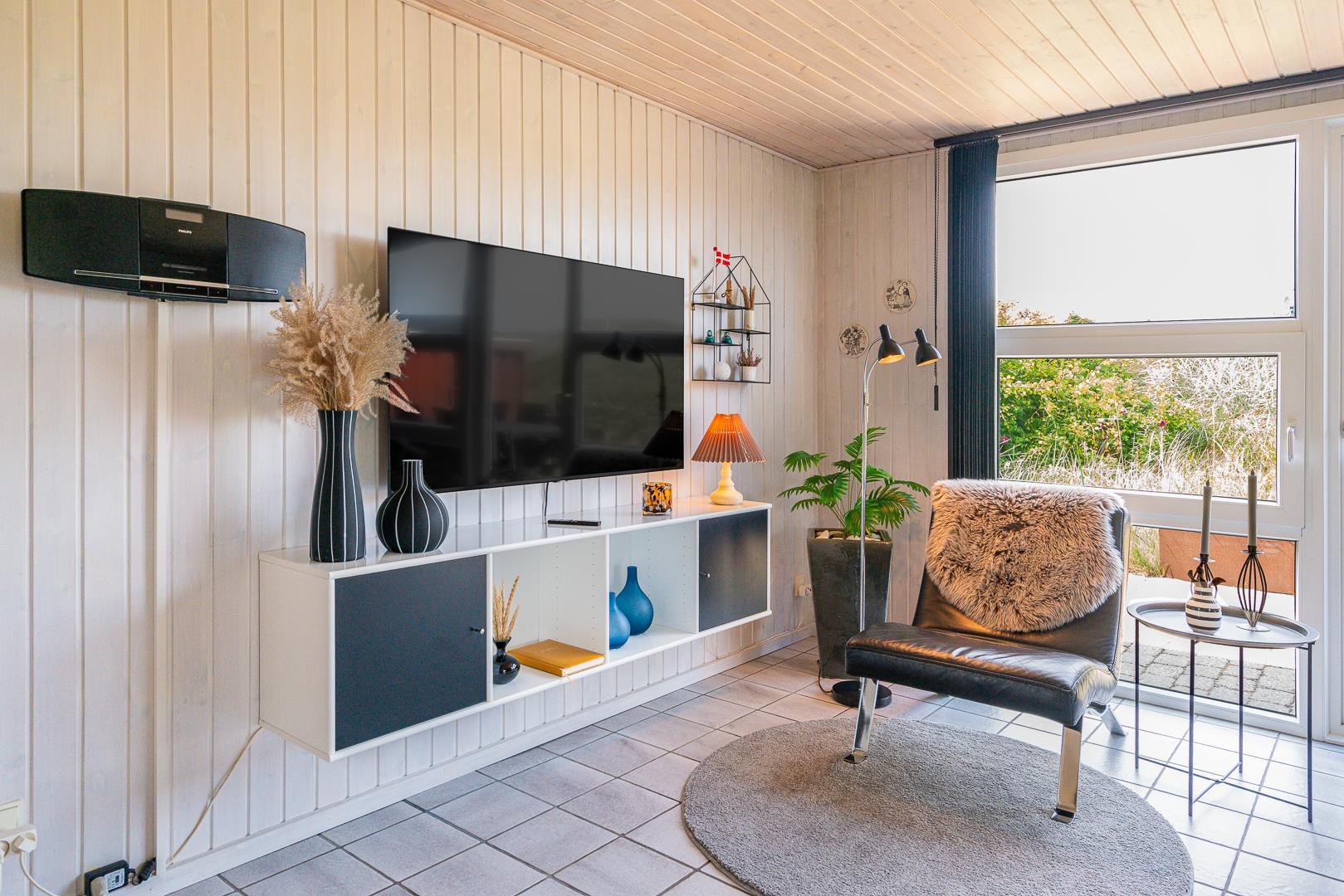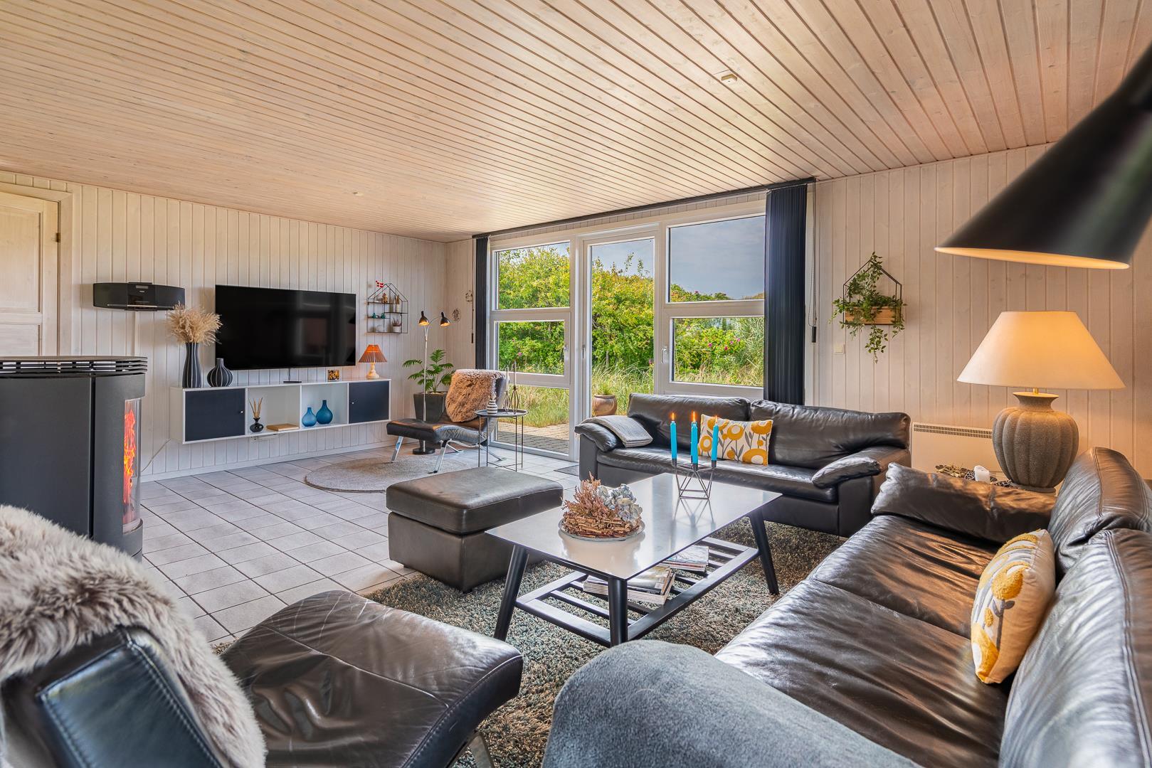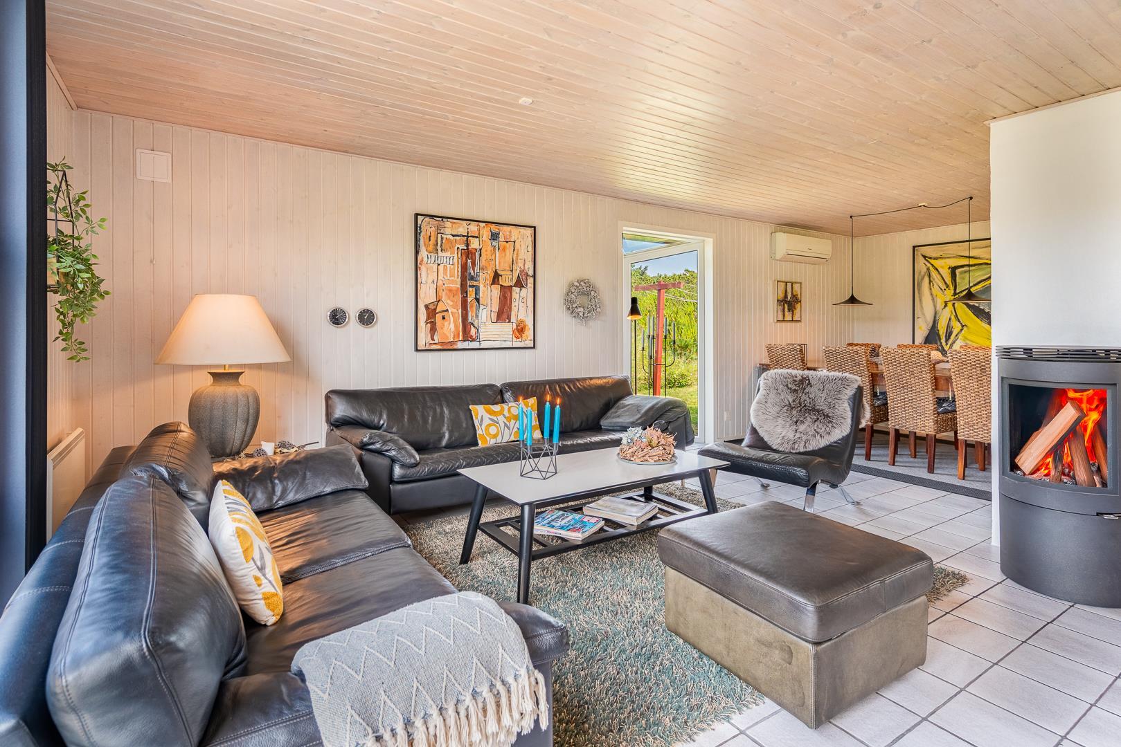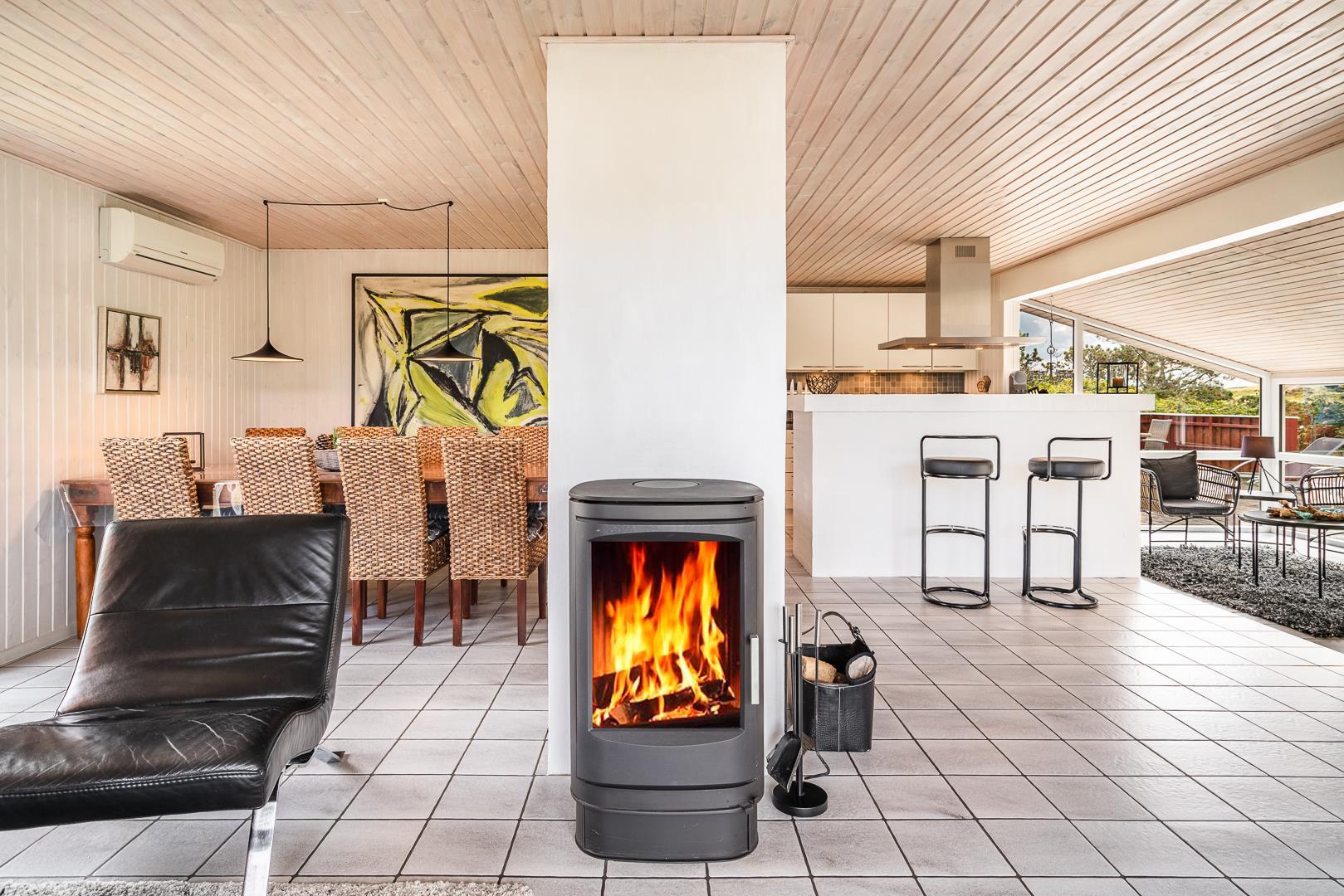 Det åbne køkken/alrum er godt integreret med den hyggelige stue, hvor brændeovnen tilføjer en dejlig atmosfære midt i rummet, samt smart TV 55 tommer.