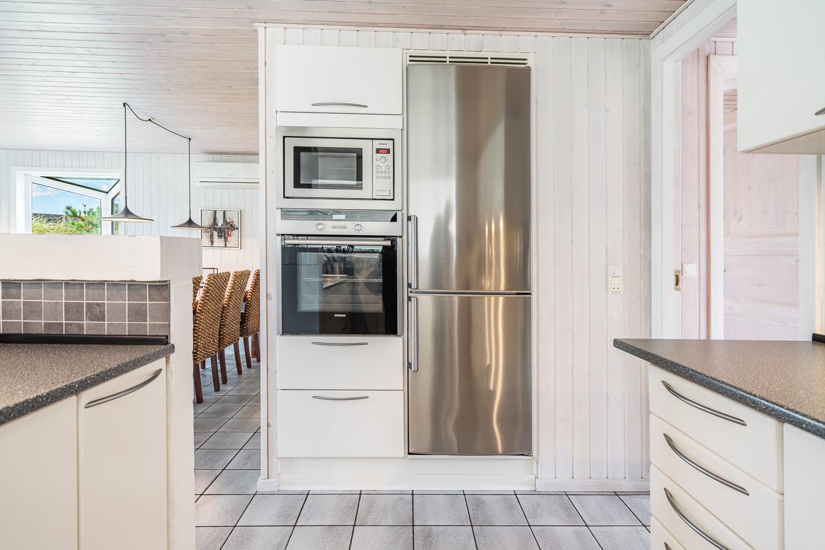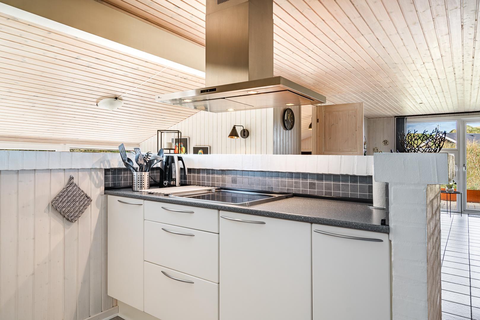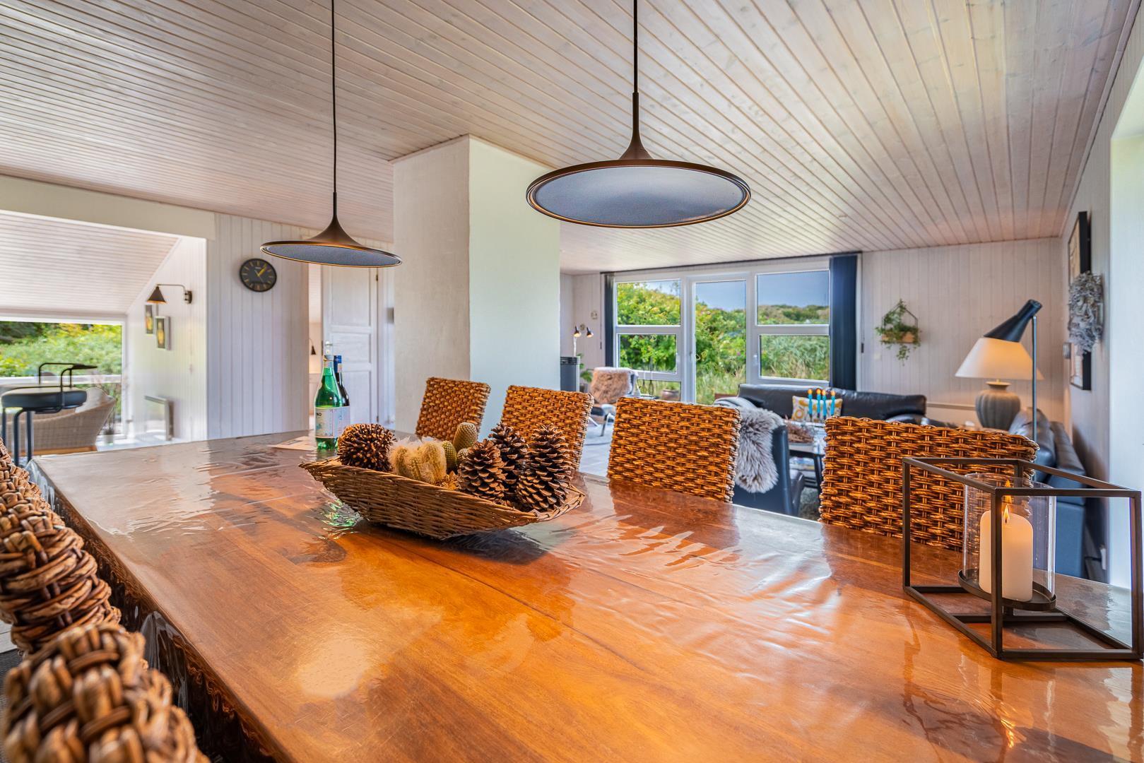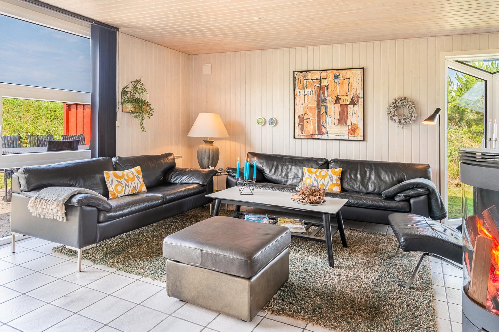 Det åbne køkken/alrum er godt integreret med den hyggelige stue, hvor brændeovnen tilføjer en dejlig atmosfære midt i rummet, samt smart TV 55 tommer.