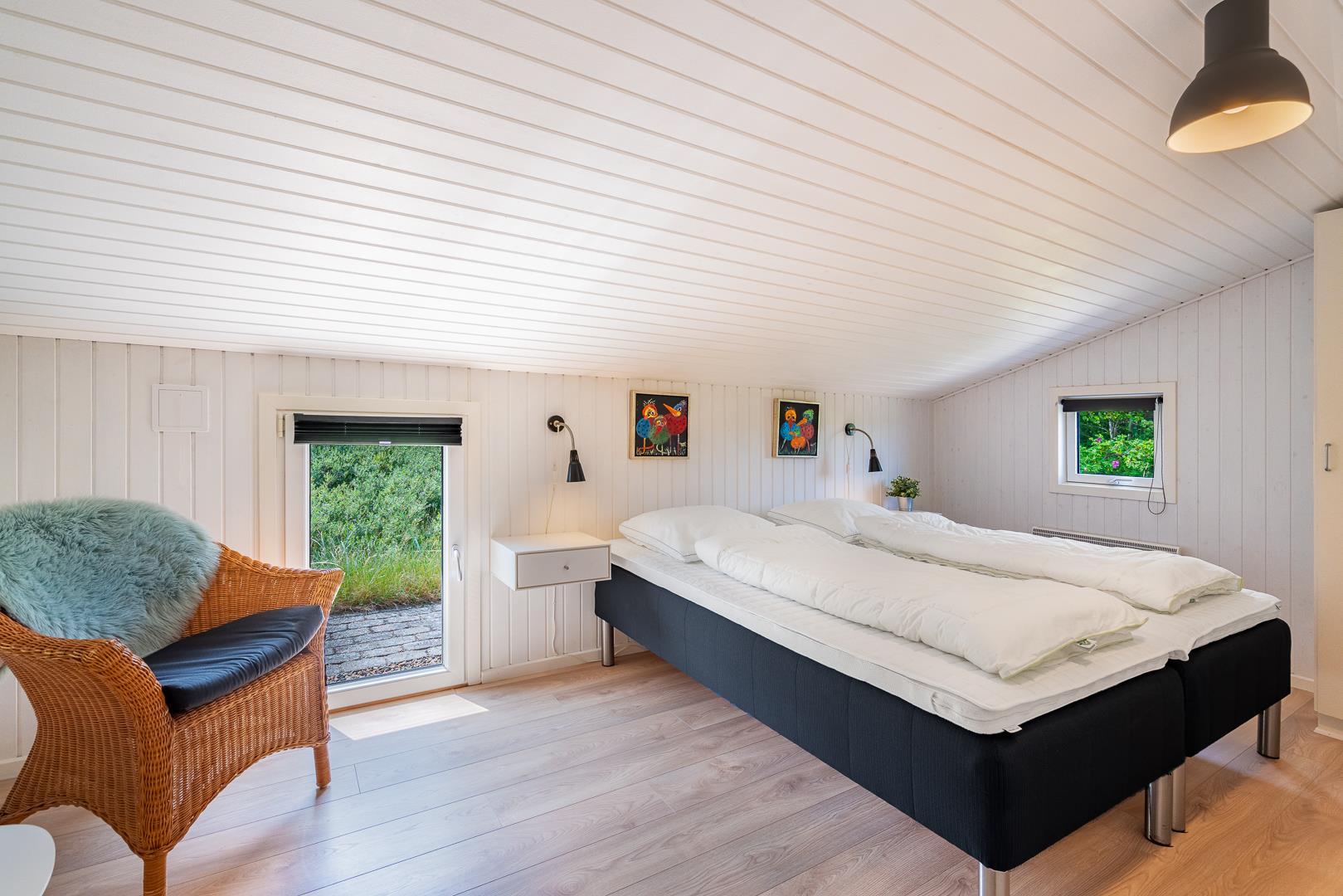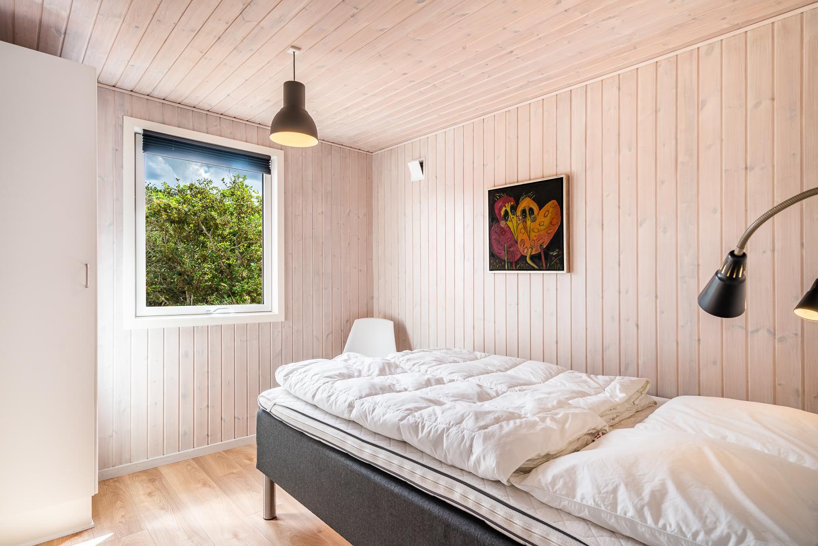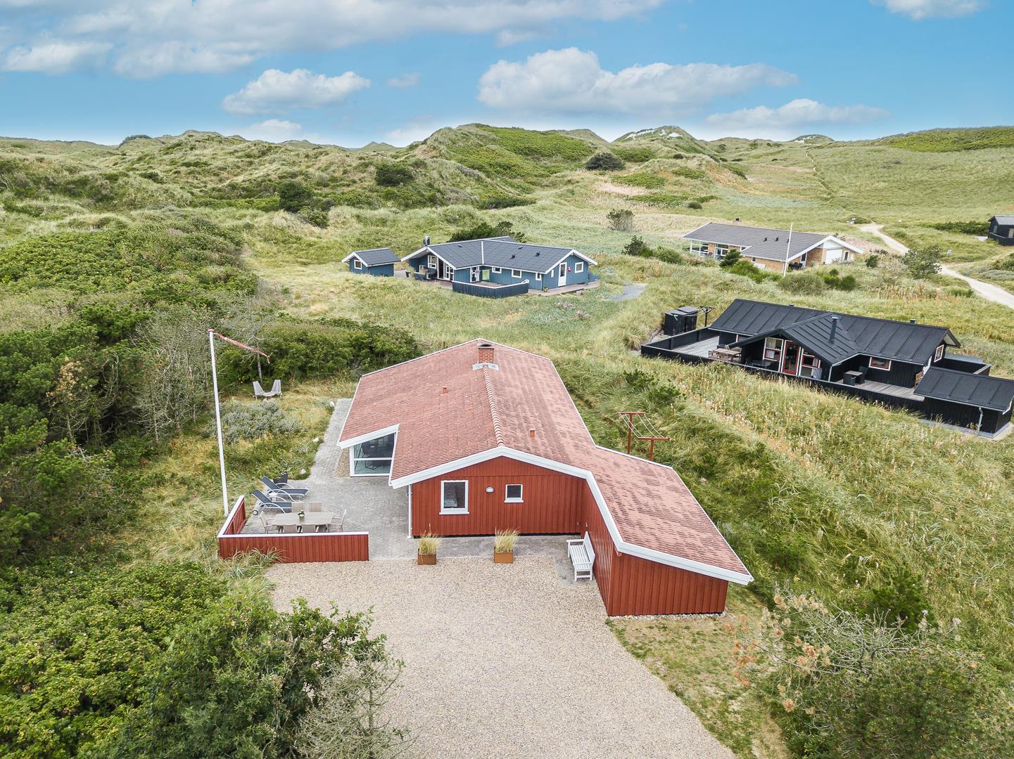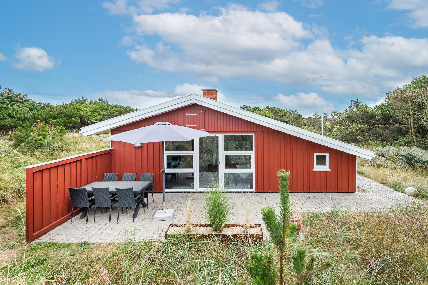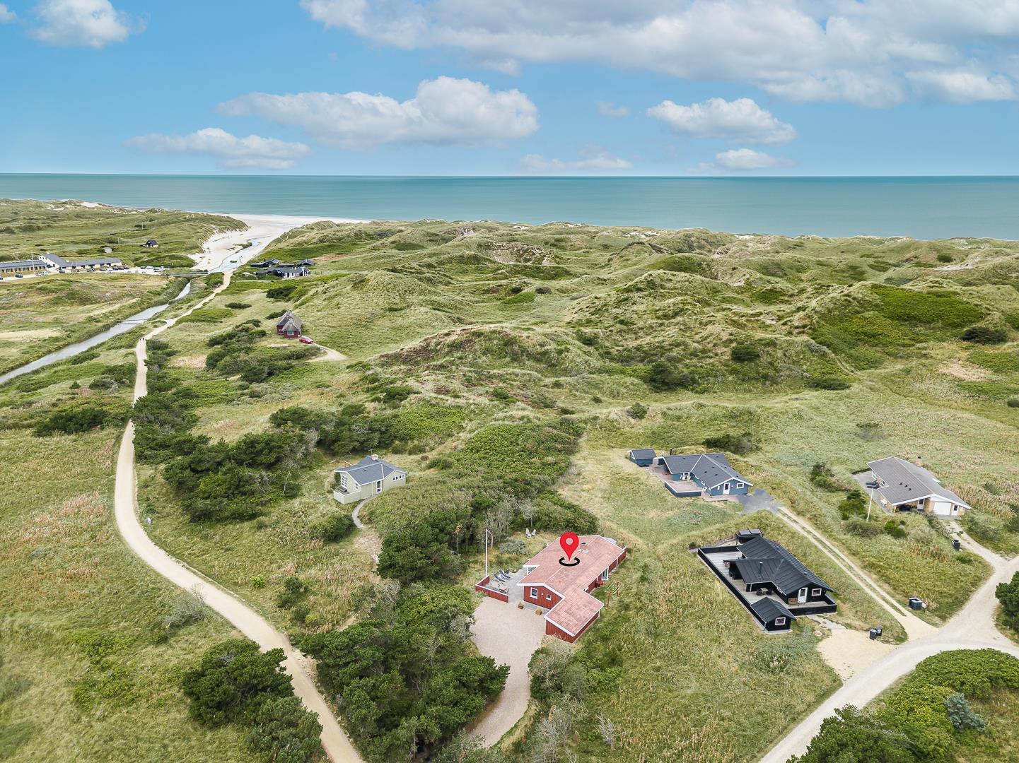Sommerhuset ligger rigtig dejligt, omgivet af en smuk og privat naturgrund, kun få hundrede meter fra Vesterhavet og grænser op til et fredet område. Her er virkelig skønt! I feriehuset er her plads til 6 personer med 3 veludstyrede soveværelser og et lækkert, moderniseret badeværelse, der inviterer til afslapning med spa og direkte adgang til saunaen.