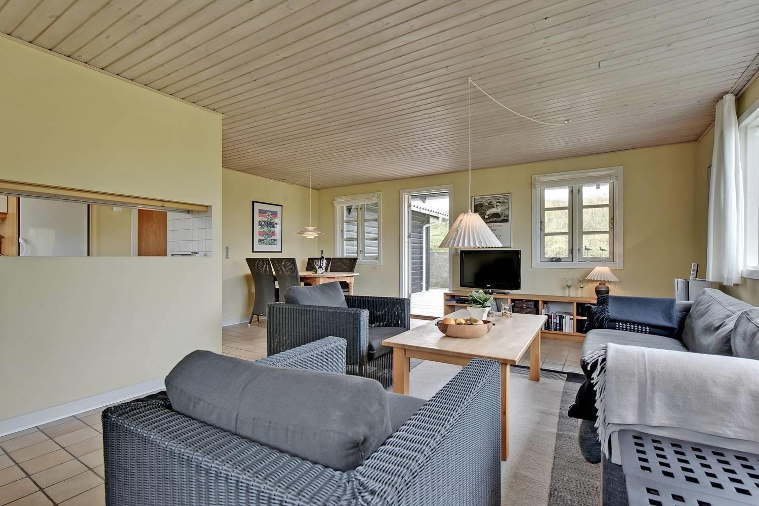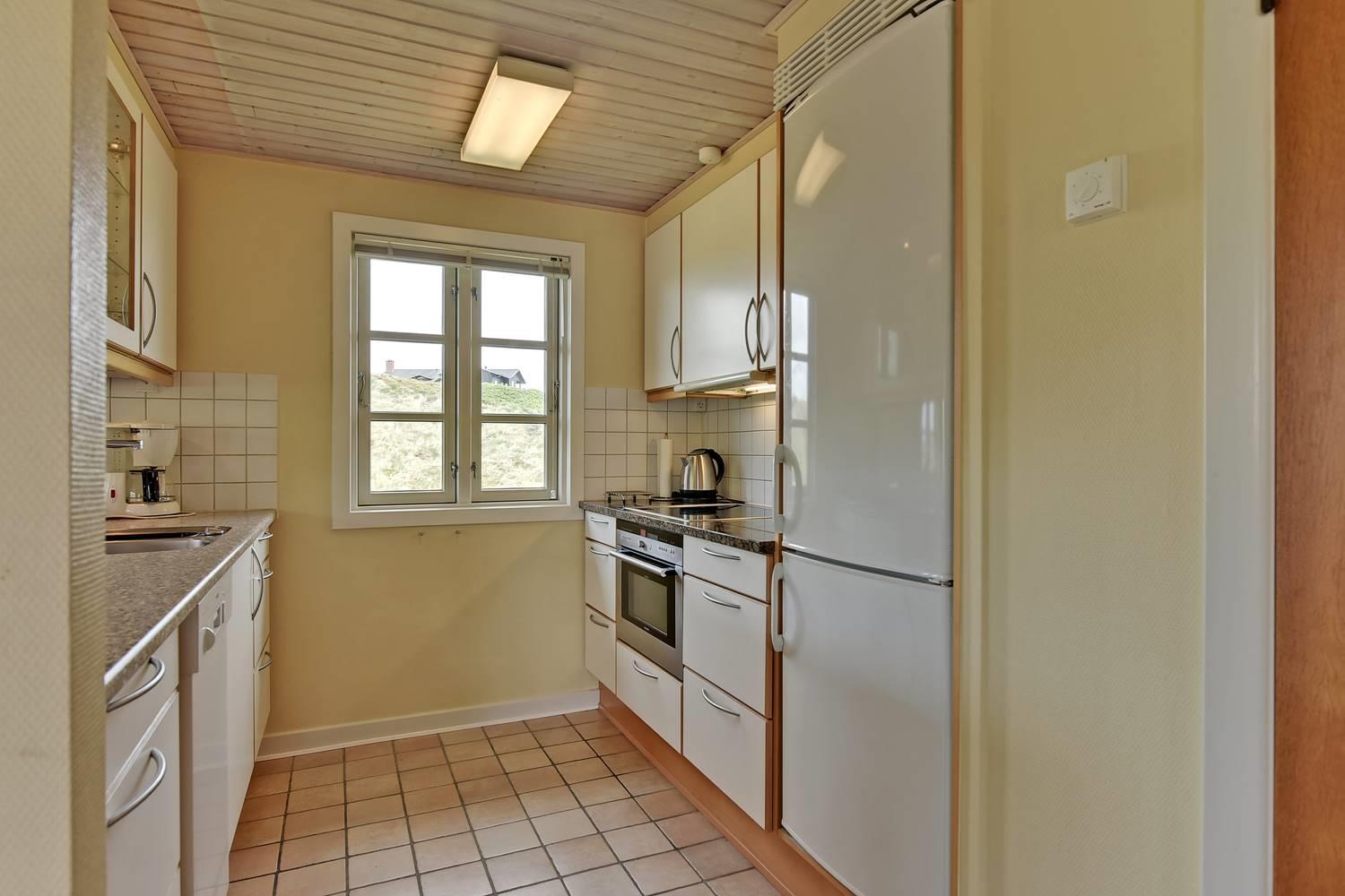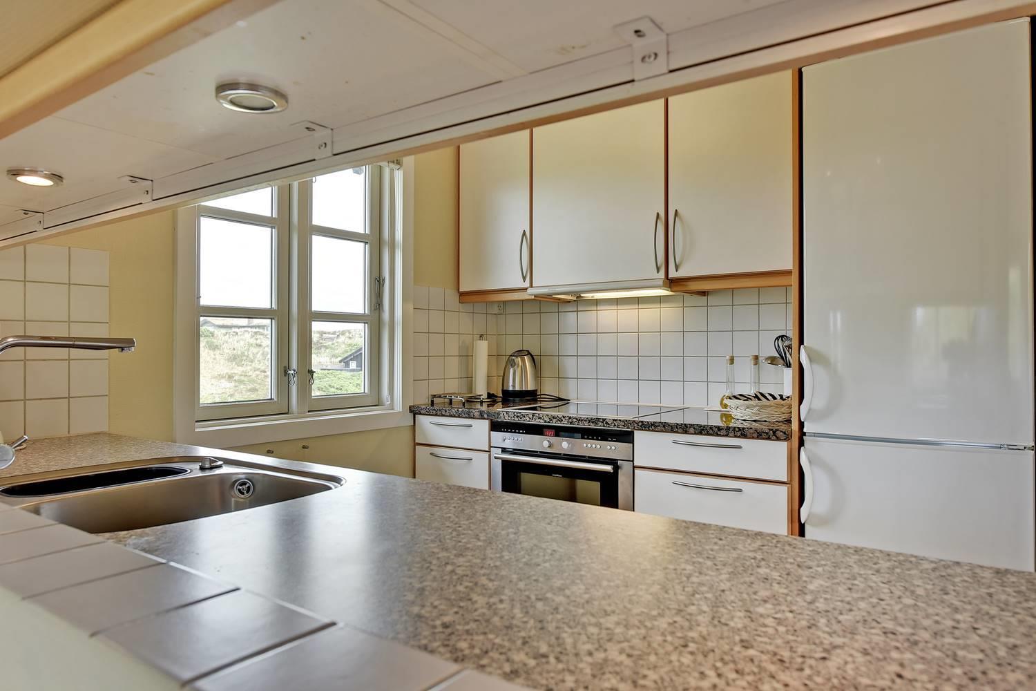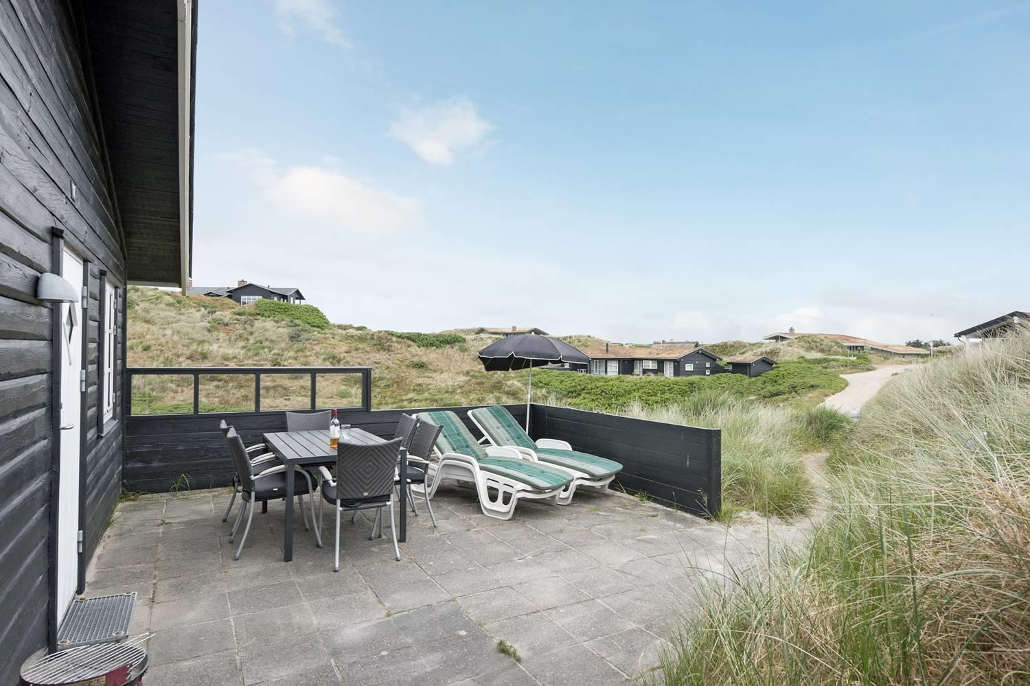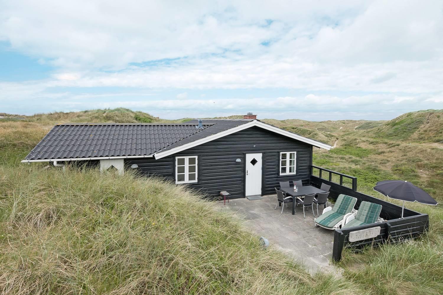 På en fantastisk højtliggende klitgrund med pragtfuld udsigt over stort klitområde og helt for sig selv ligger dette lyst og velindrettede feriehus. Feriehuset er flot møbleret og fremstår overalt lyst og venligt. Flot køkken som ligger i åben forbindelse med stuen med brændeovn. Dejligt badeværelse med adgang til sauna. Her er virkeligt et feriehus som emmer af hygge. På grunden er der trappe opgang til mindre udkigs post, hvor den unikke udsigt kan nydes.