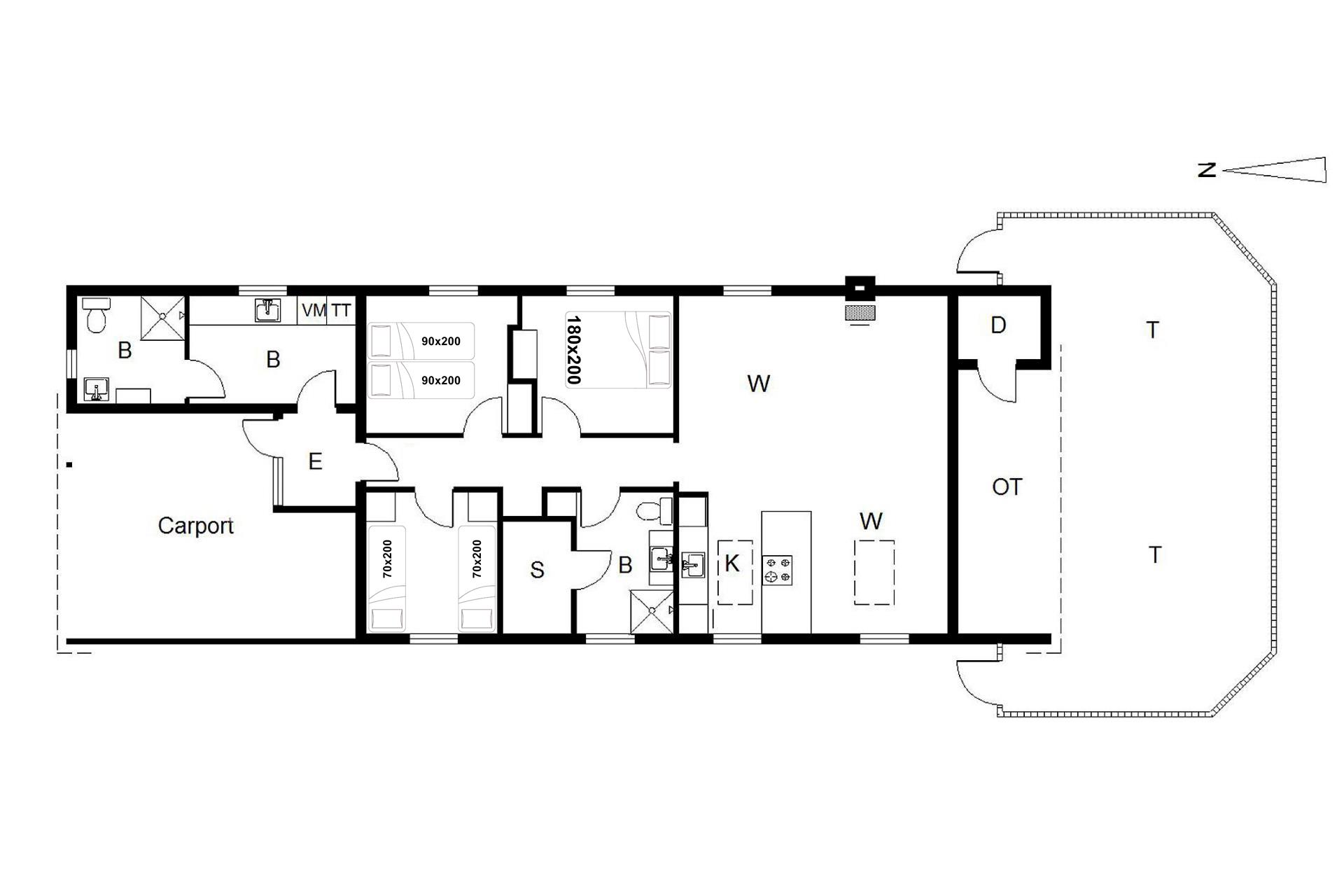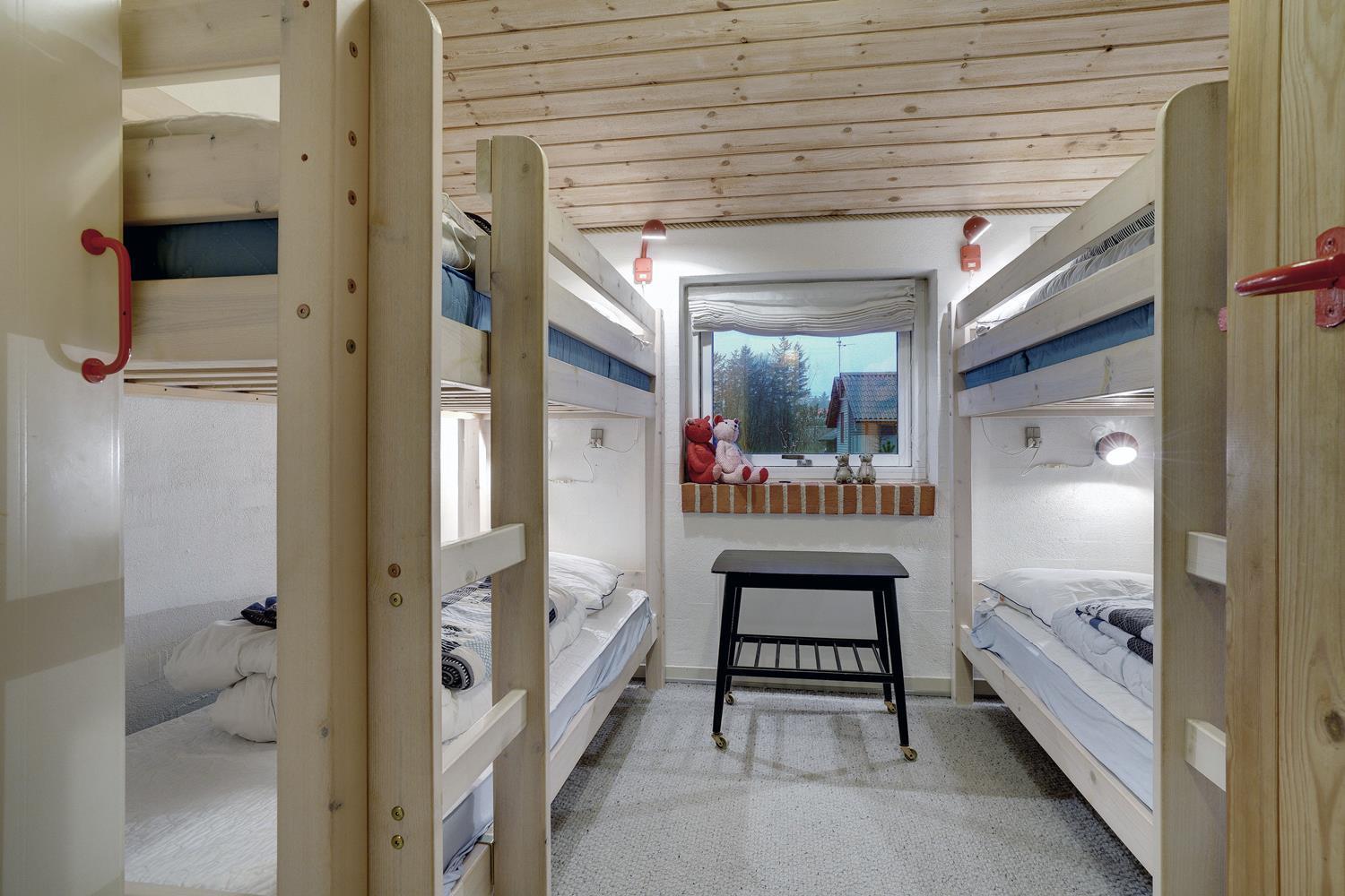 Sengestørrelse: 1 dobbeltseng med 2 madrasser 90 x 200 cm + 1 dobbeltseng 180 x 200 cm + 2 enkeltsenge 70 x 200 cm.