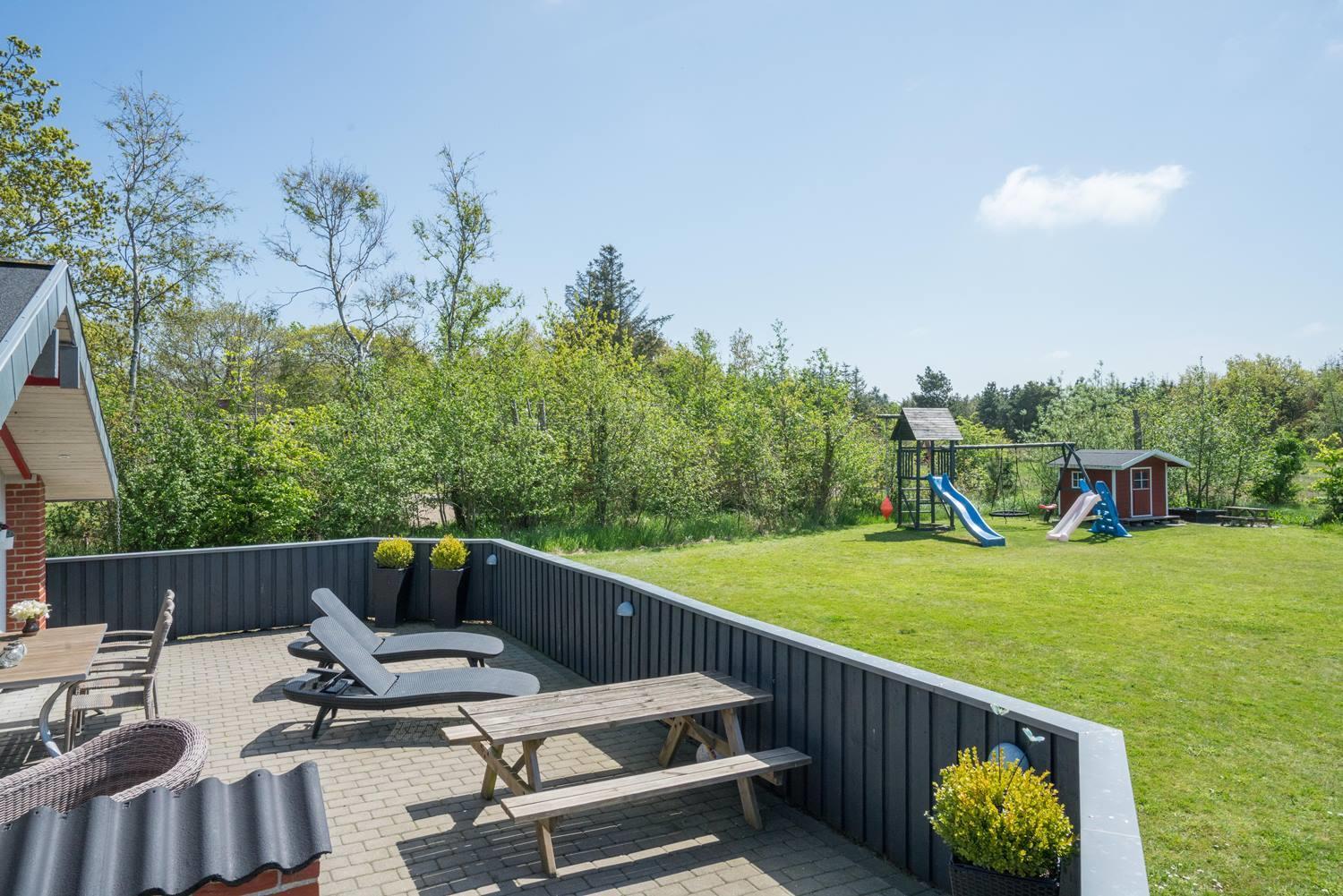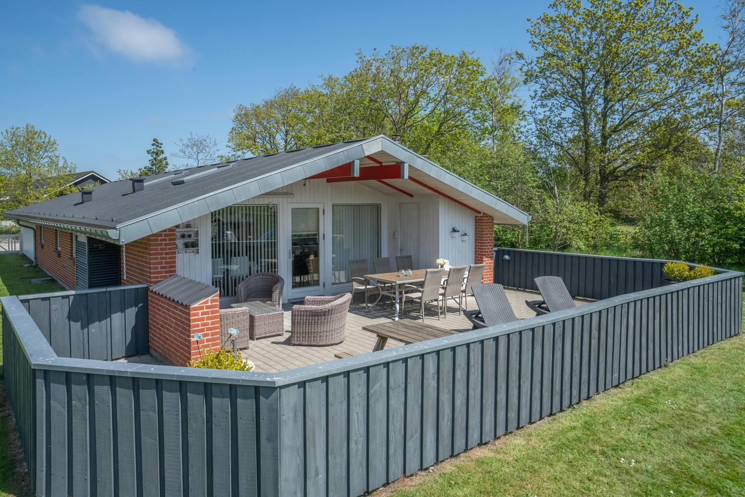 Hyggeligt feriehus med sauna, lukket grund og overdækket terrasse nær Henne Strand.