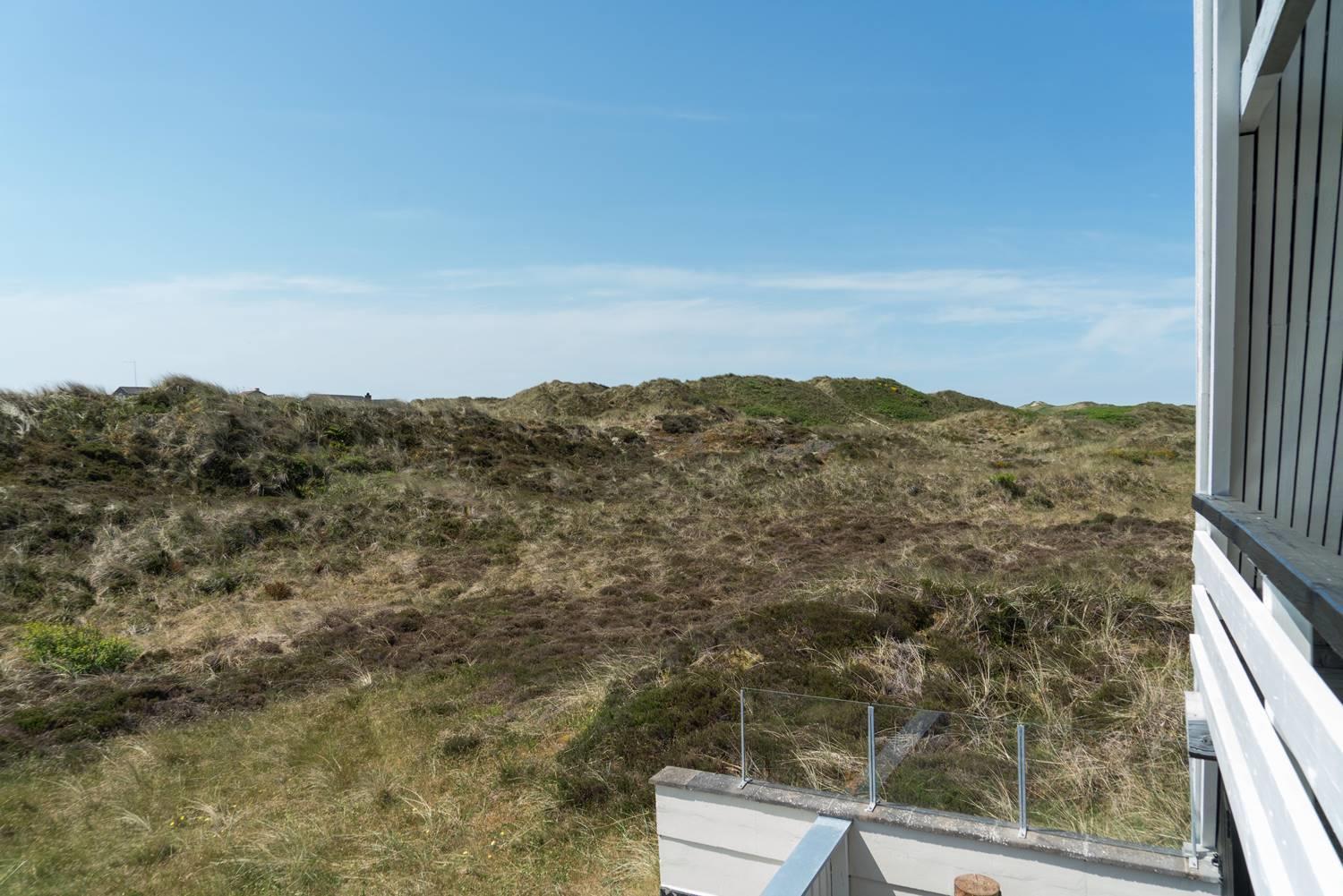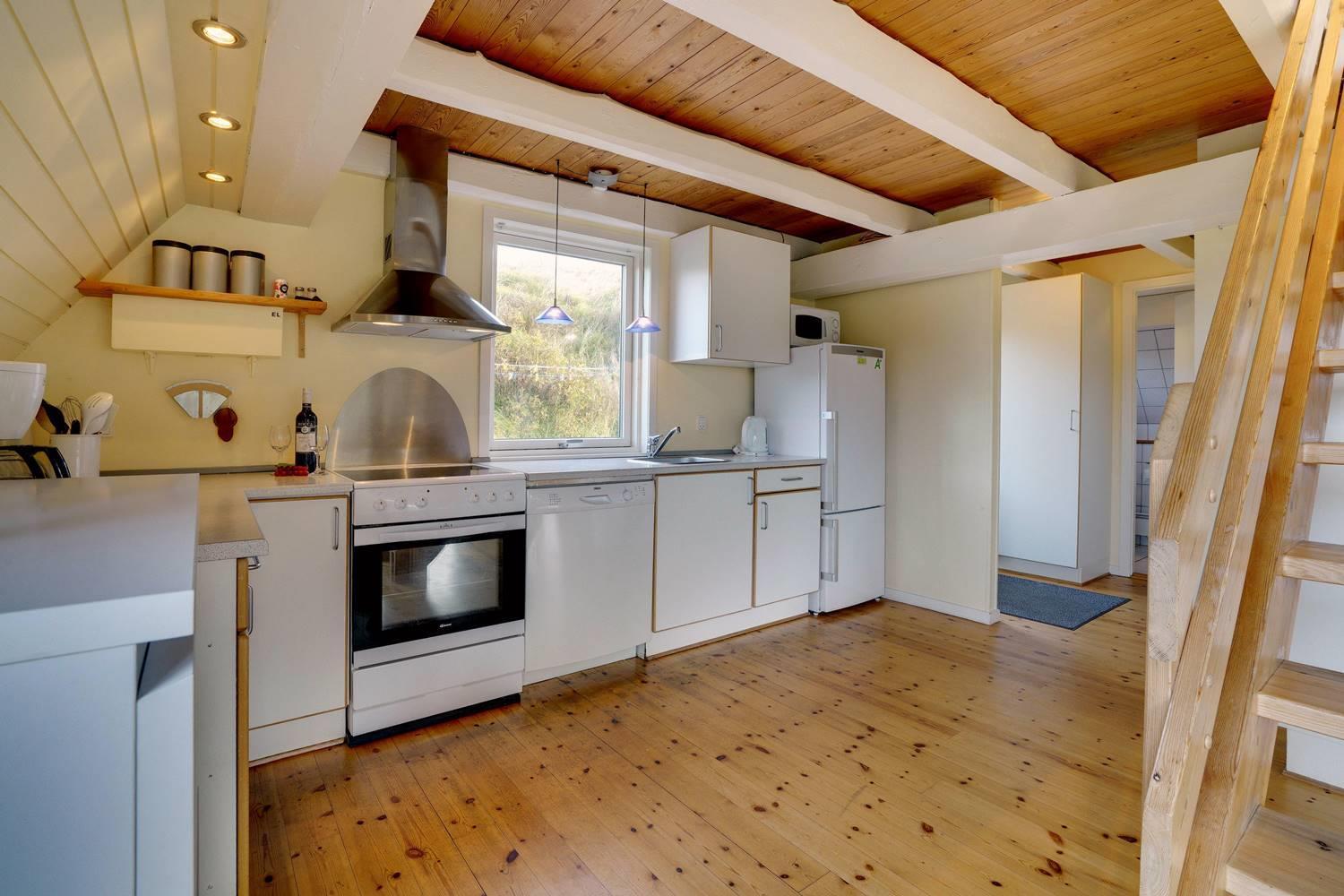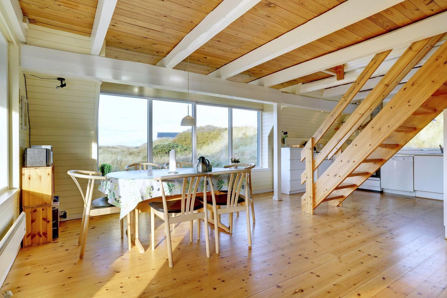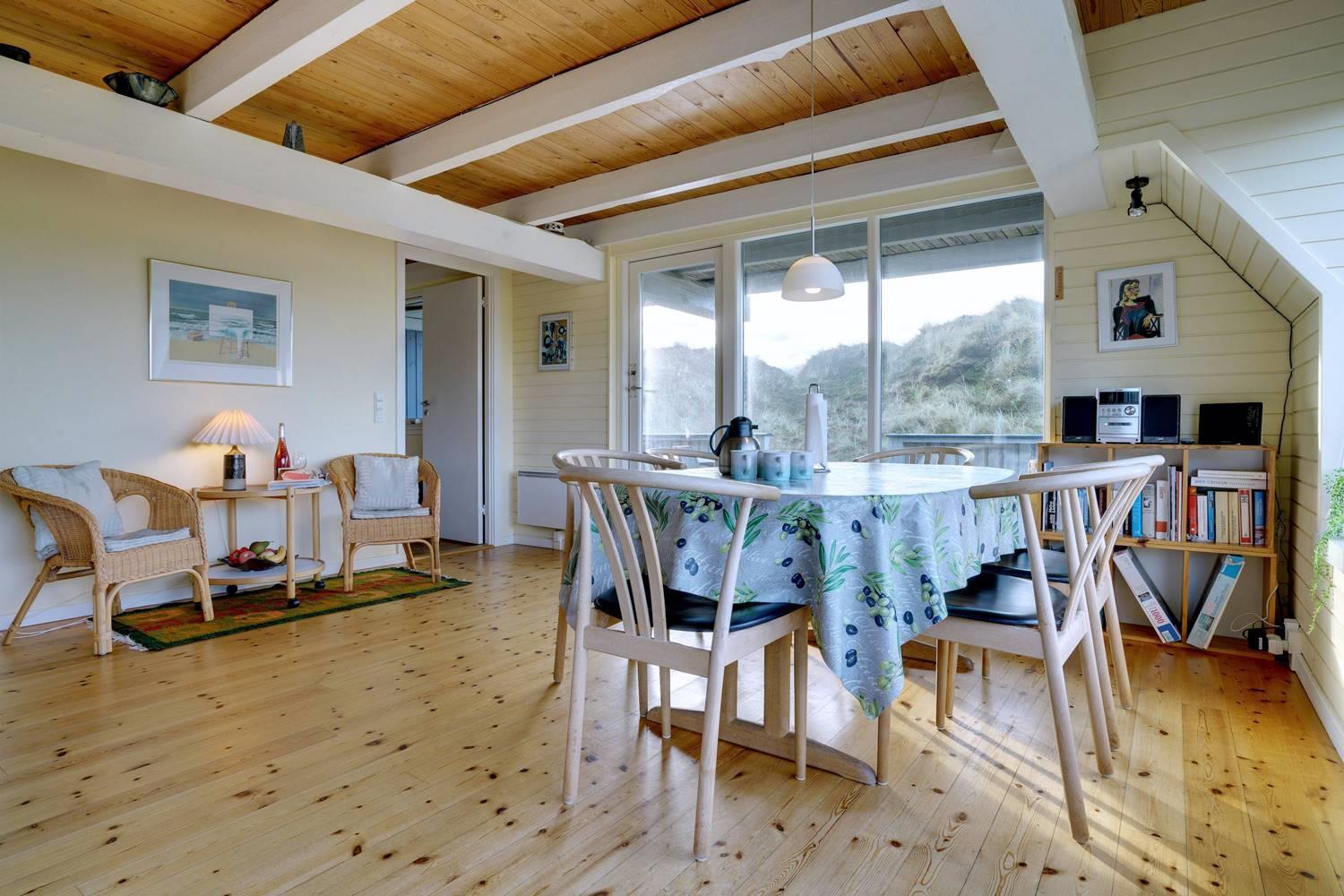 På en pragtfuld kuperet og ugeneret klitgrund fremme ved fredningslinien ligger dette feriehus med udnyttet 1. sal. Prøv at sidde i den hyggelige stue på 1. sal og nyd den pragtfulde udsigt udover klitterne. Køkkenet er i åben forbindelse med den lyse spiseafdeling hvorfra der også er skøn udsigt.