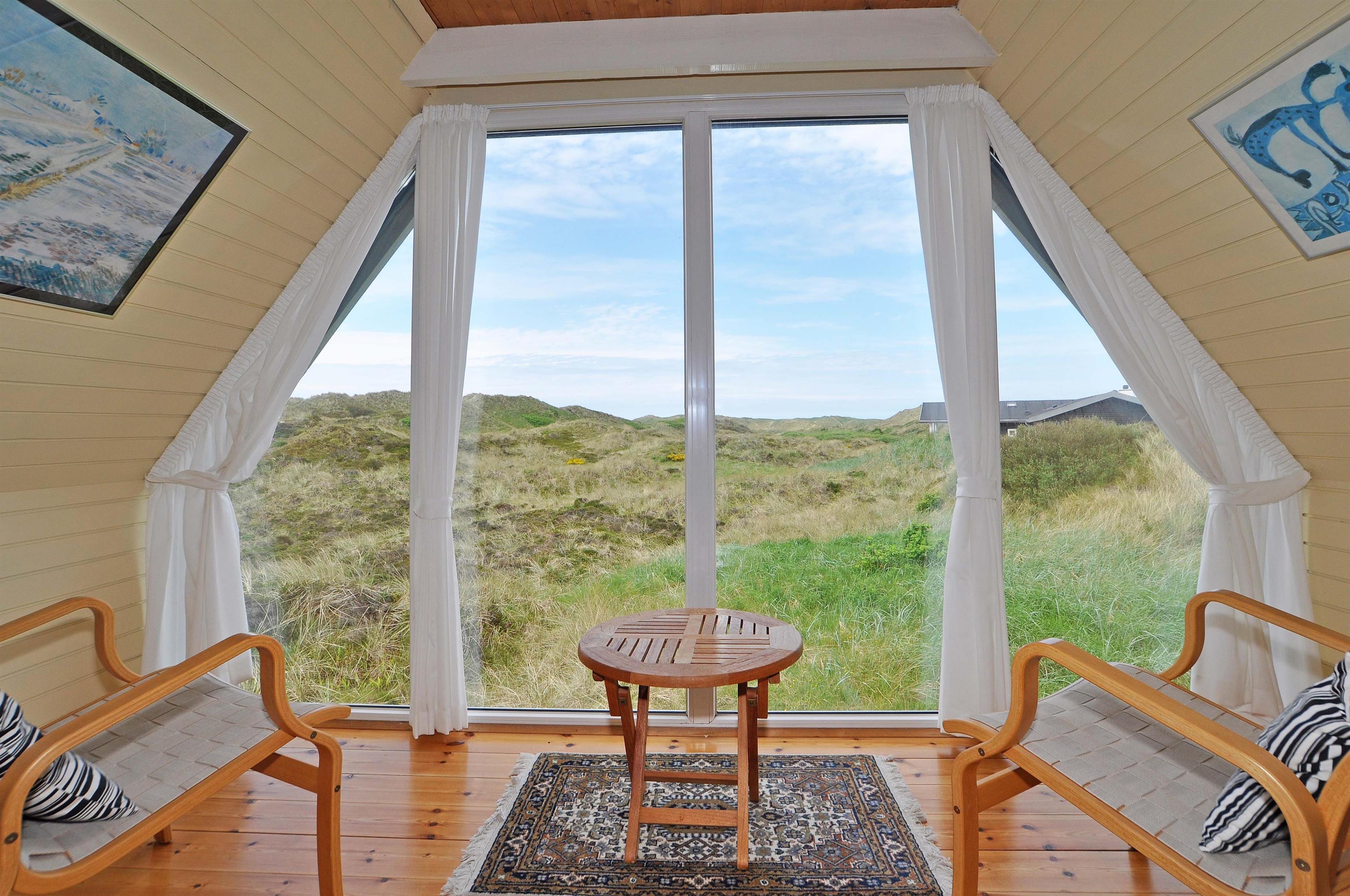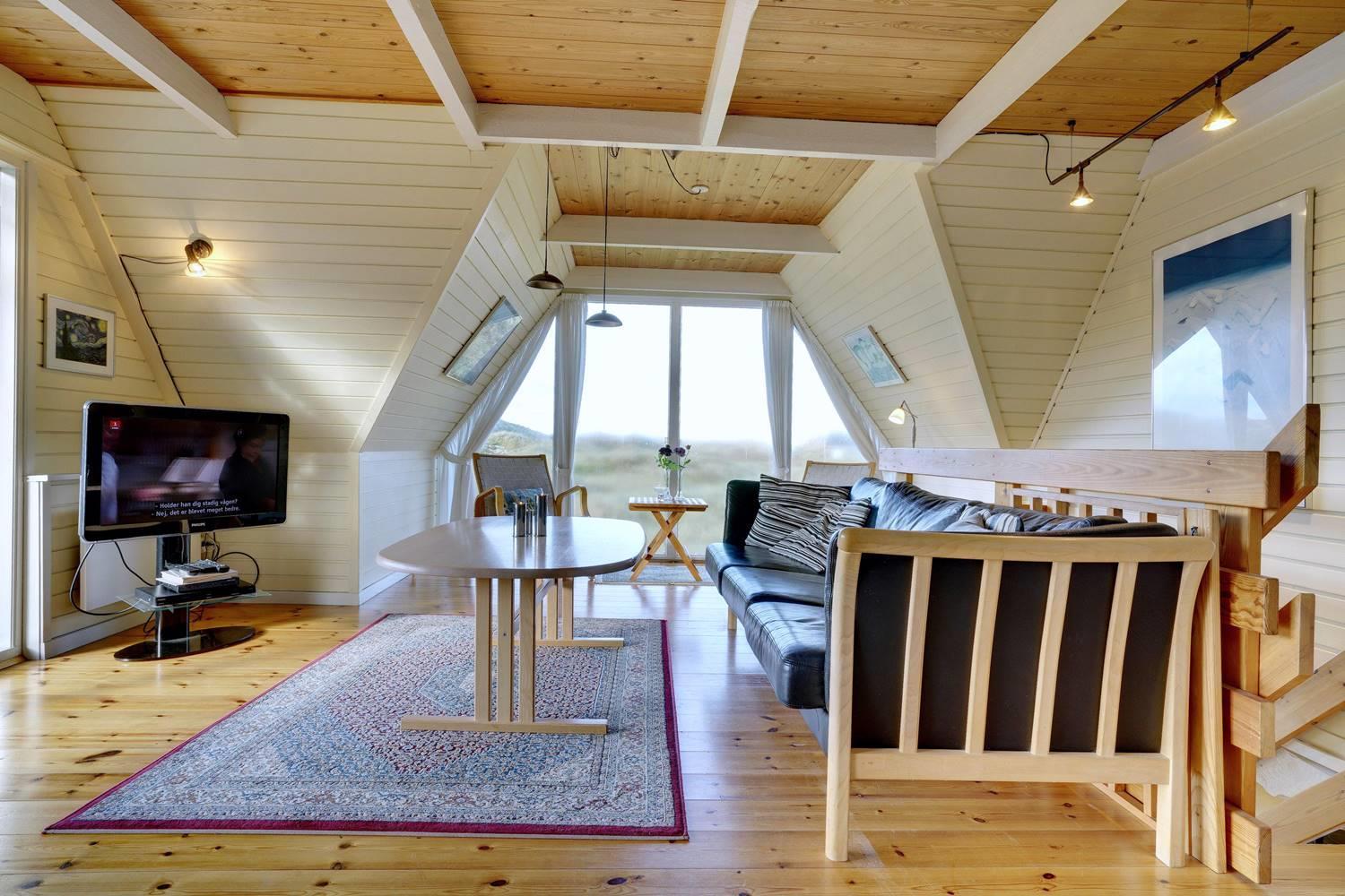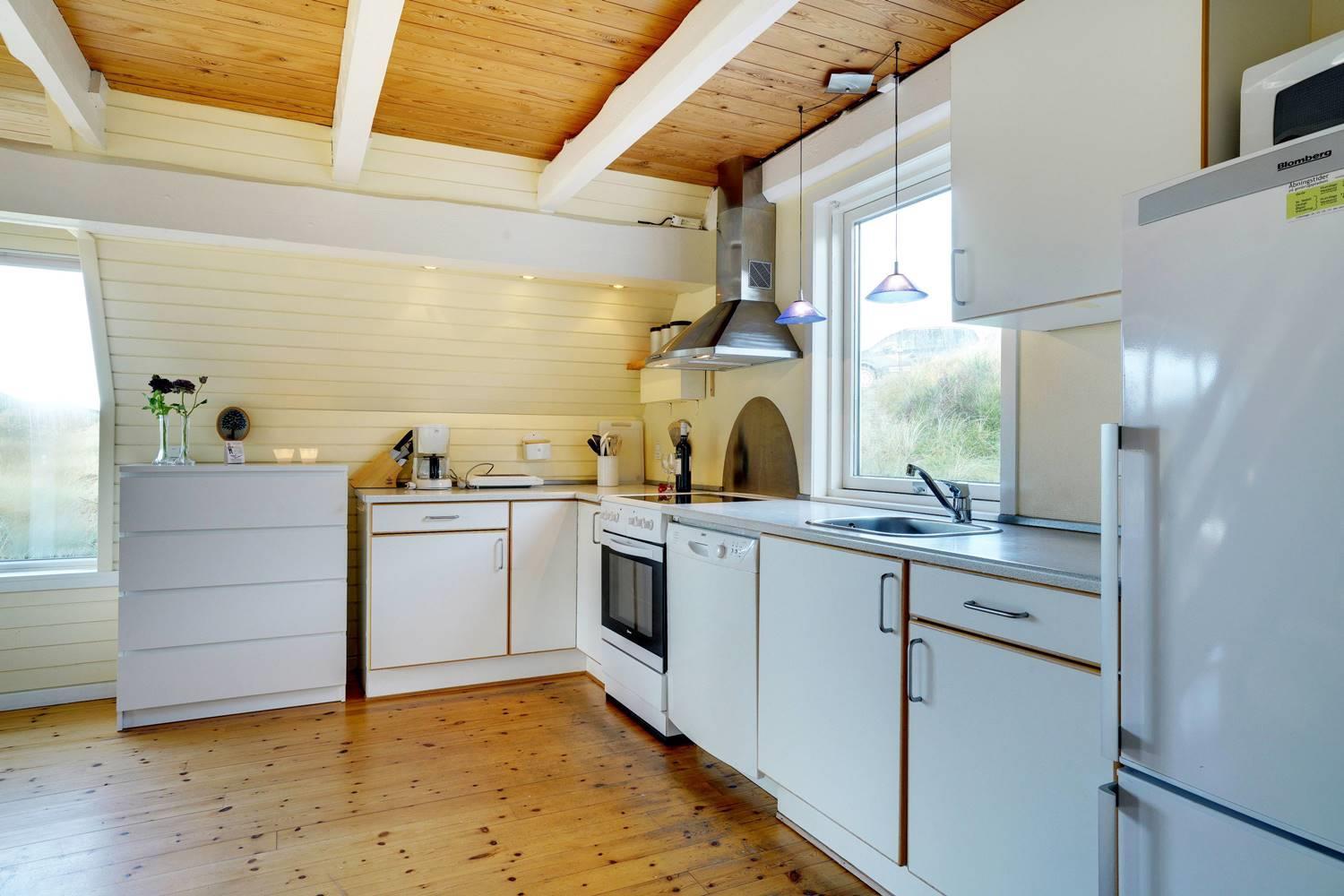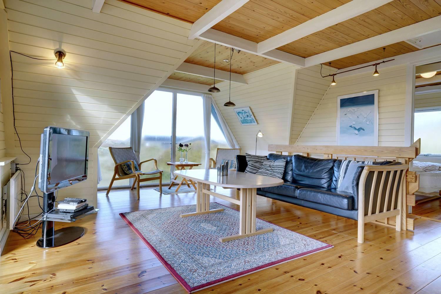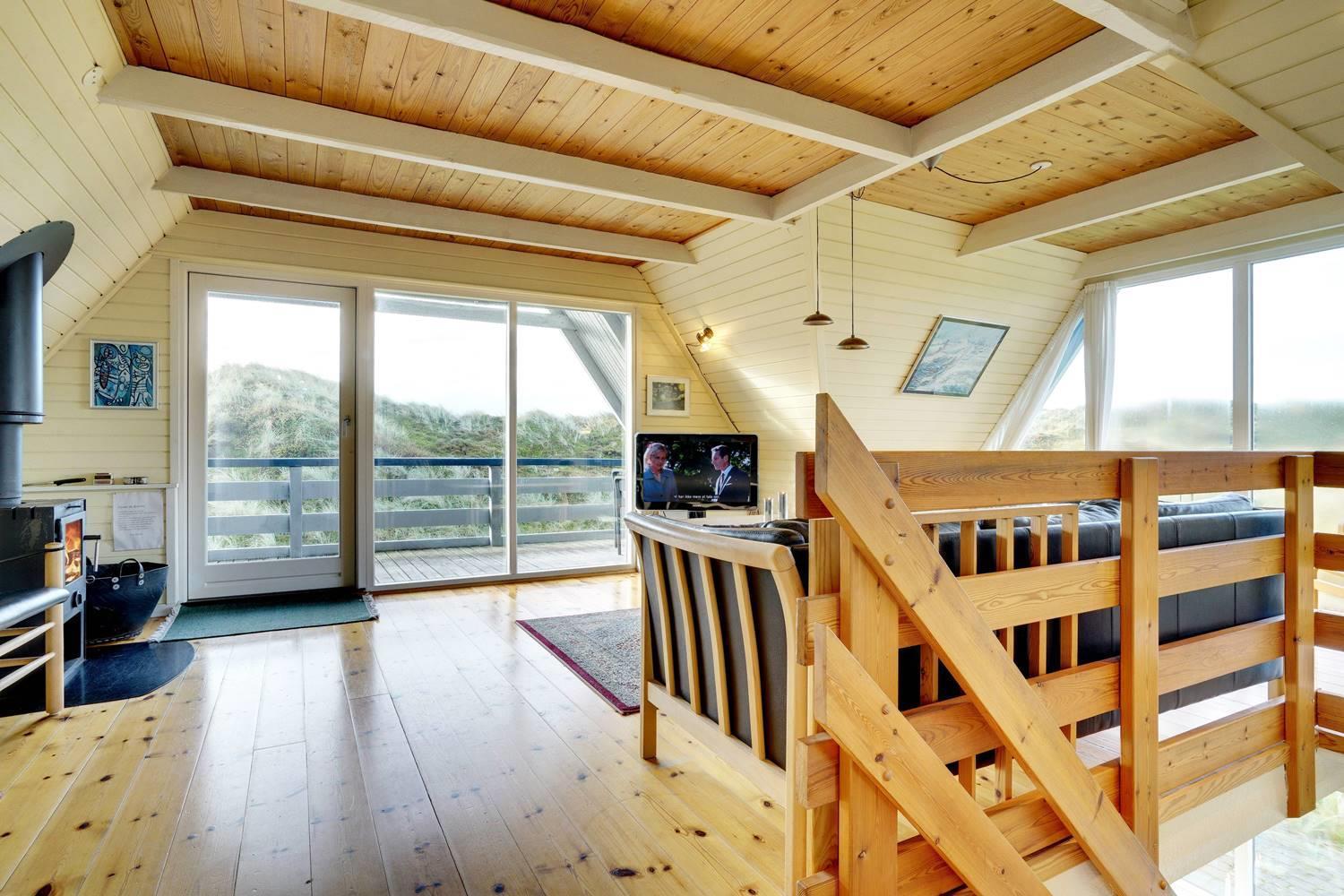 På en pragtfuld kuperet og ugeneret klitgrund fremme ved fredningslinien ligger dette feriehus med udnyttet 1. sal. Prøv at sidde i den hyggelige stue på 1. sal og nyd den pragtfulde udsigt udover klitterne. Køkkenet er i åben forbindelse med den lyse spiseafdeling hvorfra der også er skøn udsigt.