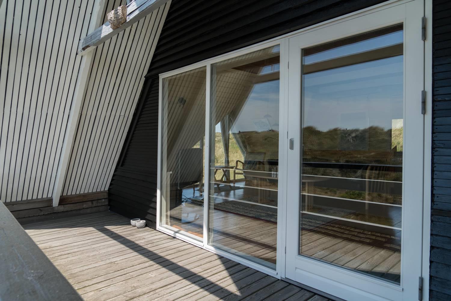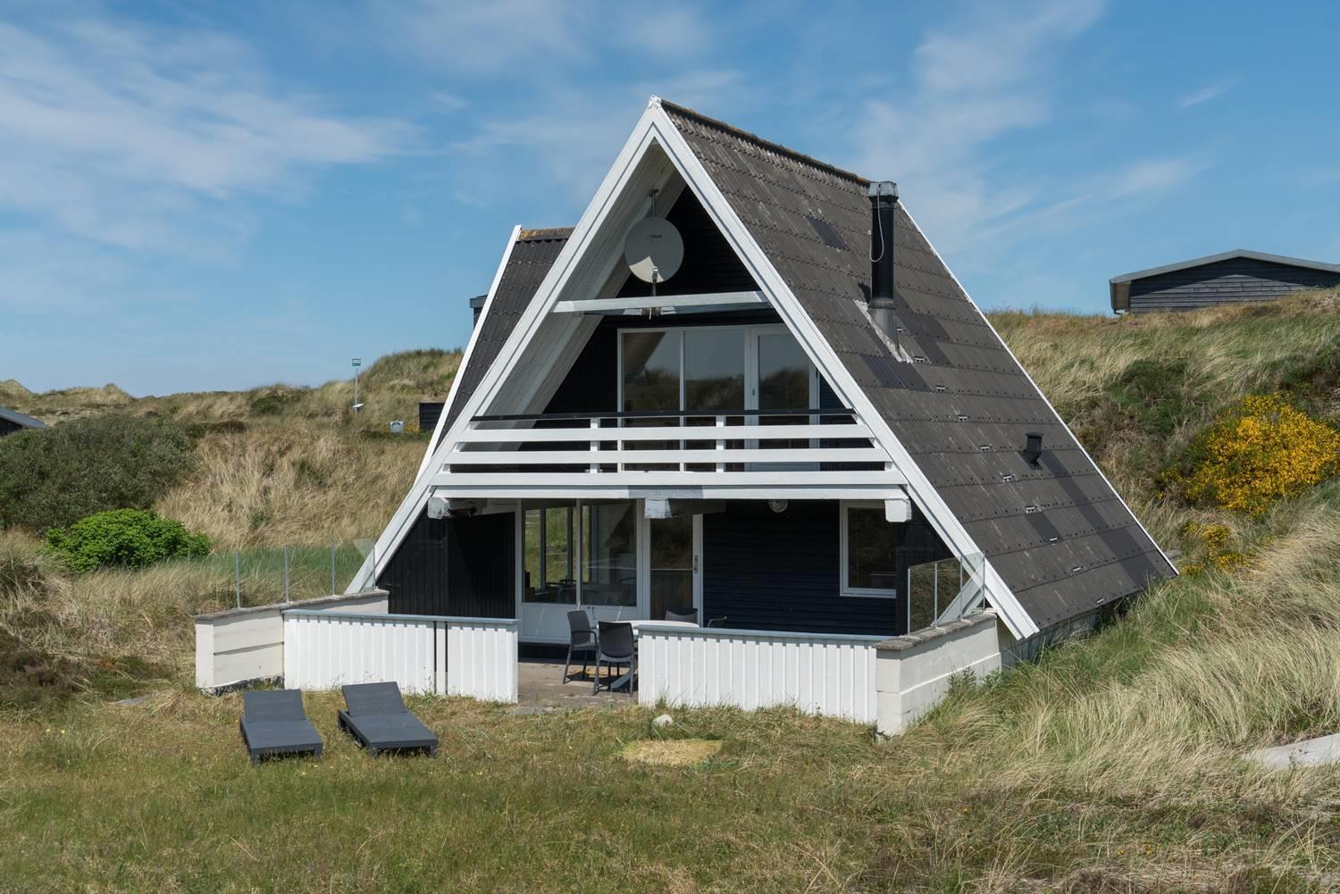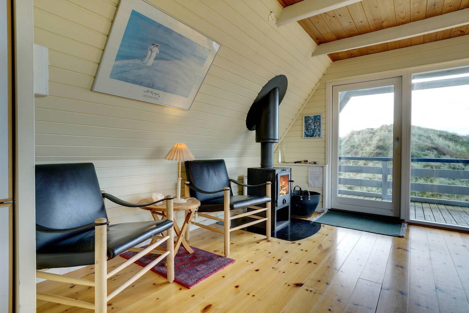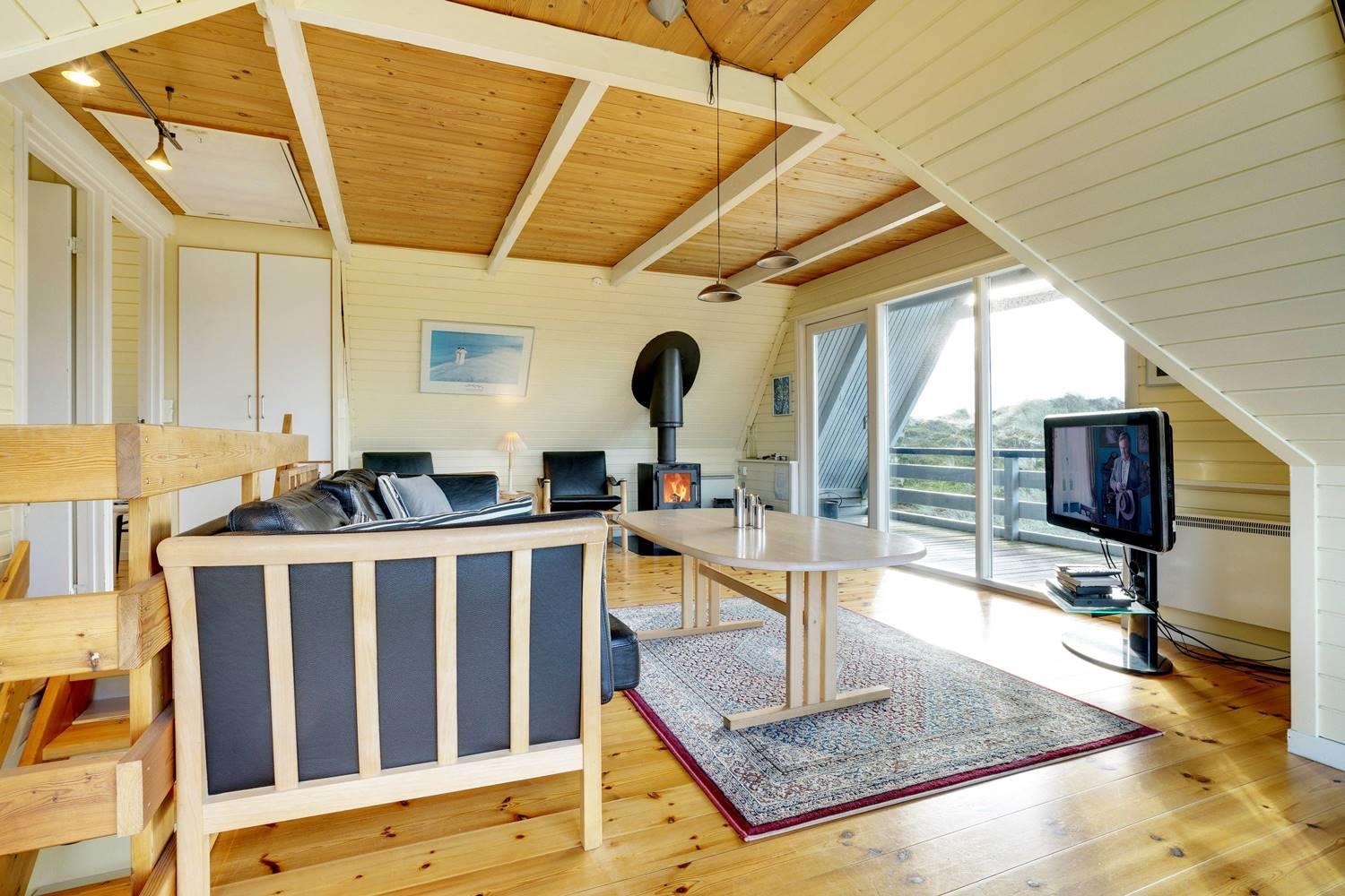 På en pragtfuld kuperet og ugeneret klitgrund fremme ved fredningslinien ligger dette feriehus med udnyttet 1. sal. Prøv at sidde i den hyggelige stue på 1. sal og nyd den pragtfulde udsigt udover klitterne. Køkkenet er i åben forbindelse med den lyse spiseafdeling hvorfra der også er skøn udsigt.