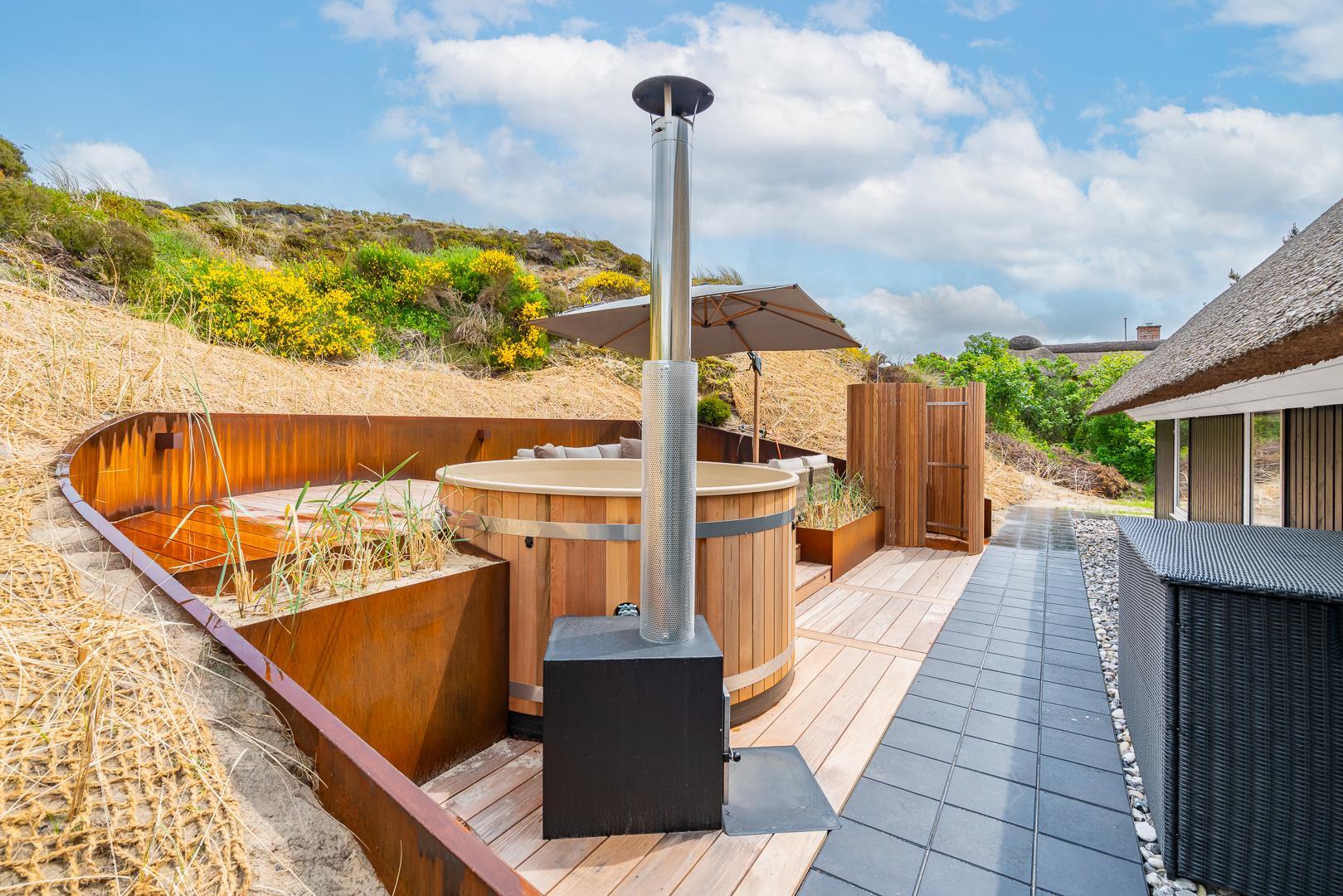 Her er både et lækkert og indbydende lounge område med loungemøbler og vildmarksbad og en stor overdækket terrasse, der vender mod vest.