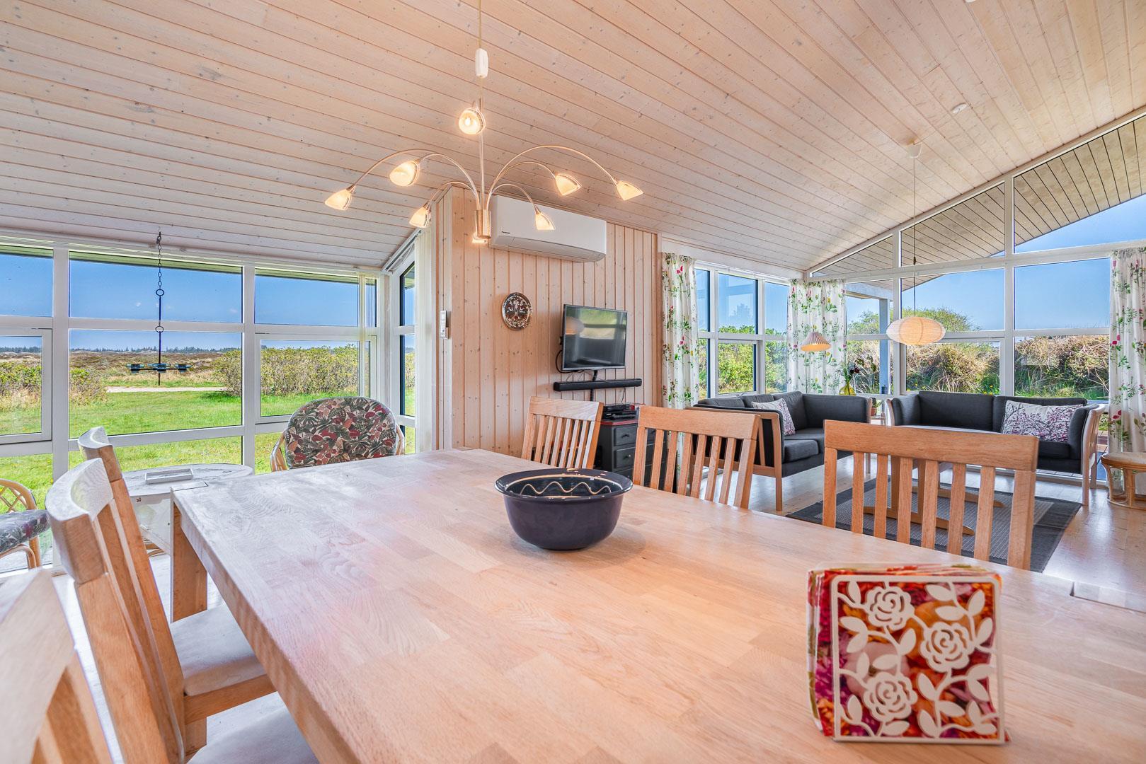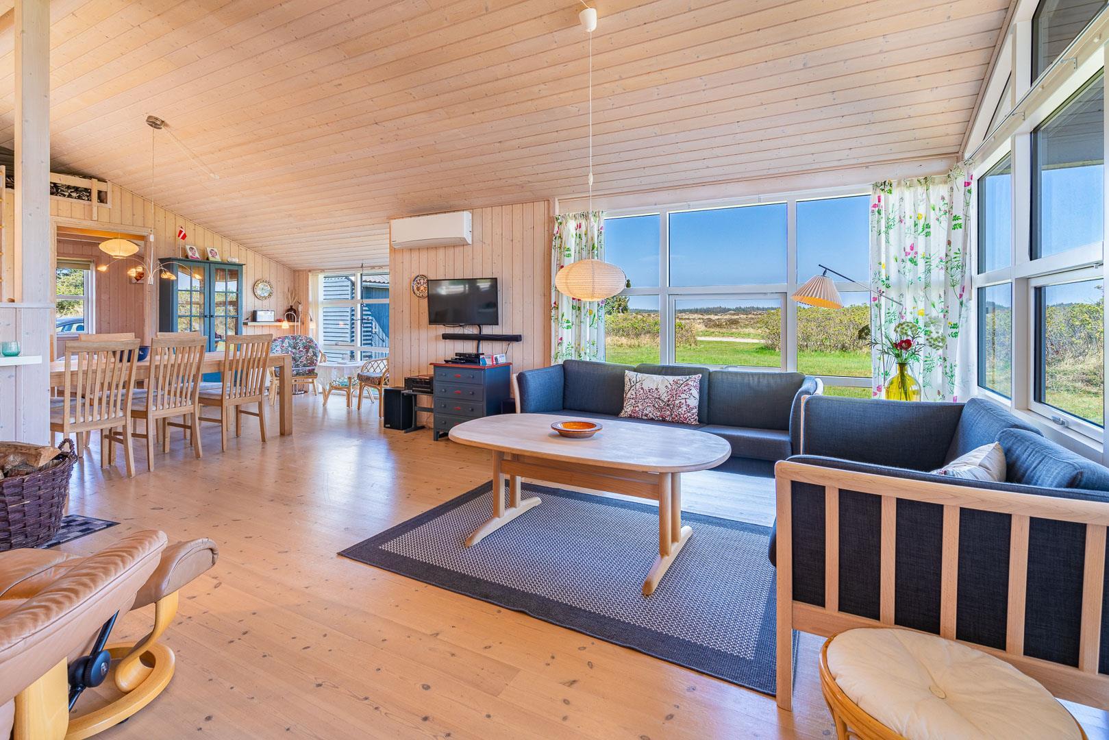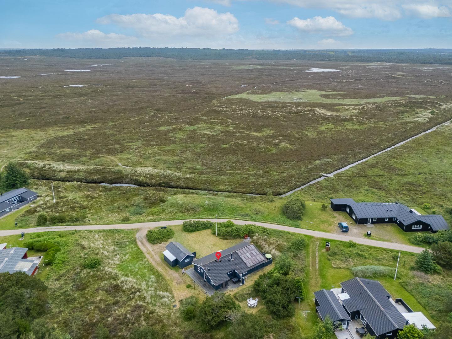 Beliggende i rolige omgivelser med en fortryllende udsigt over det fredede hedeareal, indbyder dette feriehus til afslapning og fordybelse i naturens skønhed. Træd ind i den hyggelige stue, hvor en varm brændeovn spreder en behagelig atmosfære, og køkkenet åbner sig op i en invitation til fælles madlavning og hyggelige måltider. Fra stuen fører en dør ud til en fin overdækket terrasse, hvor du kan nyde morgenkaffen i solens varme stråler eller afslutte dagen med en stjerneklar himmel som kulisse.