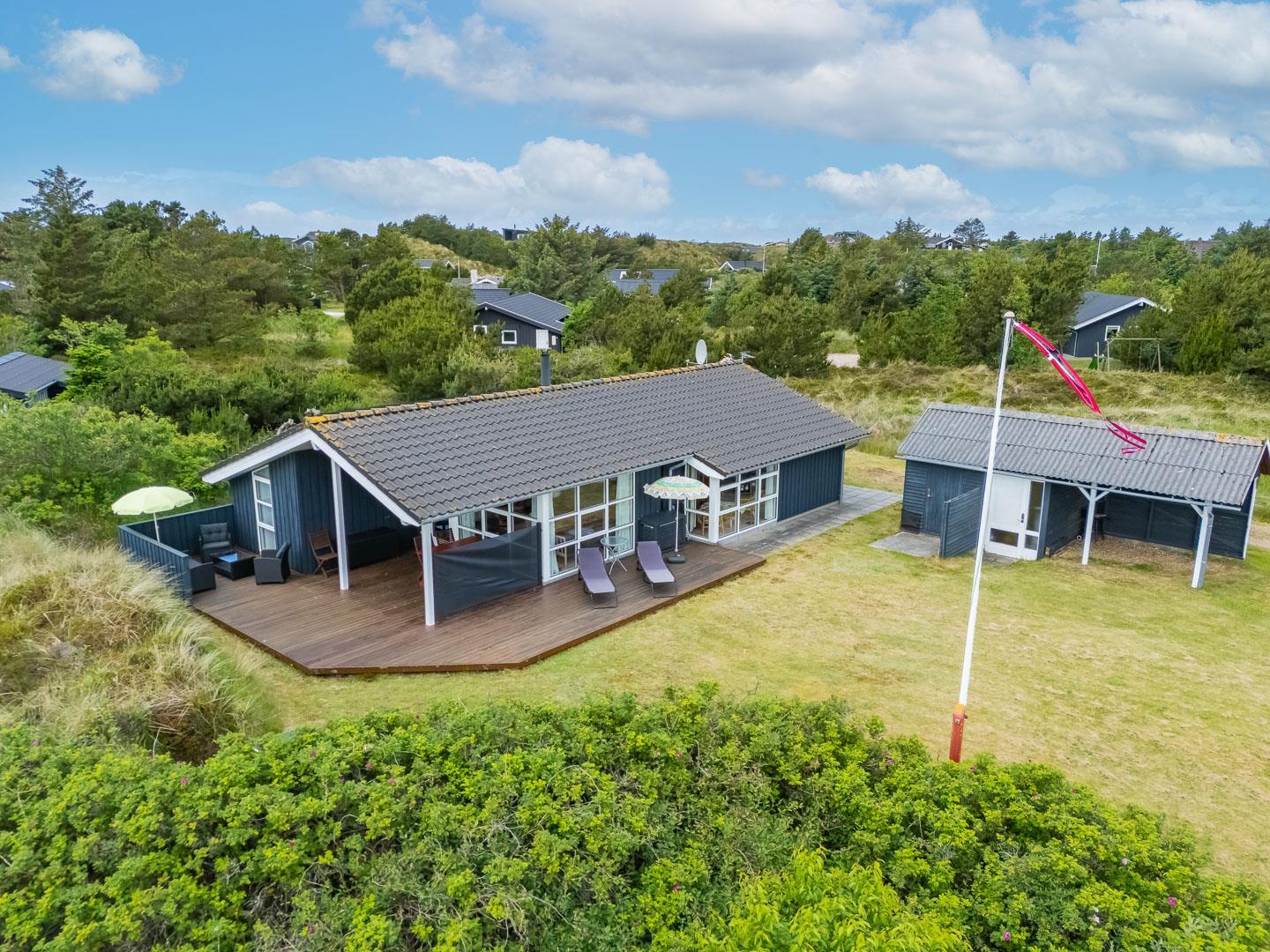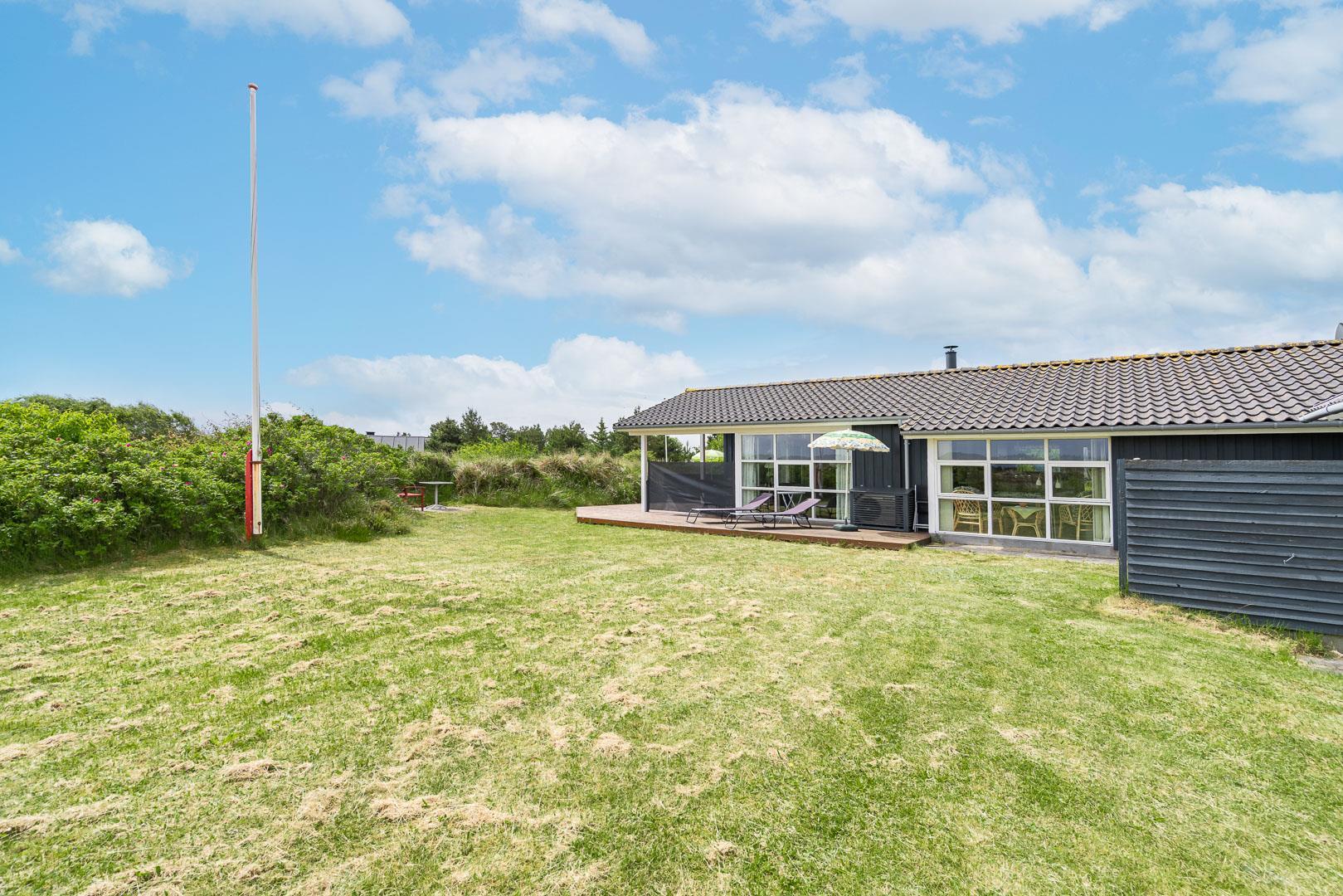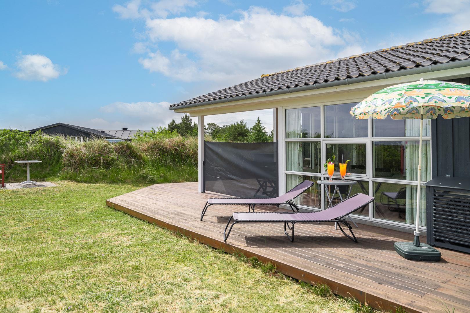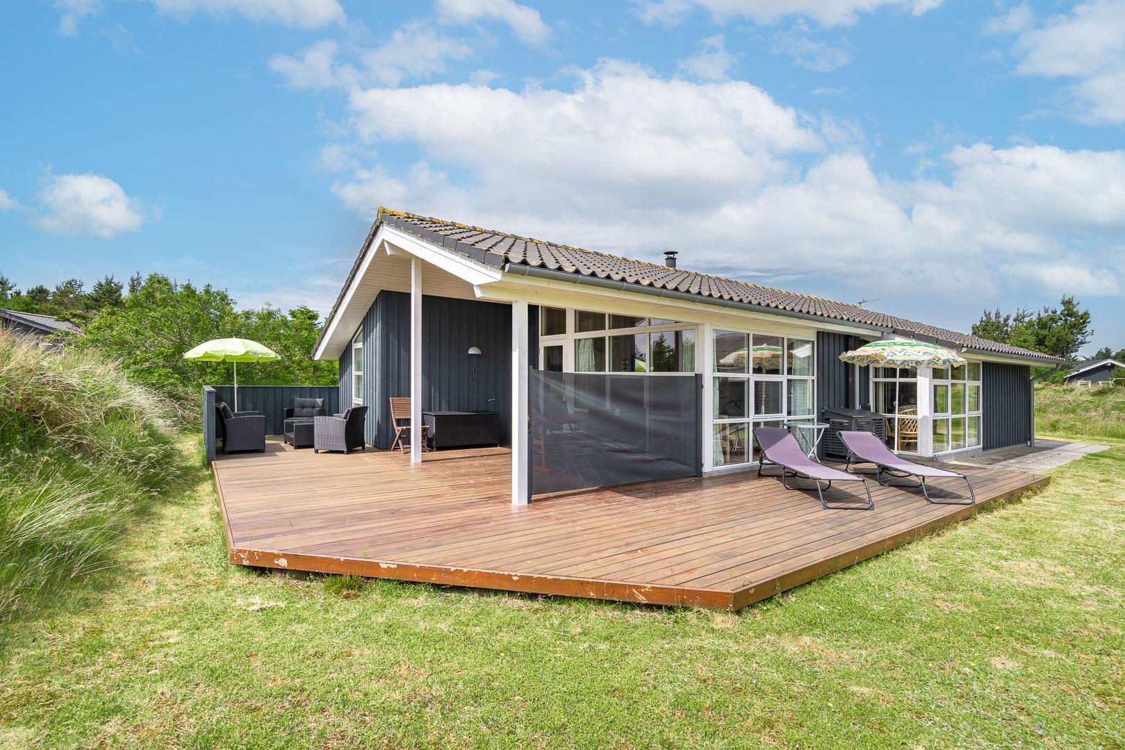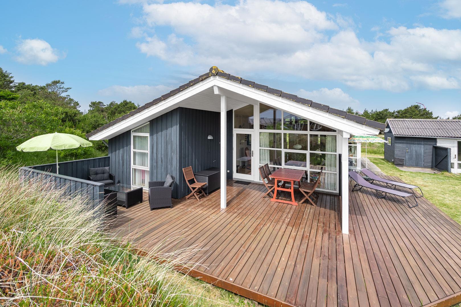 Udendørsarealerne omfavner den skønne natur omkring sommerhuset i Henne Strand. Flere terrasser giver mulighed for udendørs aktiviteter og afslapning, og den lille naturgrund foran huset tilføjer en ekstra dimension af charme og ro.