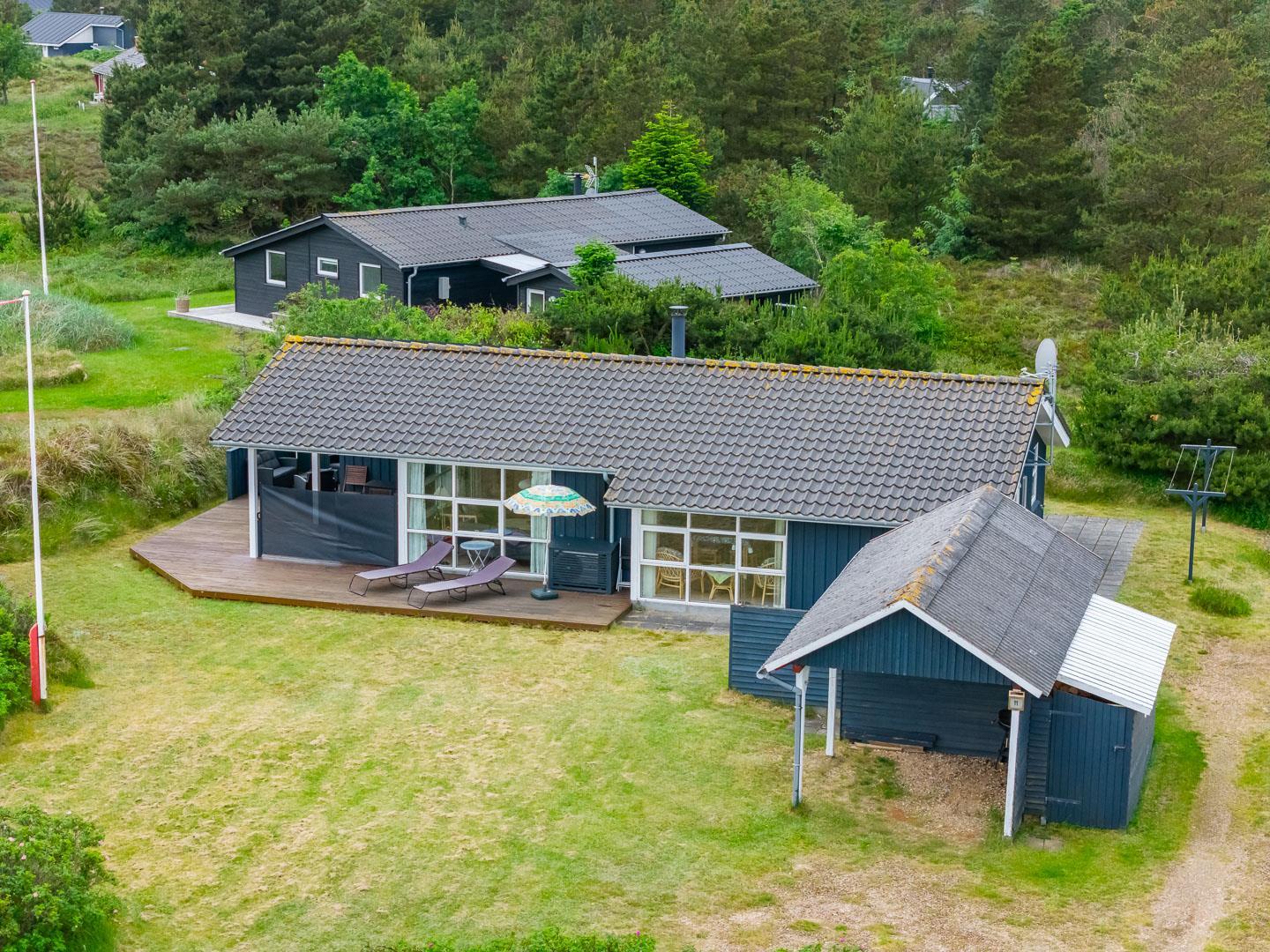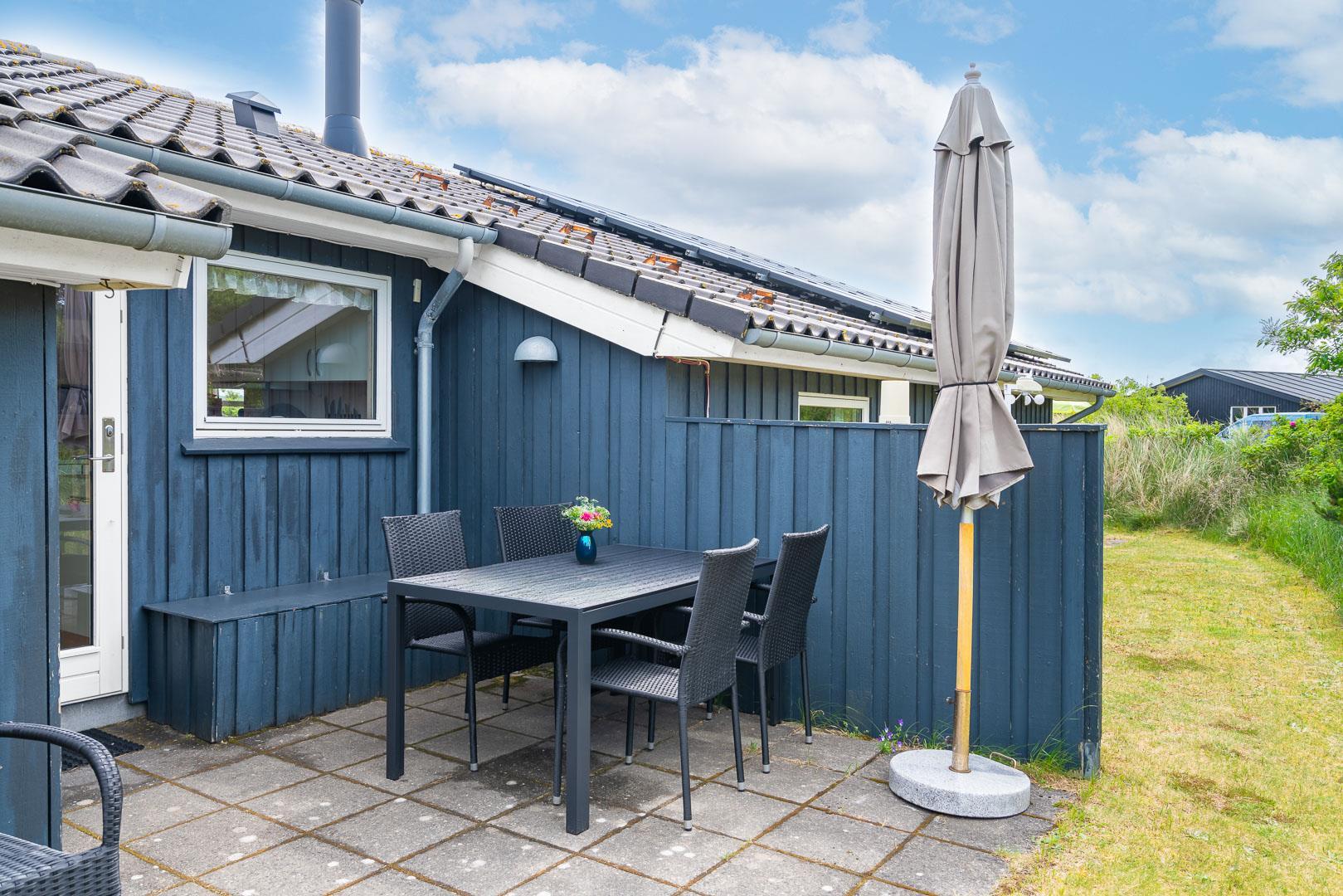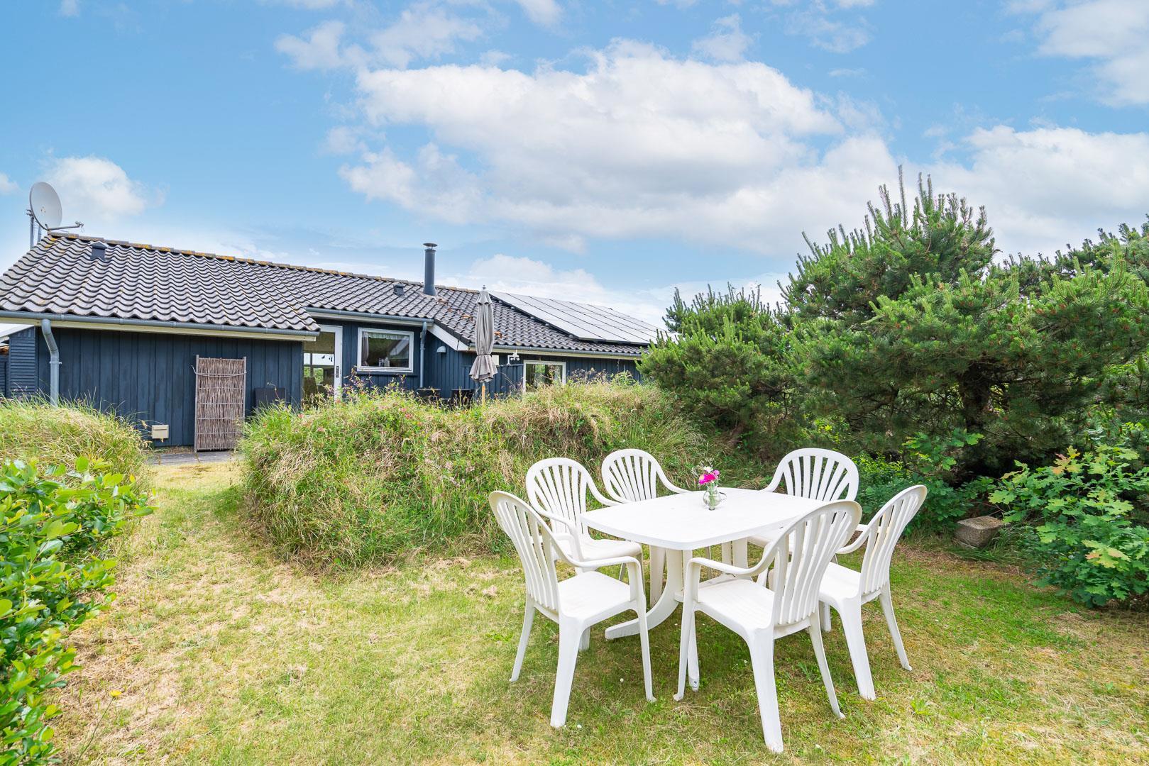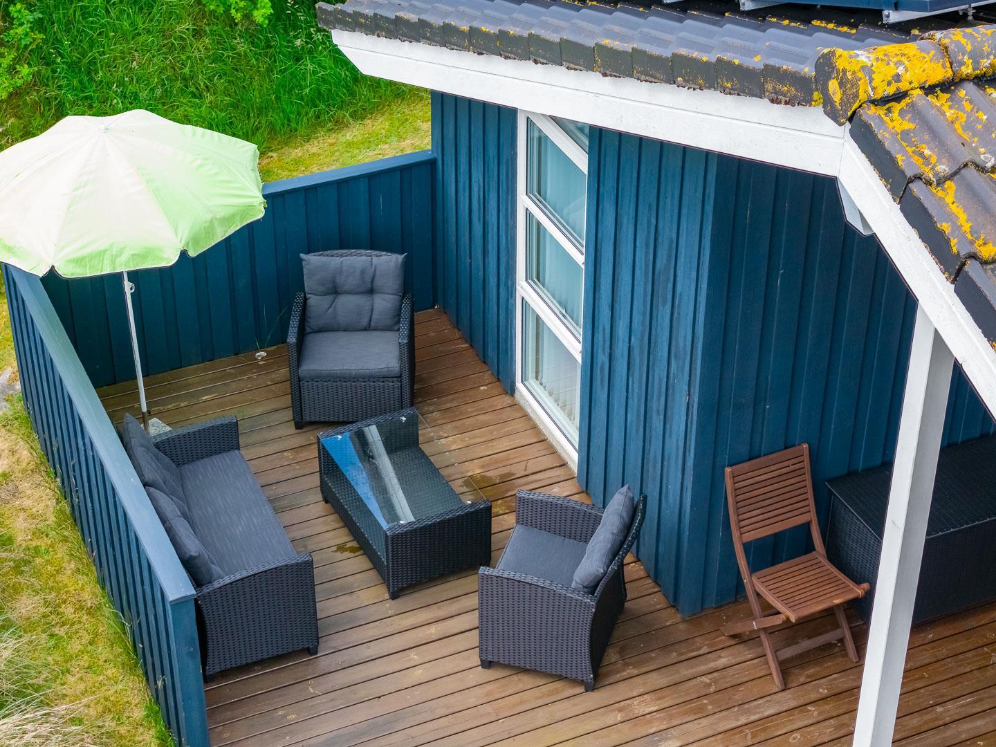 Udendørsarealerne omfavner den skønne natur omkring sommerhuset i Henne Strand. Flere terrasser giver mulighed for udendørs aktiviteter og afslapning, og den lille naturgrund foran huset tilføjer en ekstra dimension af charme og ro.