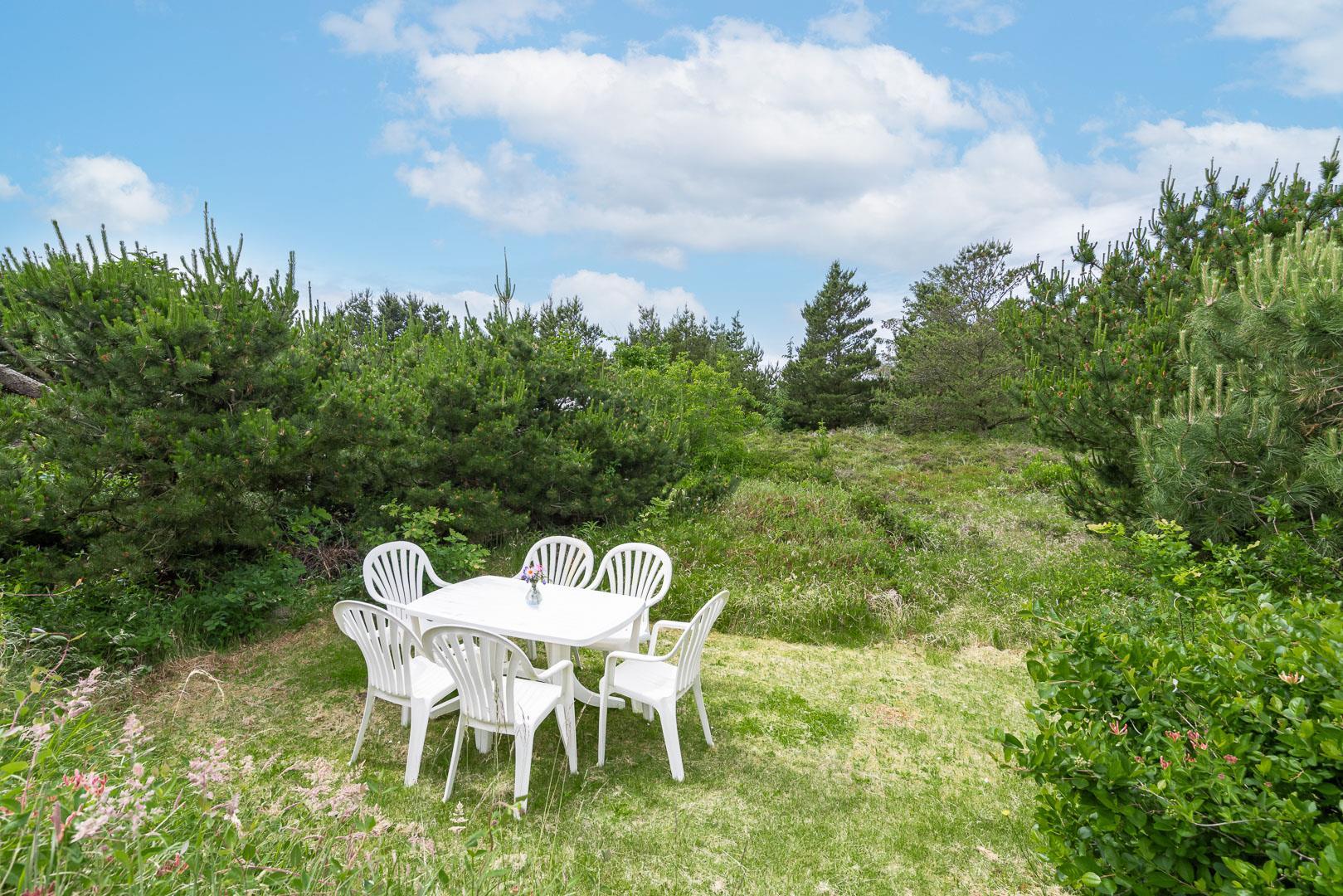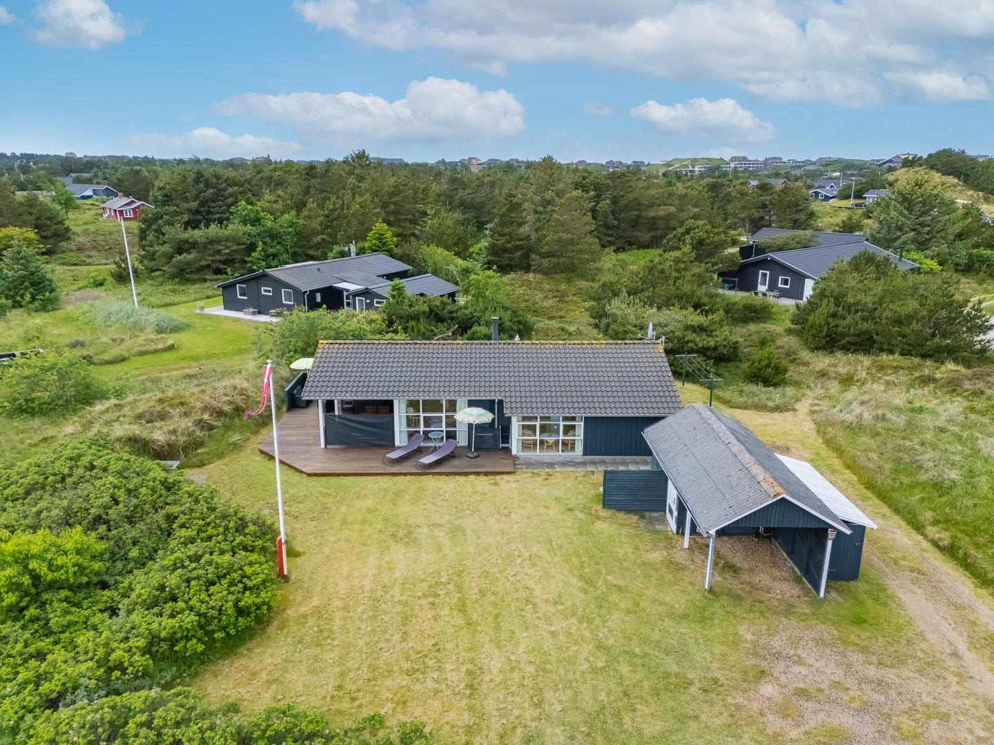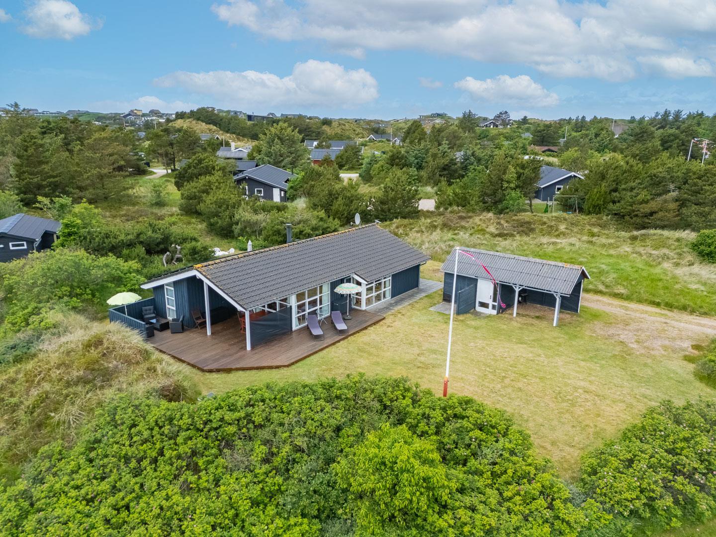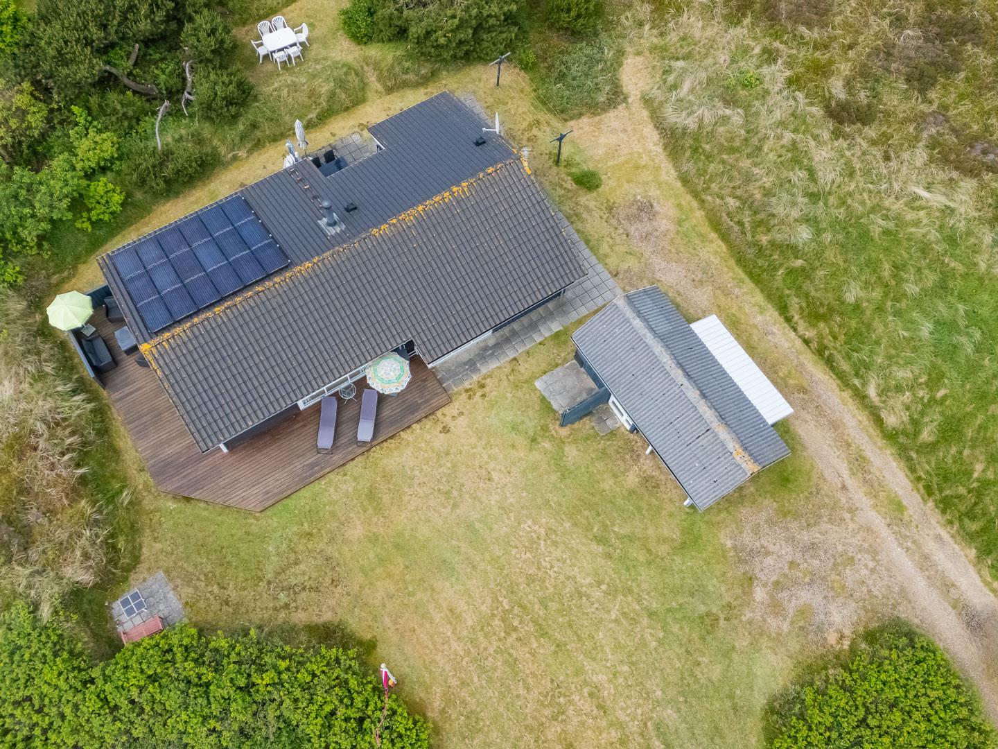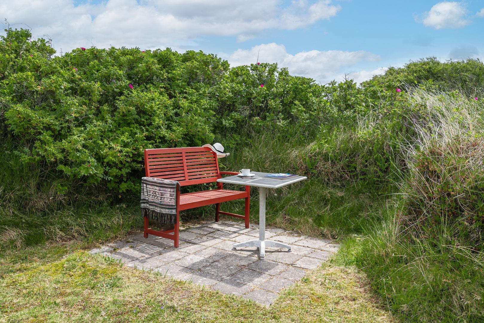 Udendørsarealerne omfavner den skønne natur omkring sommerhuset i Henne Strand. Flere terrasser giver mulighed for udendørs aktiviteter og afslapning, og den lille naturgrund foran huset tilføjer en ekstra dimension af charme og ro.