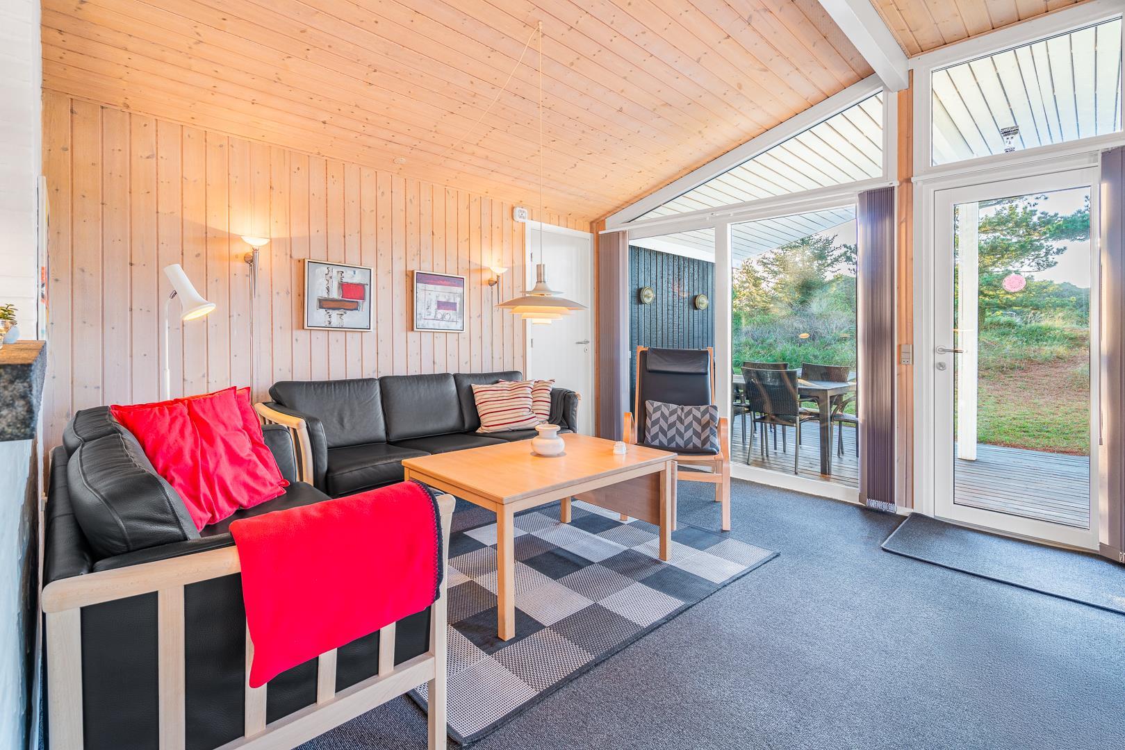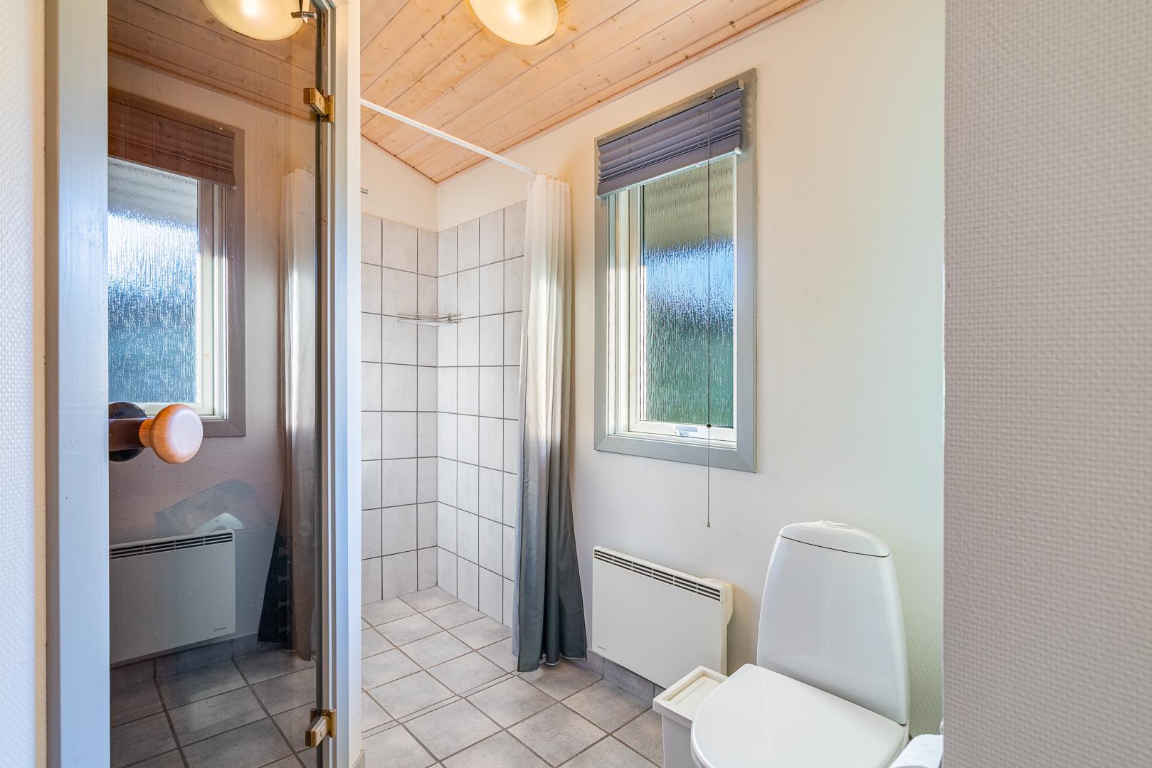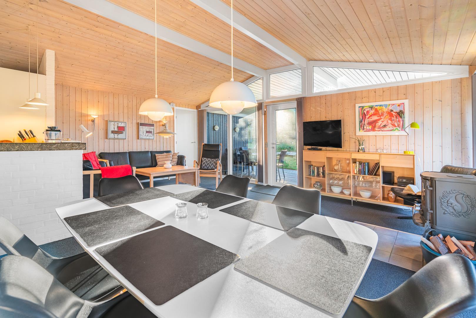 Sommerhuset rummer to badeværelser, hvoraf det ene har direkte adgang til sauna – perfekt til wellness og afslapning efter en aktiv dag ved havet. Det velindrettede køkken-alrum er udstyret med brændeovn og energivenlig varmepumpe, og herfra er der direkte udgang til en delvist overdækket træterrasse.