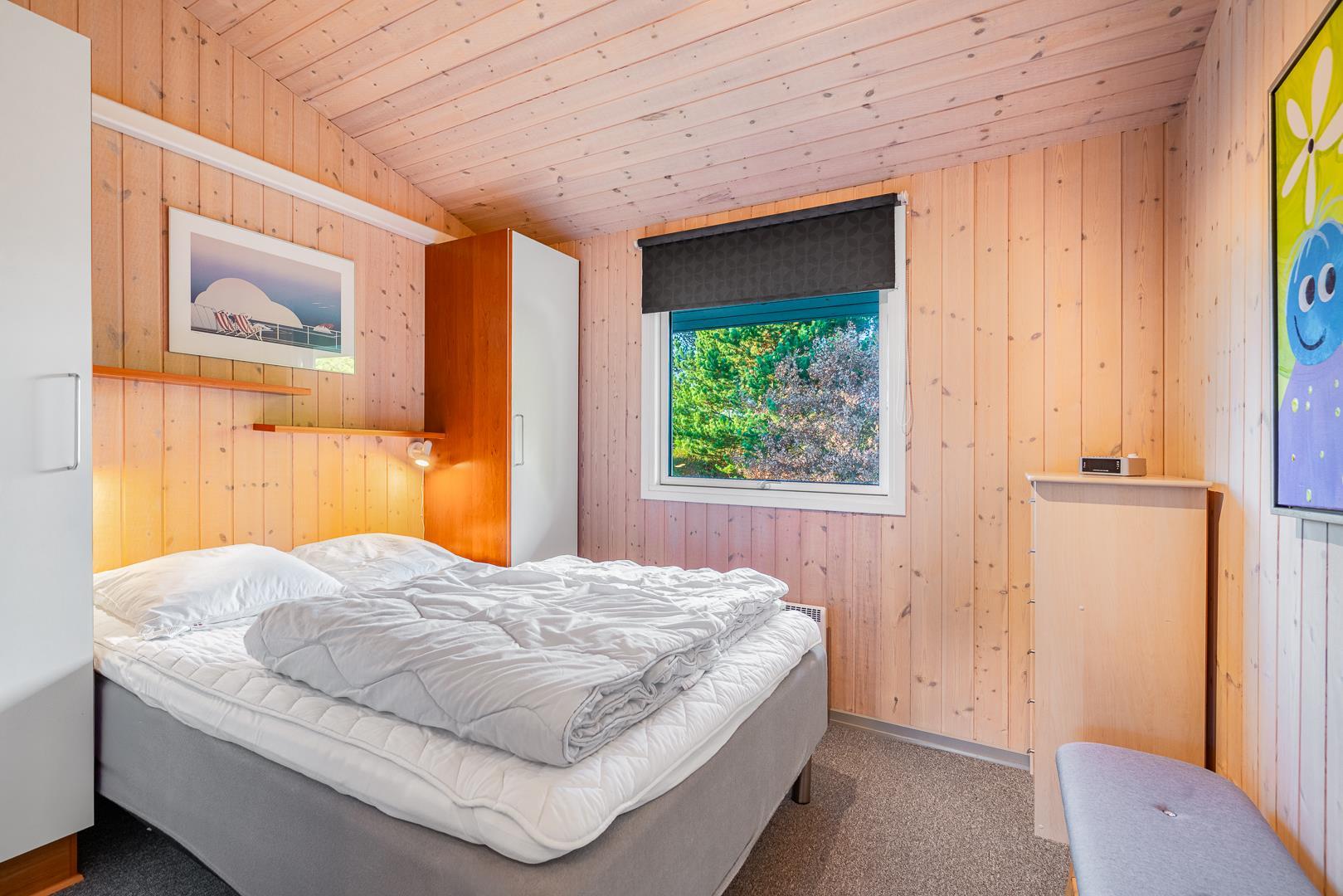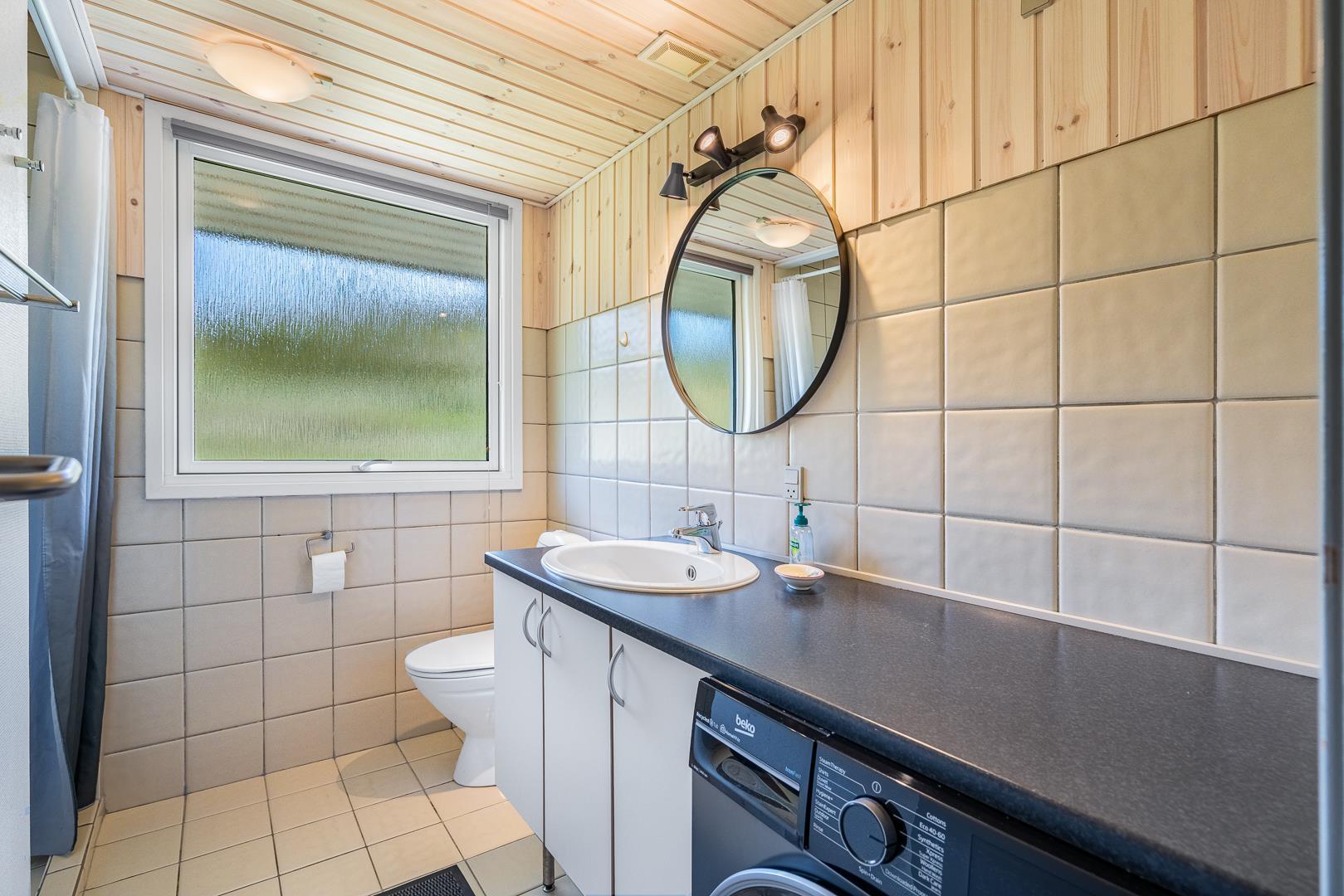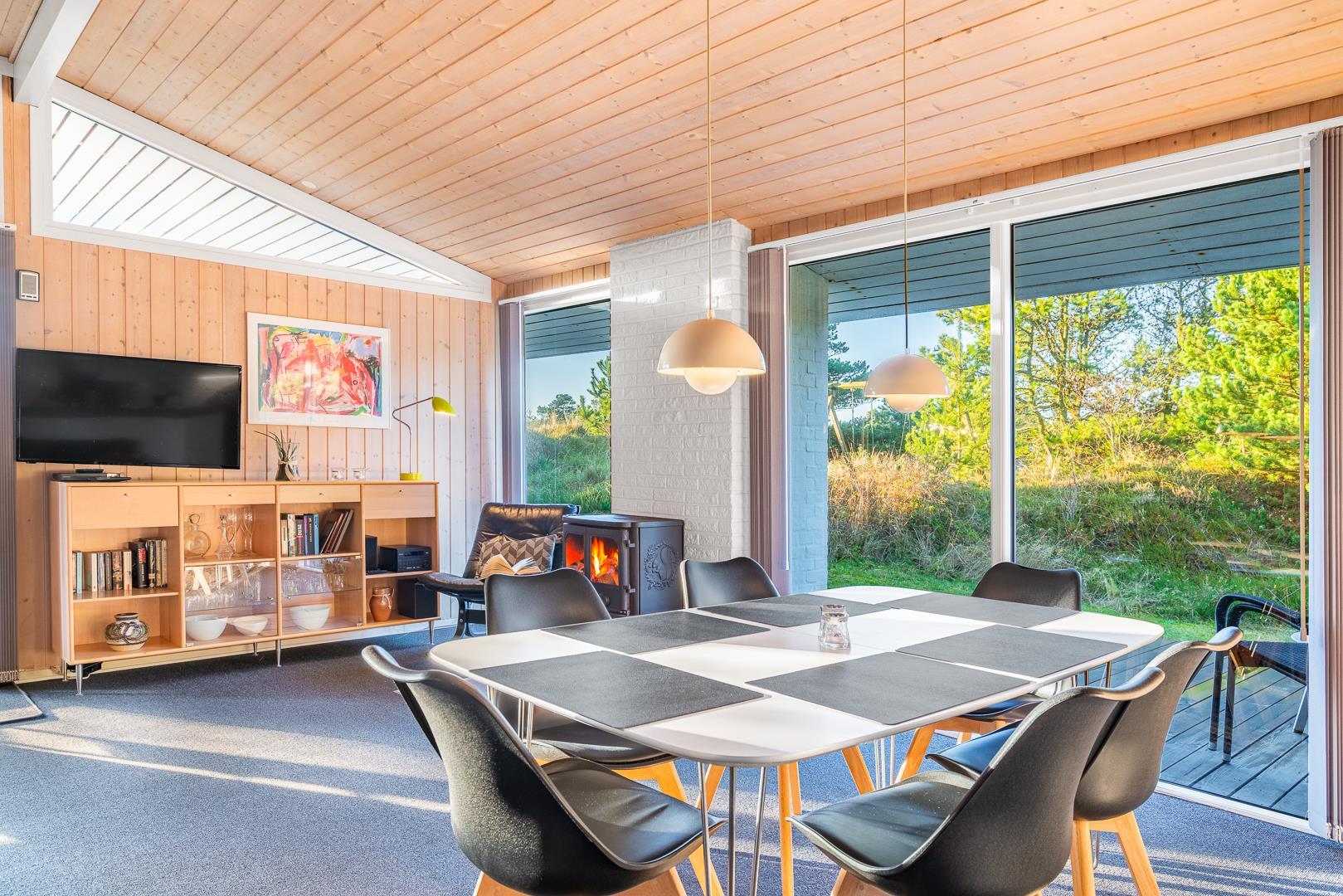 Sommerhuset rummer to badeværelser, hvoraf det ene har direkte adgang til sauna – perfekt til wellness og afslapning efter en aktiv dag ved havet. Det velindrettede køkken-alrum er udstyret med brændeovn og energivenlig varmepumpe, og herfra er der direkte udgang til en delvist overdækket træterrasse.