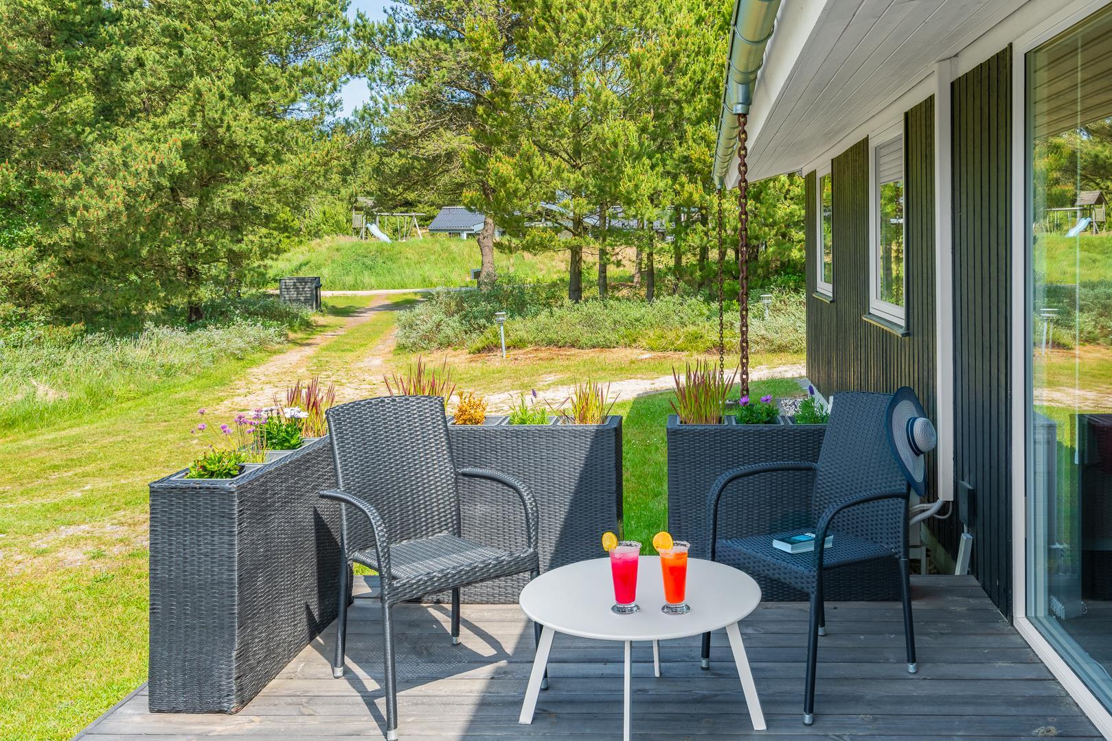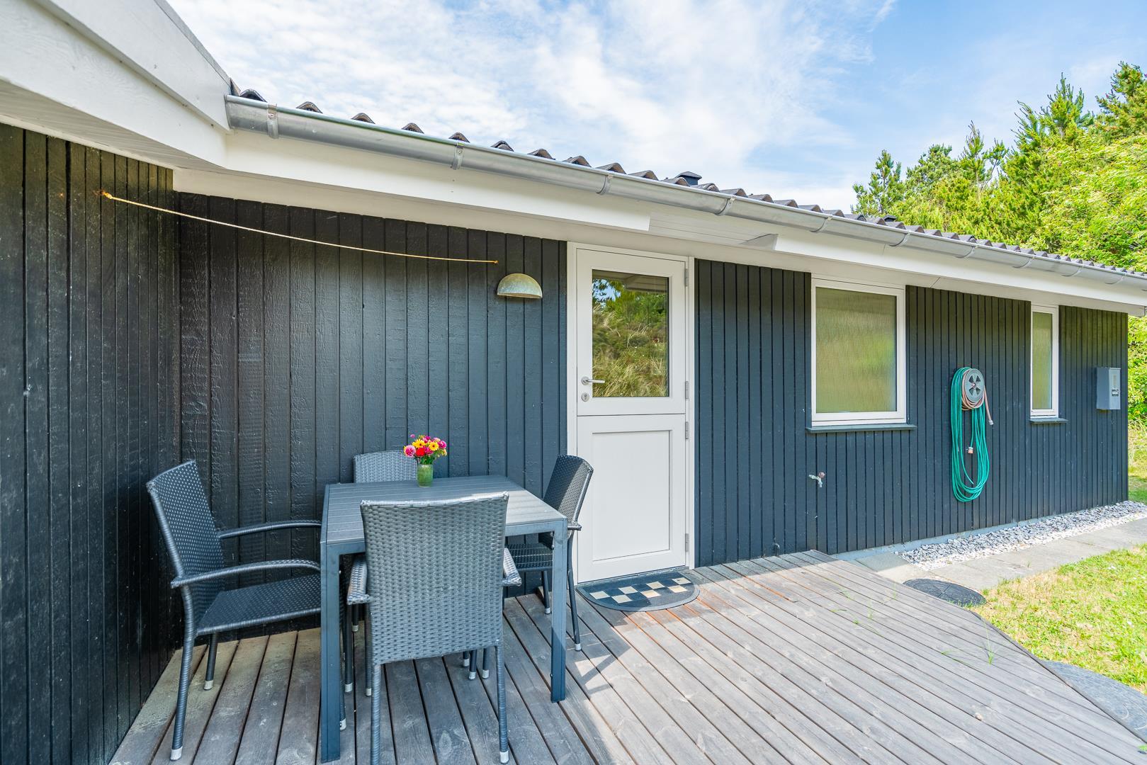 Rundt om huset findes desuden flere gode terrasseområder, som giver mulighed for at nyde solen og naturen hele dagen – uanset tidspunkt. Et sommerhus med masser af charme og praktiske faciliteter – klar til at danne rammen om en skøn ferie i Henne Strand.