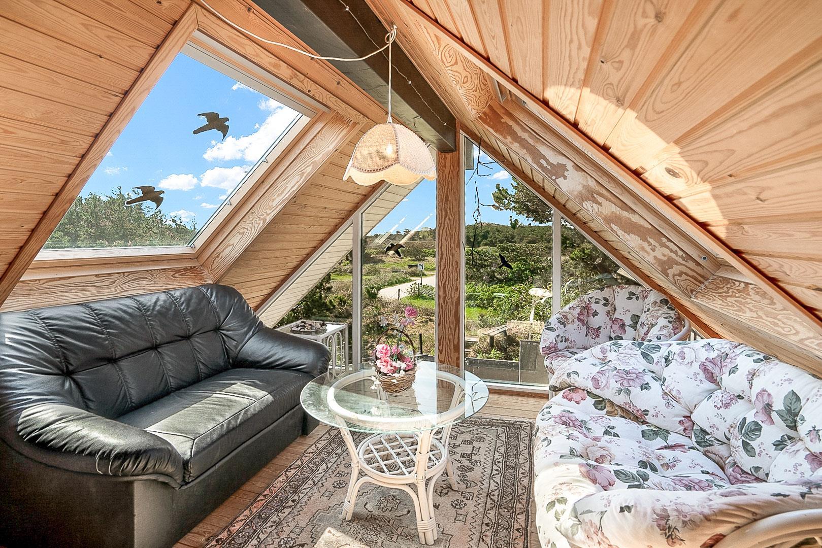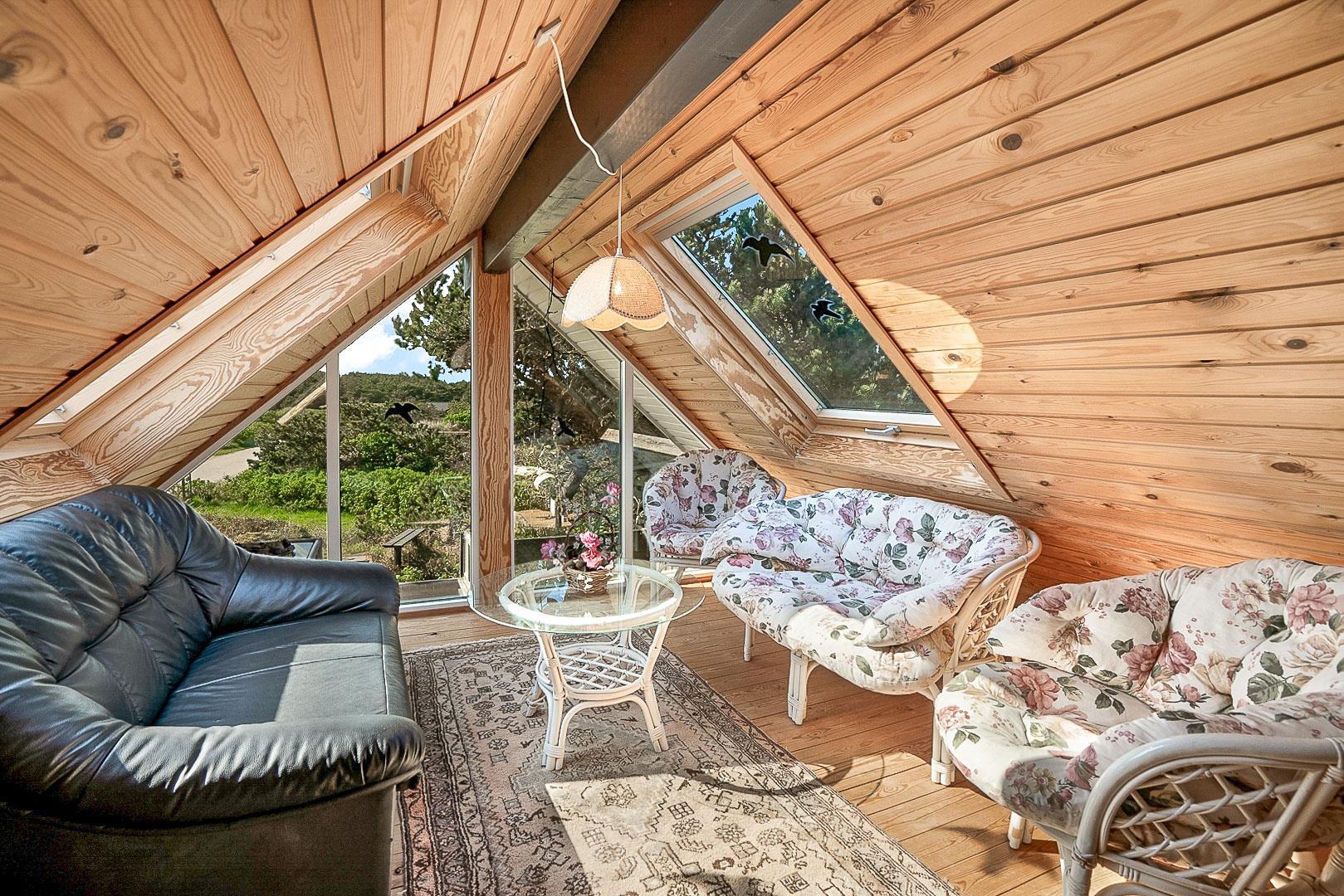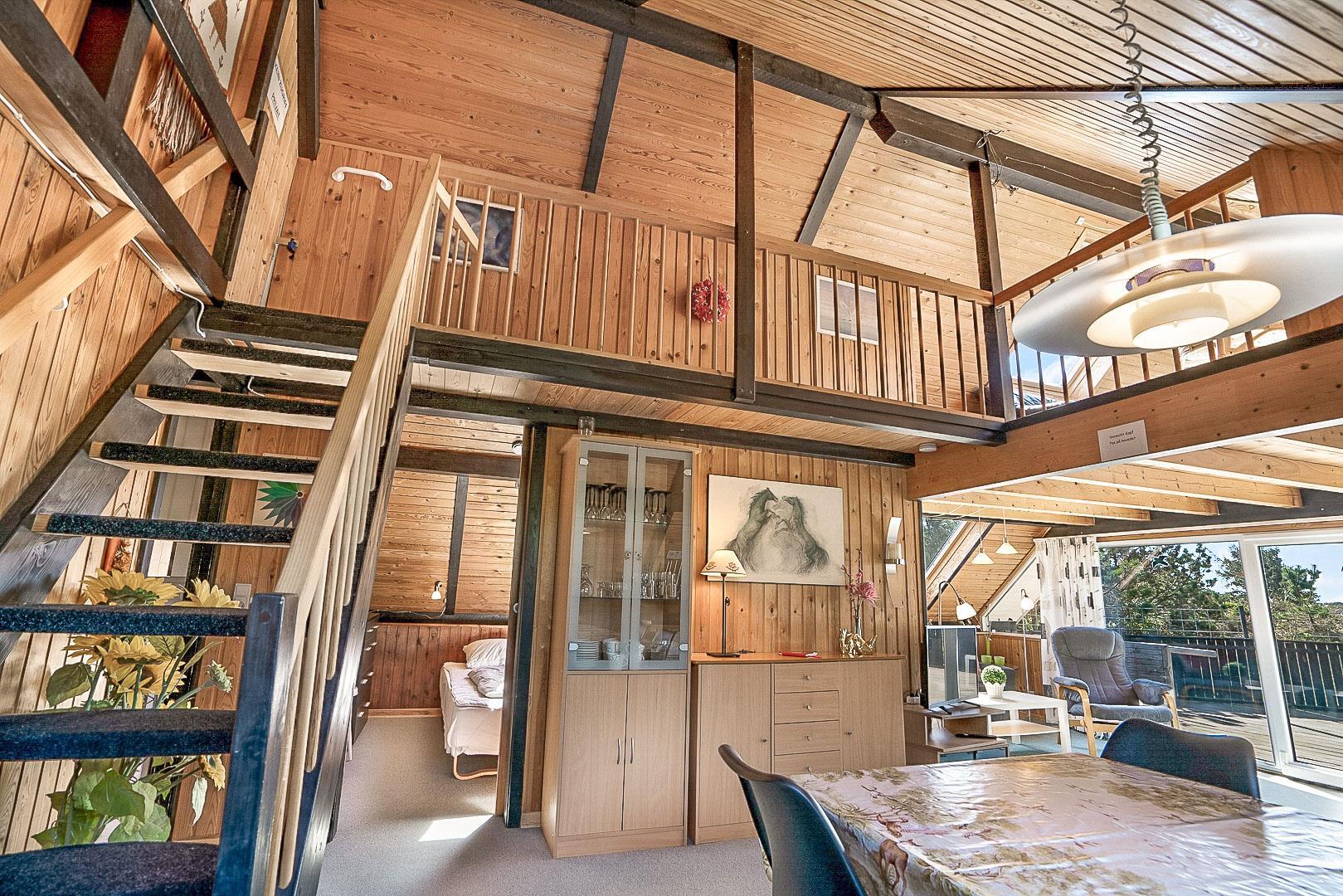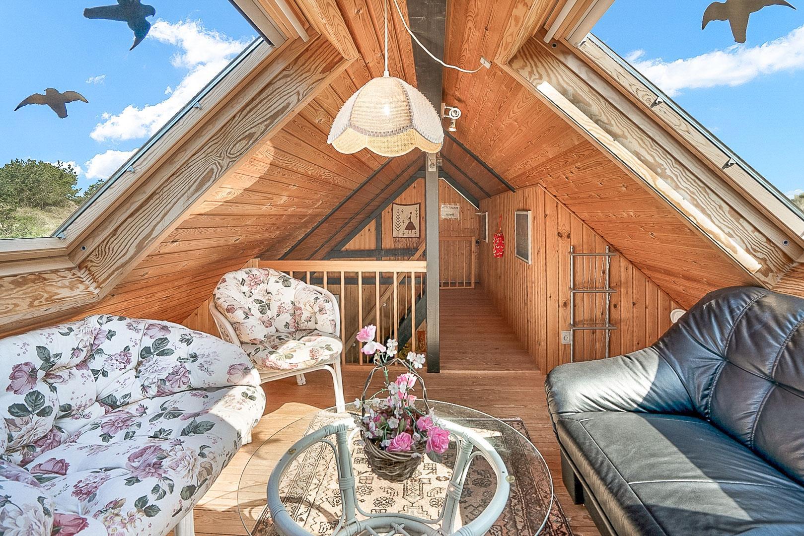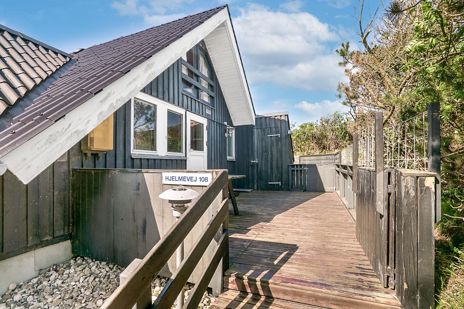 På Hjelmevej ligger der et hyggeligt sommerhus, ideelt placeret tæt på den charmerende by Henne Strand, kendt for sine mange caféer, gode shopping muligheder og en af de bedste strande langs den jyske vestkyst. Sommerhuset ligger højt og godt placeret bag frodig beplantning, hvilket giver en følelse af privatliv og ro. Dette ældre, men charmerende sommerhus er i to plan. På stueetagen finder du både køkken, stue, badeværelse og begge soveværelser. Stuen byder på to hyggelige sofagrupper og et spisebord, perfekt til fælles måltider og afslapning. Fra stuen fører en skydedør ud til en dejlig stor lukket terrasse, hvor du kan nyde solen og frisk luft i fred og ro. På første salen venter en dejlig lille stue med en betagende udsigt over området og de omkringliggende sommerhuse. Det er det perfekte sted at slappe af med en god bog eller bare nyde den fantastiske udsigt.