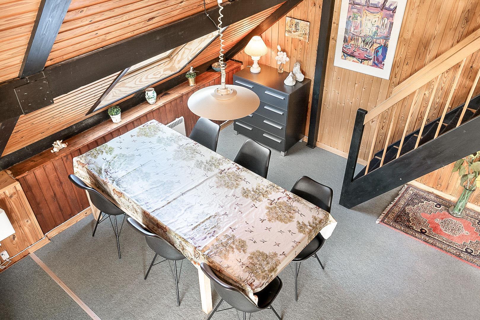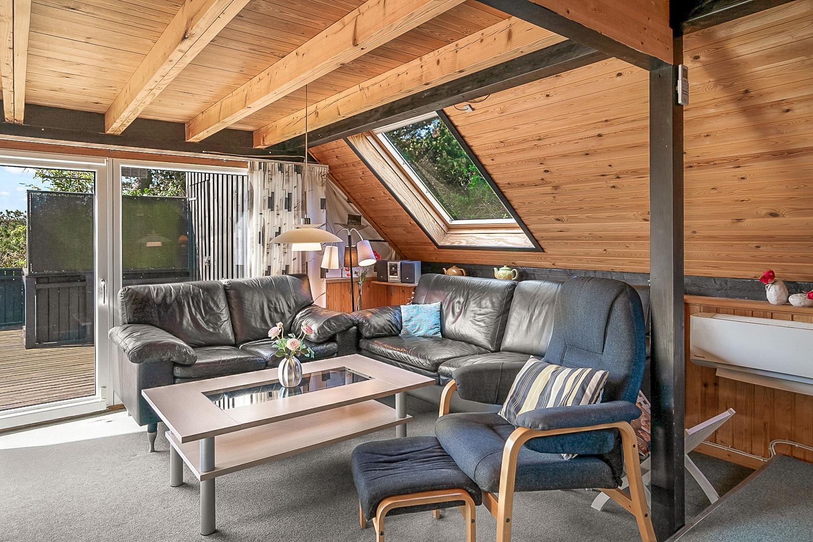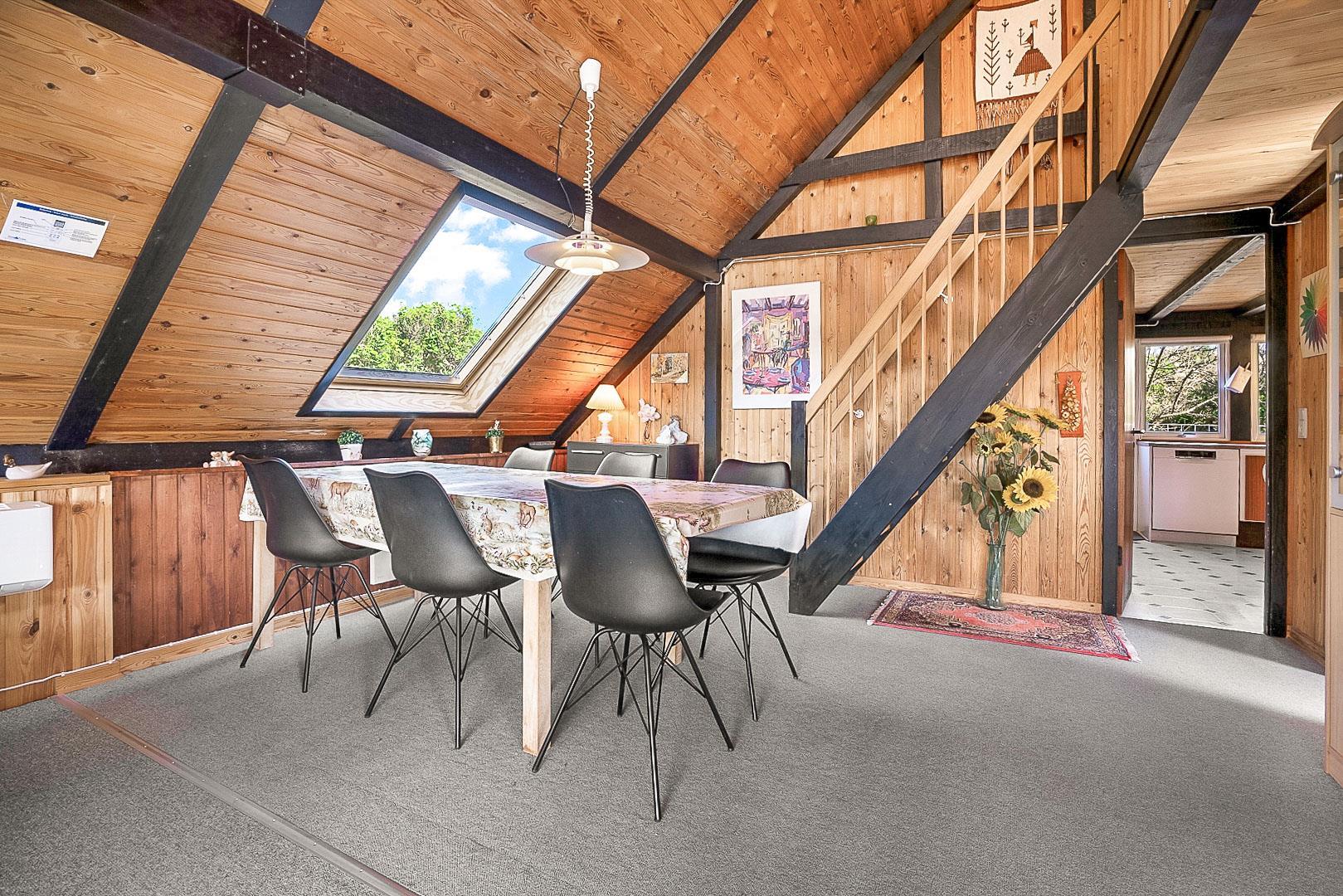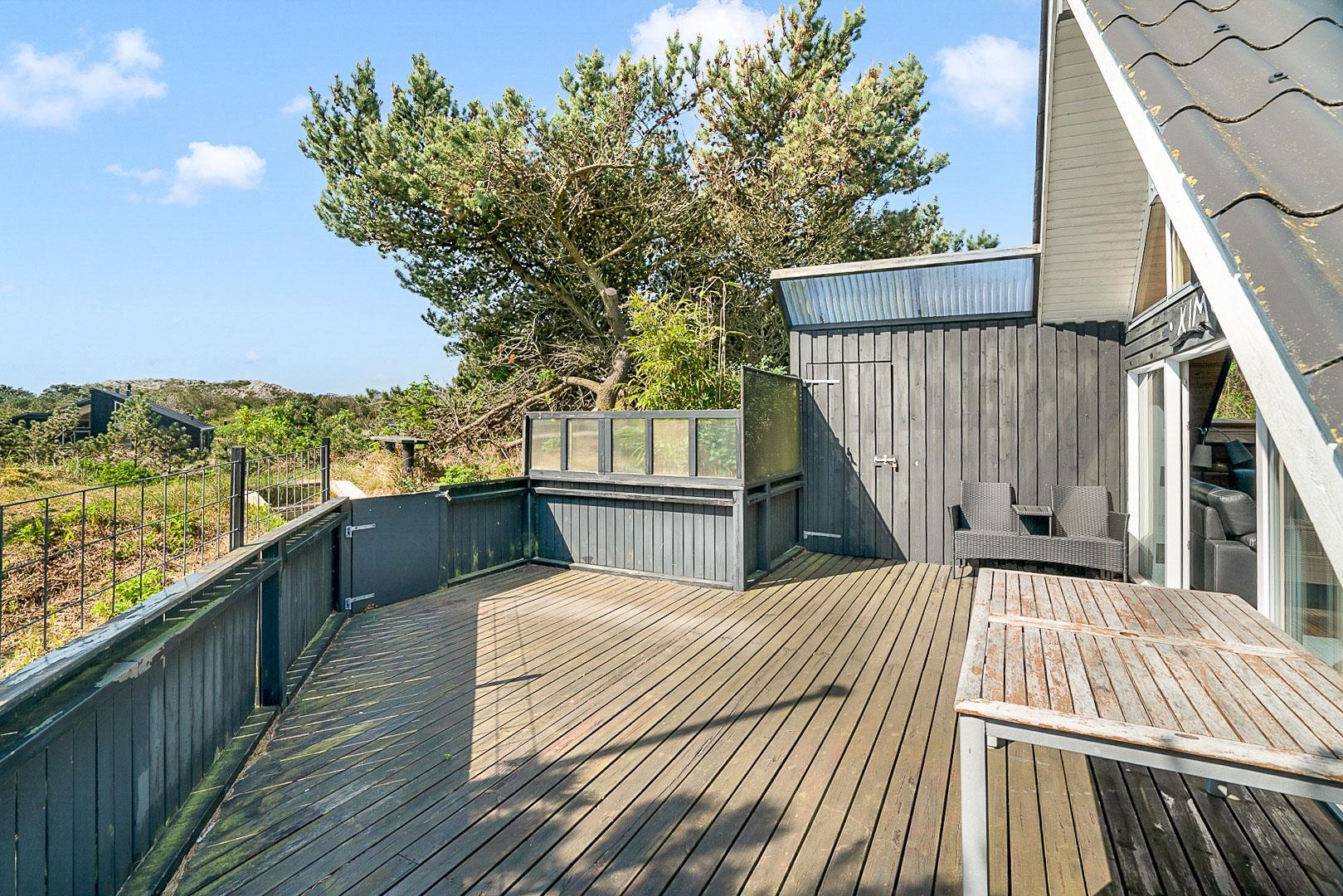 På Hjelmevej ligger der et hyggeligt sommerhus, ideelt placeret tæt på den charmerende by Henne Strand, kendt for sine mange caféer, gode shopping muligheder og en af de bedste strande langs den jyske vestkyst. Sommerhuset ligger højt og godt placeret bag frodig beplantning, hvilket giver en følelse af privatliv og ro. Dette ældre, men charmerende sommerhus er i to plan. På stueetagen finder du både køkken, stue, badeværelse og begge soveværelser. Stuen byder på to hyggelige sofagrupper og et spisebord, perfekt til fælles måltider og afslapning. Fra stuen fører en skydedør ud til en dejlig stor lukket terrasse, hvor du kan nyde solen og frisk luft i fred og ro. På første salen venter en dejlig lille stue med en betagende udsigt over området og de omkringliggende sommerhuse. Det er det perfekte sted at slappe af med en god bog eller bare nyde den fantastiske udsigt.
