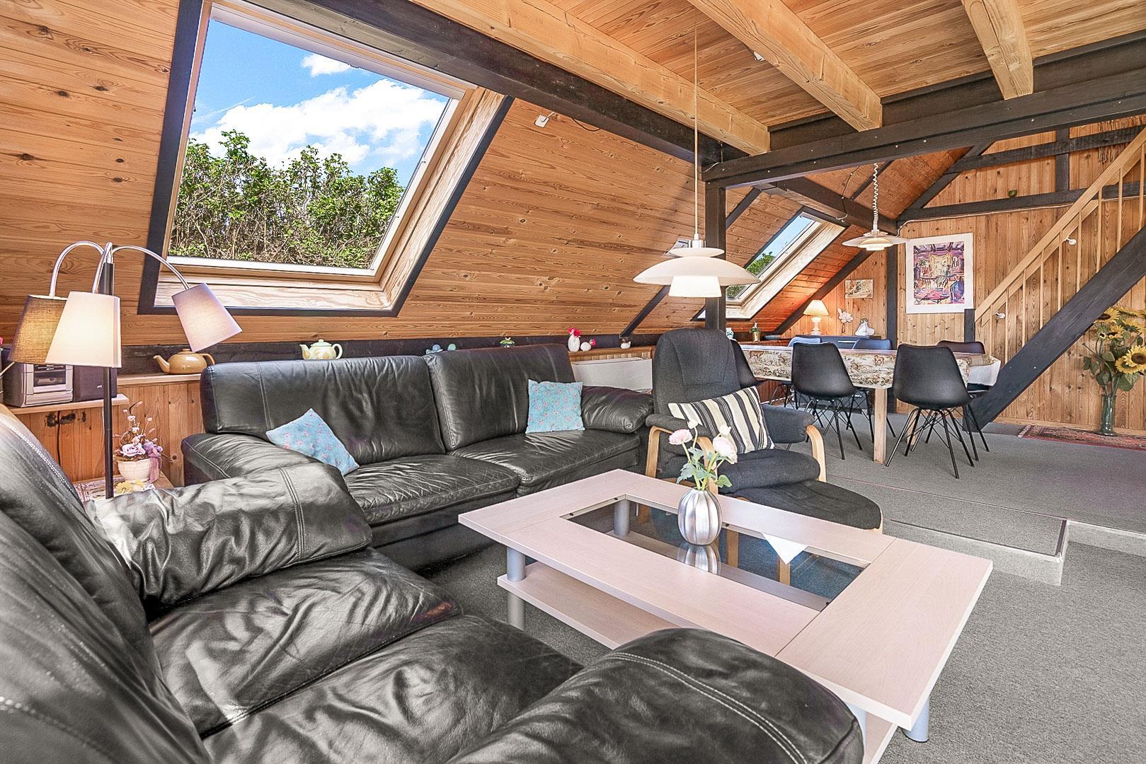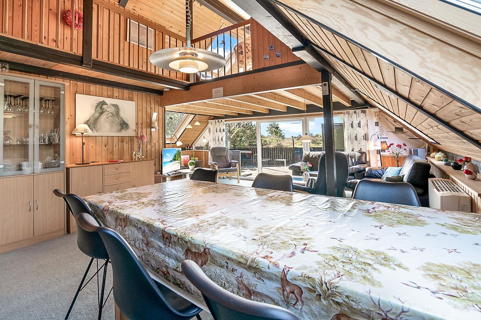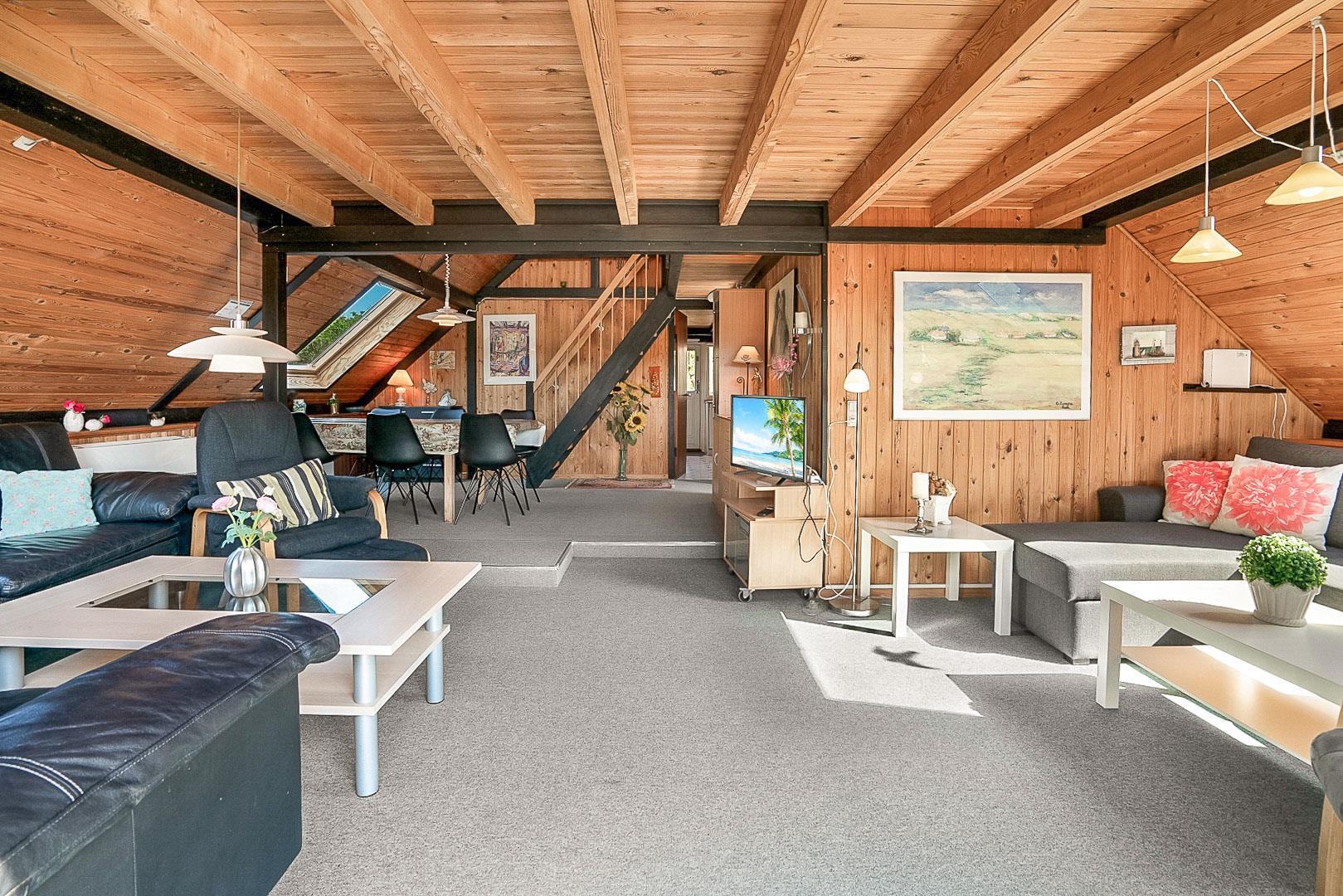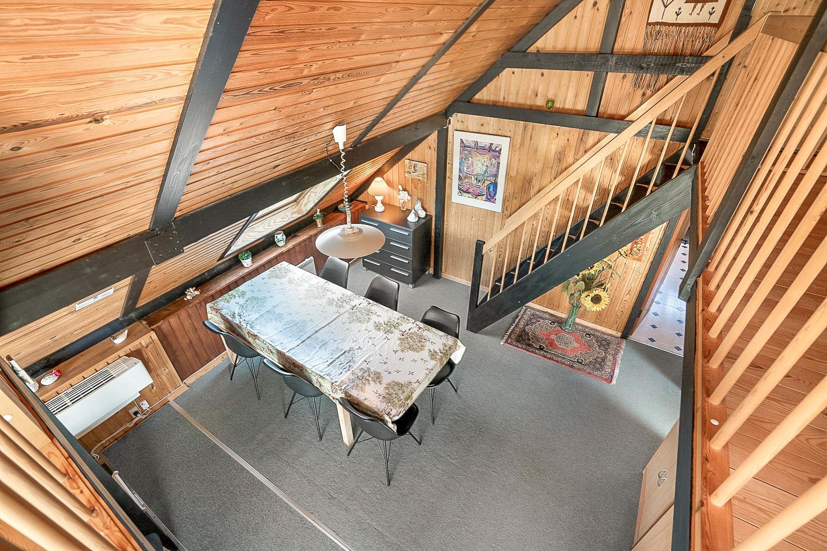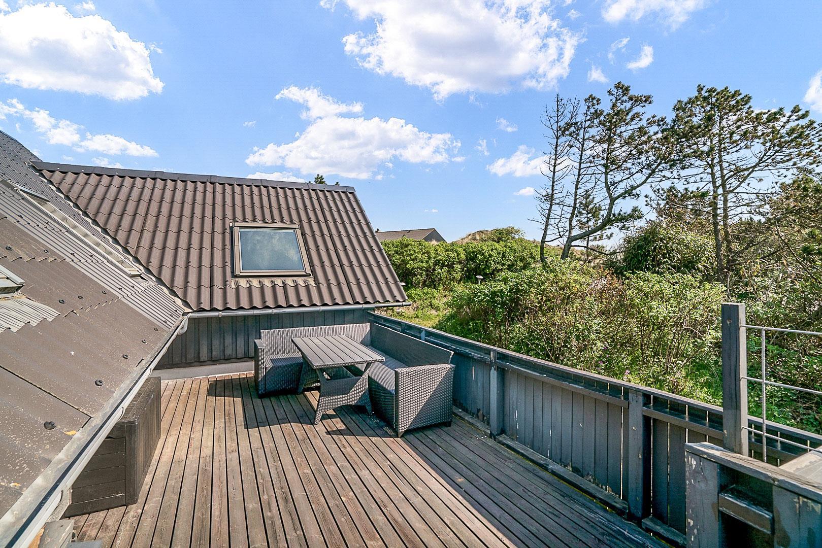 På Hjelmevej ligger der et hyggeligt sommerhus, ideelt placeret tæt på den charmerende by Henne Strand, kendt for sine mange caféer, gode shopping muligheder og en af de bedste strande langs den jyske vestkyst. Sommerhuset ligger højt og godt placeret bag frodig beplantning, hvilket giver en følelse af privatliv og ro. Dette ældre, men charmerende sommerhus er i to plan. På stueetagen finder du både køkken, stue, badeværelse og begge soveværelser. Stuen byder på to hyggelige sofagrupper og et spisebord, perfekt til fælles måltider og afslapning. Fra stuen fører en skydedør ud til en dejlig stor lukket terrasse, hvor du kan nyde solen og frisk luft i fred og ro. På første salen venter en dejlig lille stue med en betagende udsigt over området og de omkringliggende sommerhuse. Det er det perfekte sted at slappe af med en god bog eller bare nyde den fantastiske udsigt.