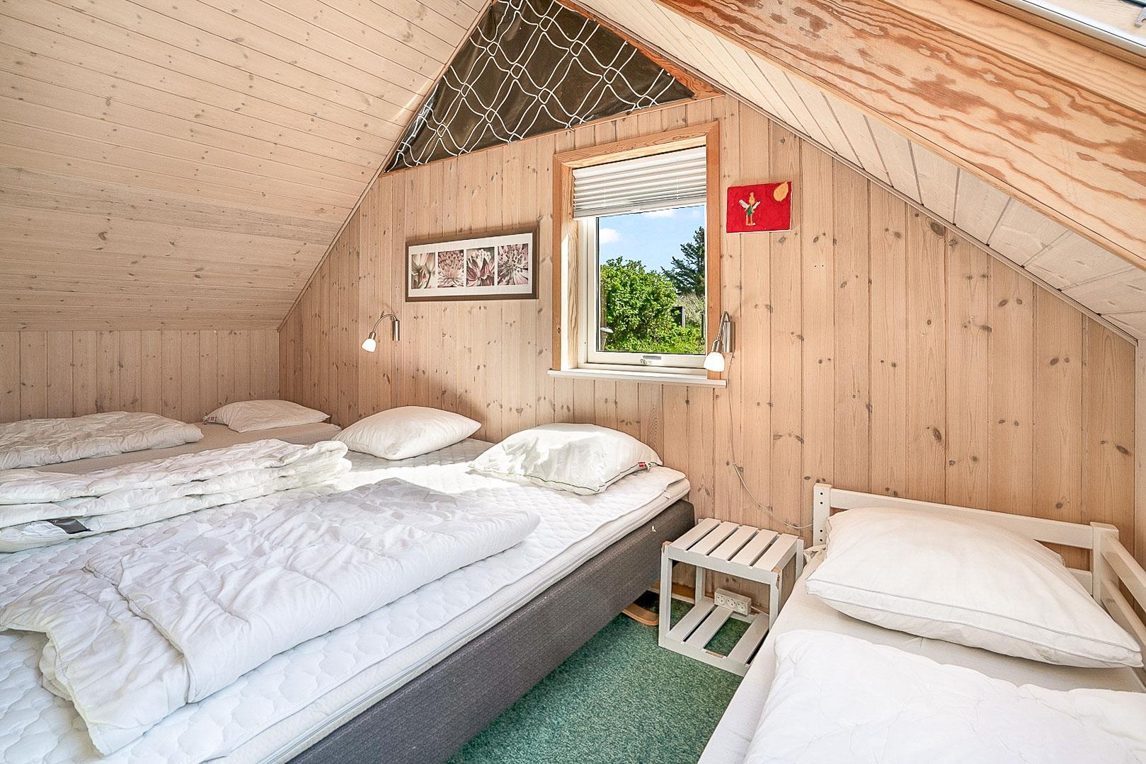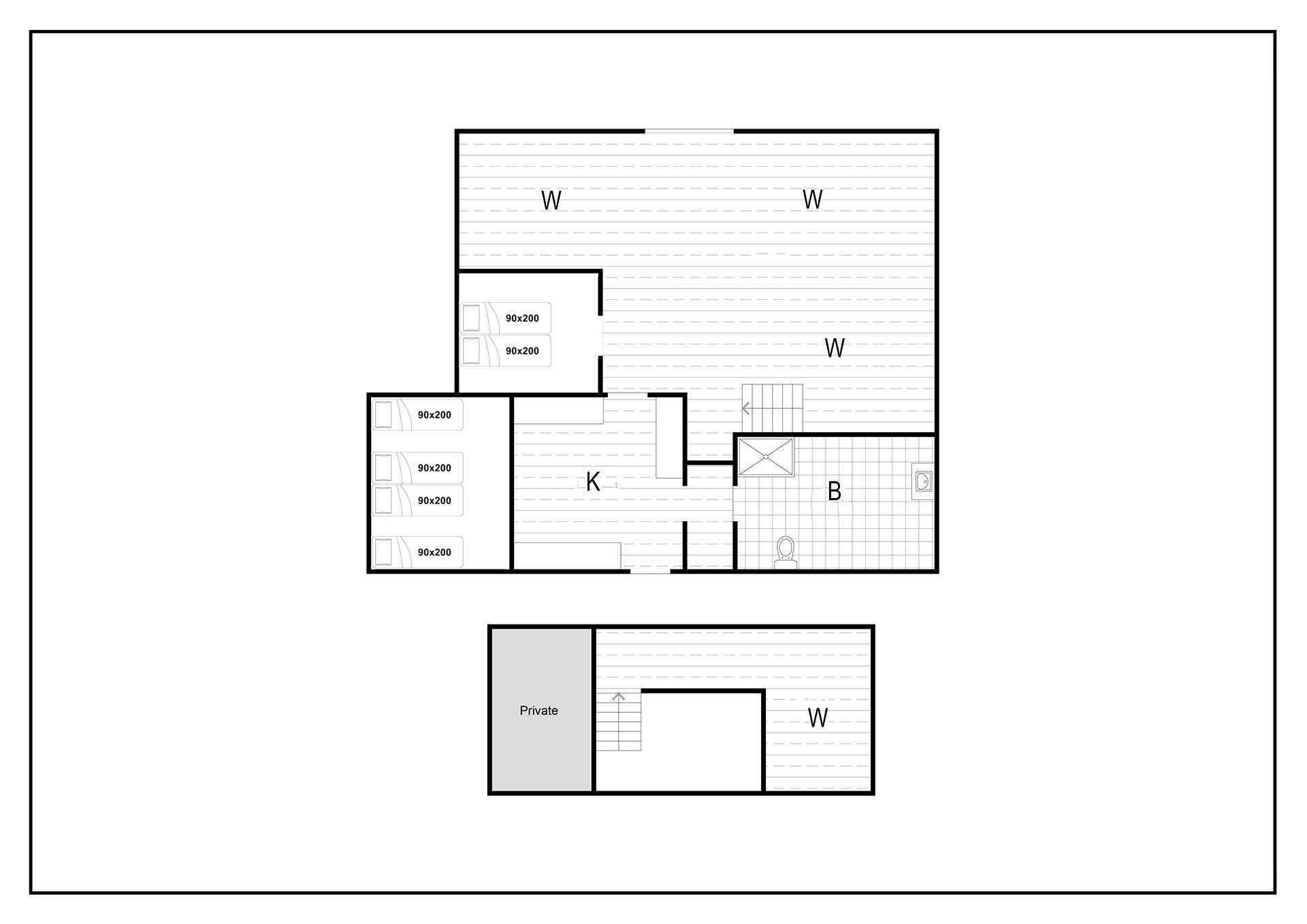 Sengestørrelse: 2 dobbeltsenge med 2 madrasser 90 x 200 cm + 2 enkeltsenge 90 x 200 cm.