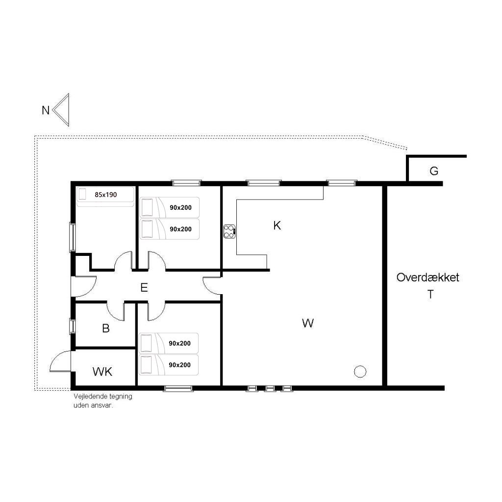 Hyggeligt feriehus beliggende på en lukket hede grund og med flere terrasser og læ kroge. Opsat Weber grill. Åben køkken/stue med udgang til delvis overdækket terrasse. Smagfuldt og hyggeligt indrettet med bl.a. nyere køkken og bad. Sengestørrelser: dobbeltseng 180x200 cm. (2 madrasser), dobbeltseng 180x200 cm. (2 madrasser), køjesenge 85x190.