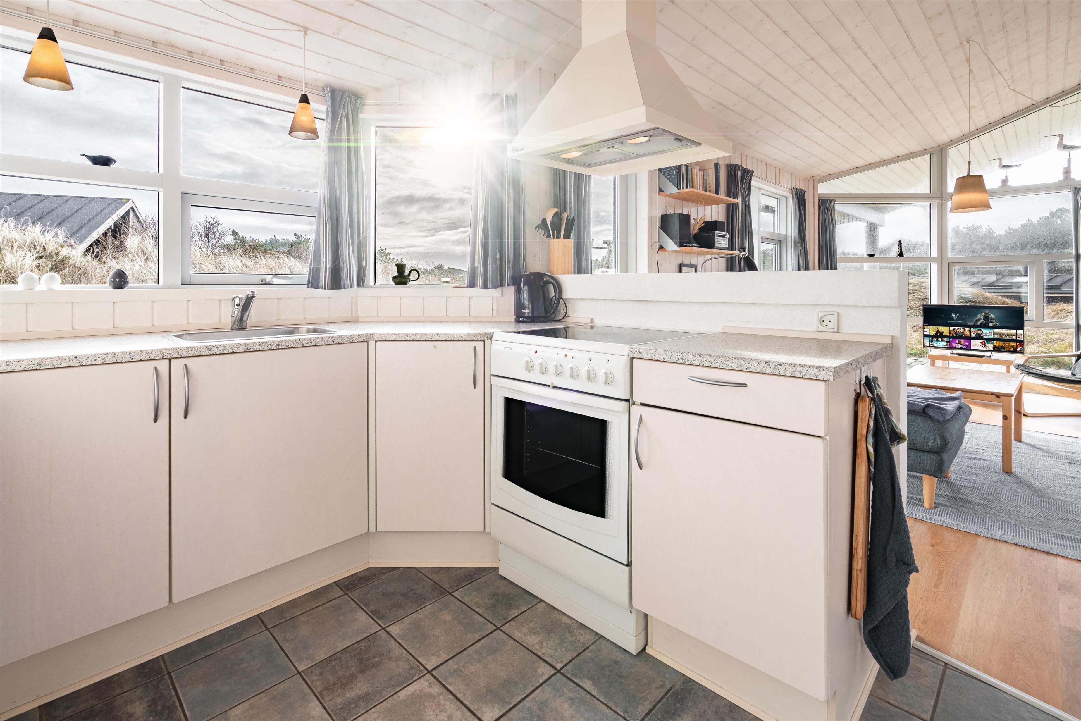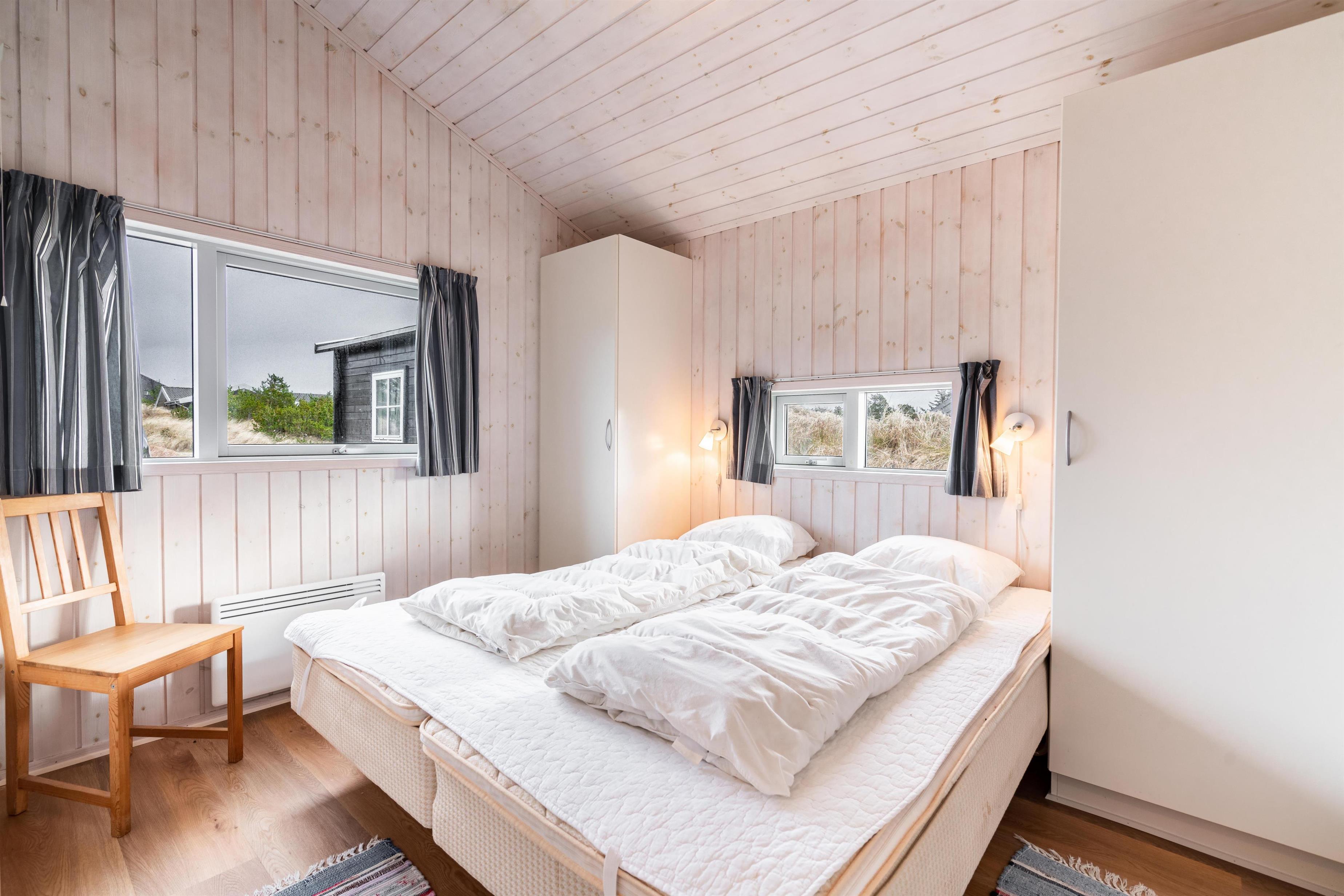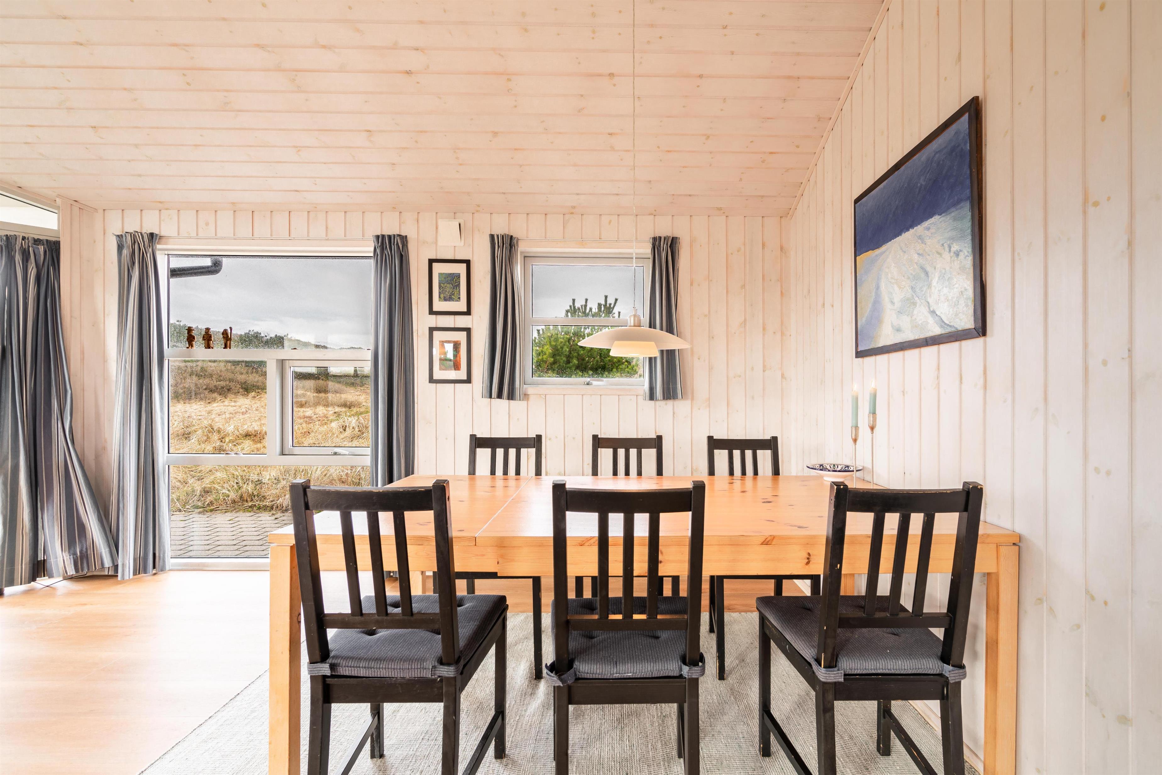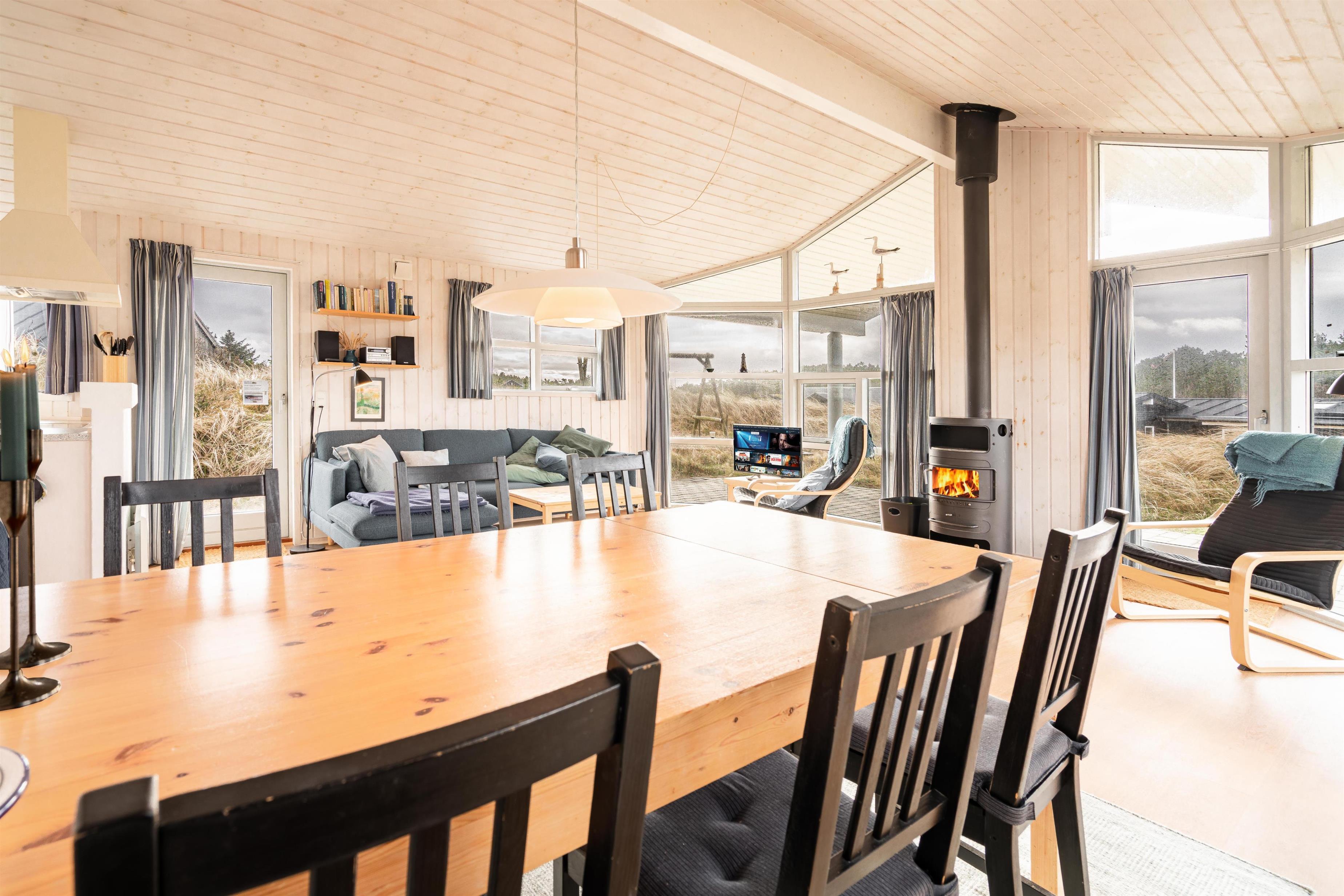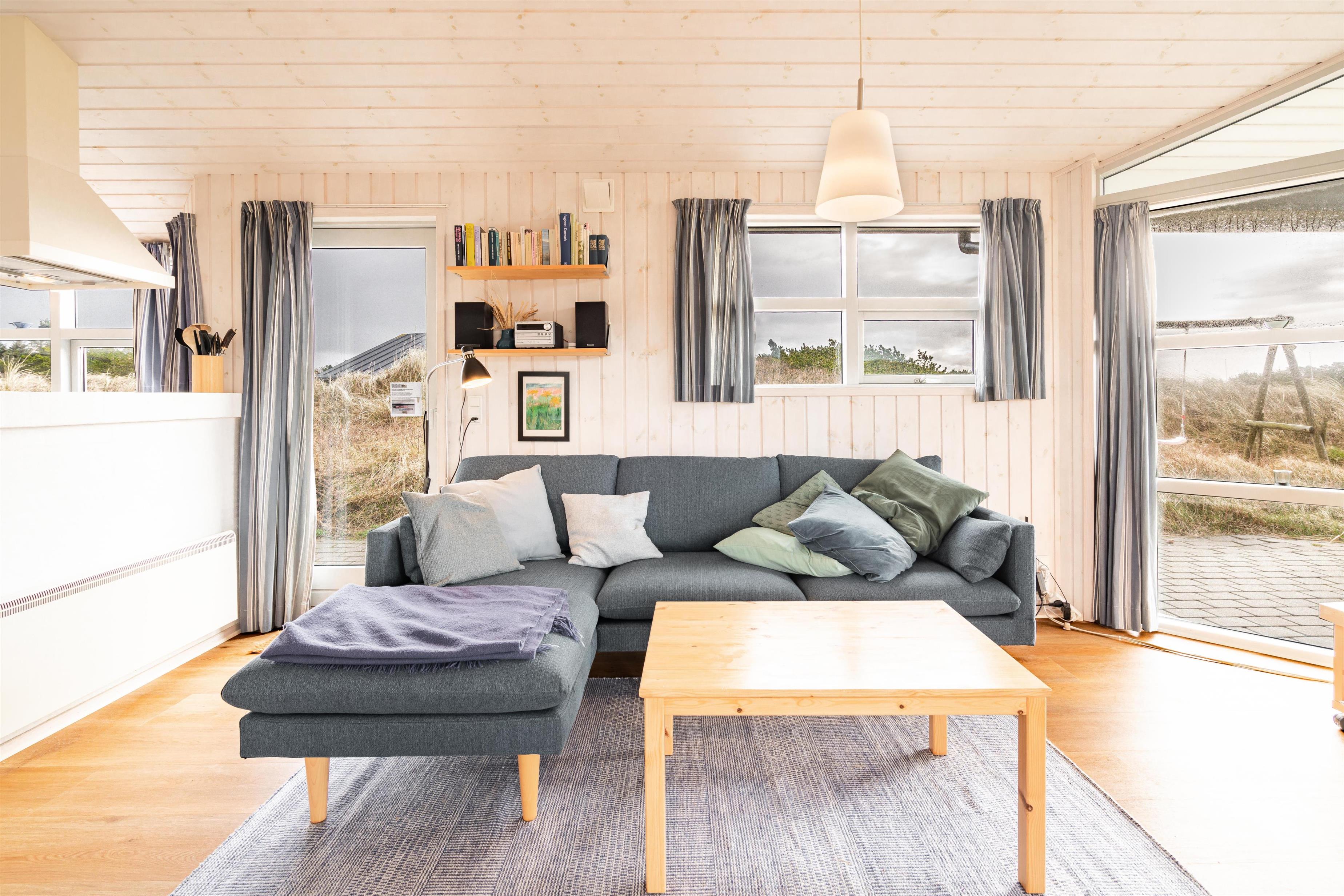 Fantastisk feriehus beliggende i første klitrække ud til stort, fredet naturområde - tæt ved Vesterhavets bølger. Fra den velindrettede, lyse stue er der pragtfuld udsigt til klitterne og direkte adgang til de ugenerede terrasser, der ligger rundt om huset (både åbne og en overdækket). Moderne og godt udstyret køkken med bl.a. opvaskemaskine. To gode soveværelser med dobbeltsenge. Badeværelse med bruseniche, sauna og gulvvarme. Huset er beliggende ved en blind vej - midt i naturen. Velegnet til børnefamilien eller til den, der ønsker fred og nærhed til stranden og den smukke natur - hele året rundt.