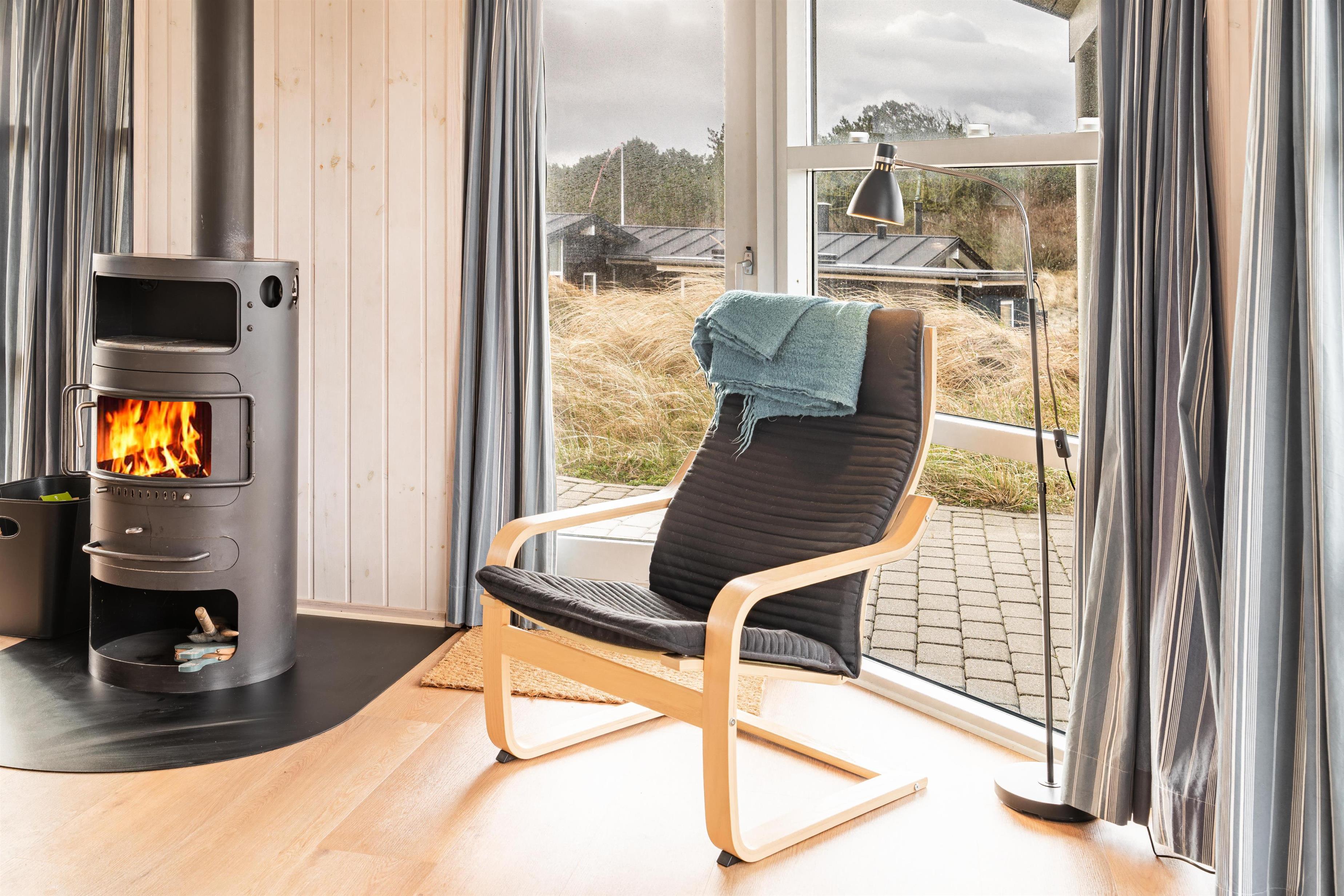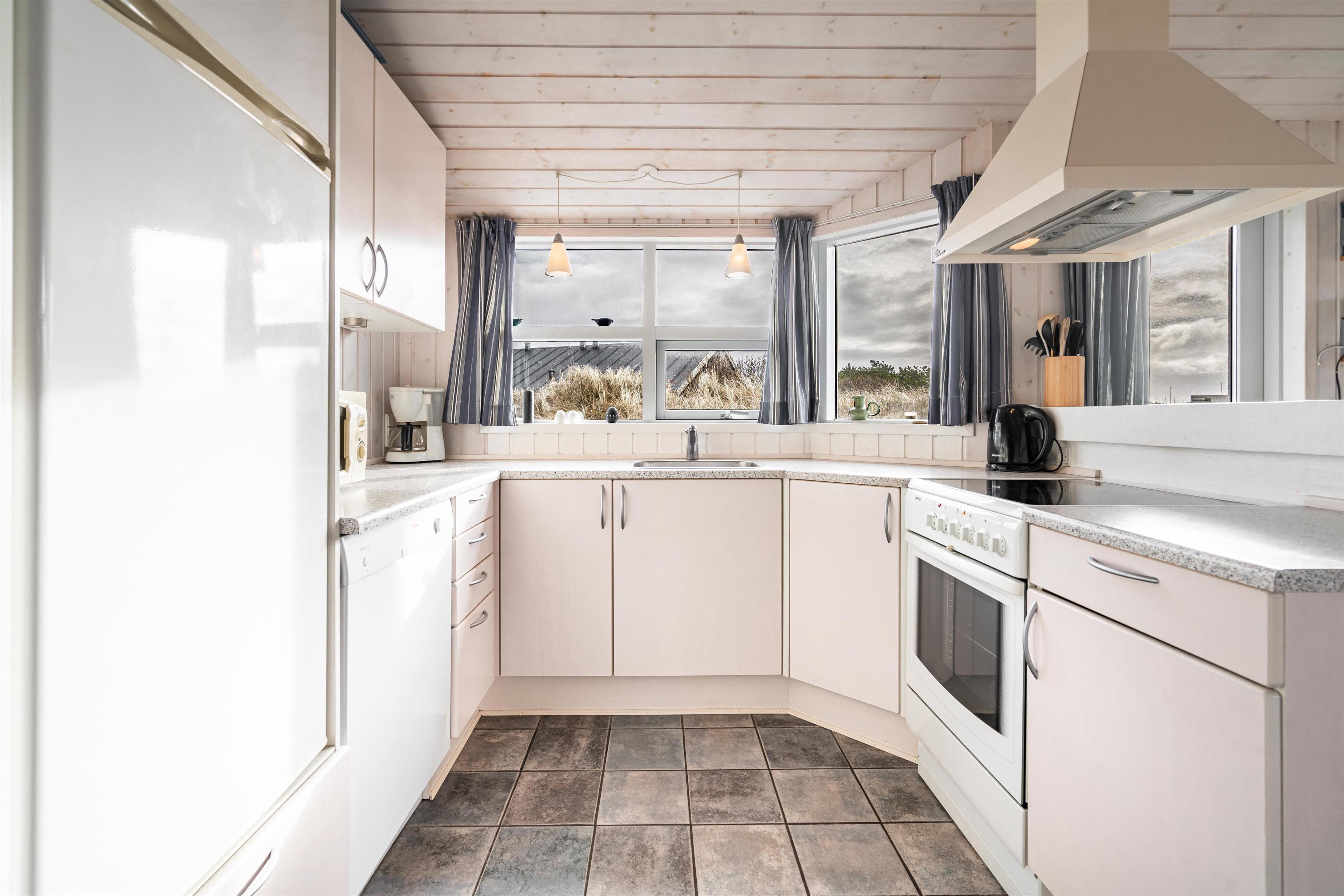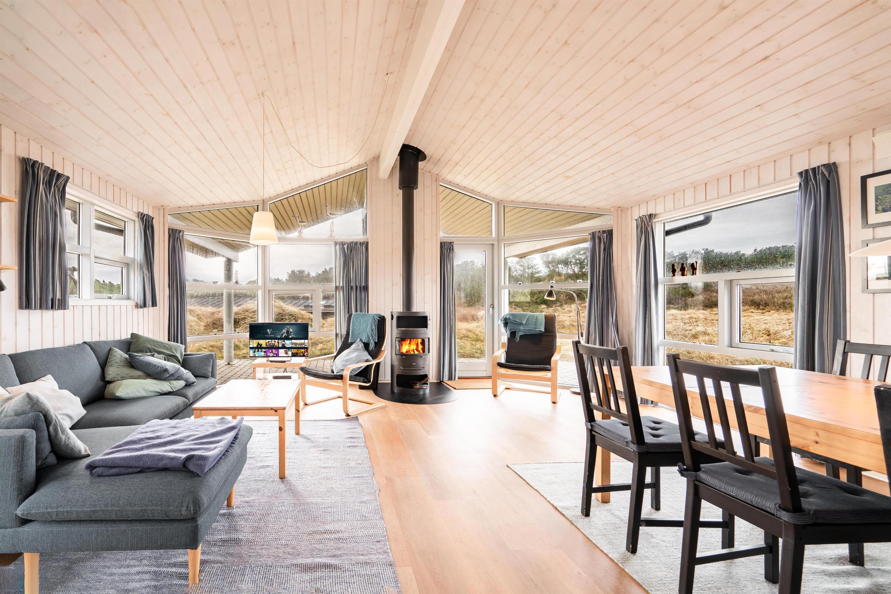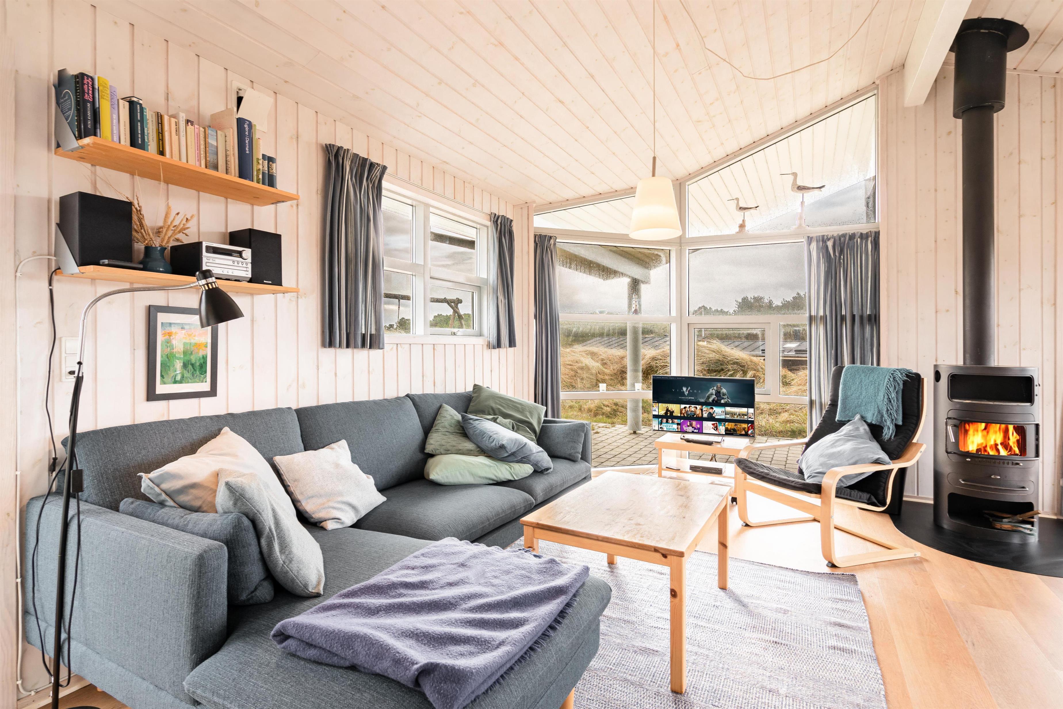 Fantastisk feriehus beliggende i første klitrække ud til stort, fredet naturområde - tæt ved Vesterhavets bølger. Fra den velindrettede, lyse stue er der pragtfuld udsigt til klitterne og direkte adgang til de ugenerede terrasser, der ligger rundt om huset (både åbne og en overdækket). Moderne og godt udstyret køkken med bl.a. opvaskemaskine. To gode soveværelser med dobbeltsenge. Badeværelse med bruseniche, sauna og gulvvarme. Huset er beliggende ved en blind vej - midt i naturen. Velegnet til børnefamilien eller til den, der ønsker fred og nærhed til stranden og den smukke natur - hele året rundt.
