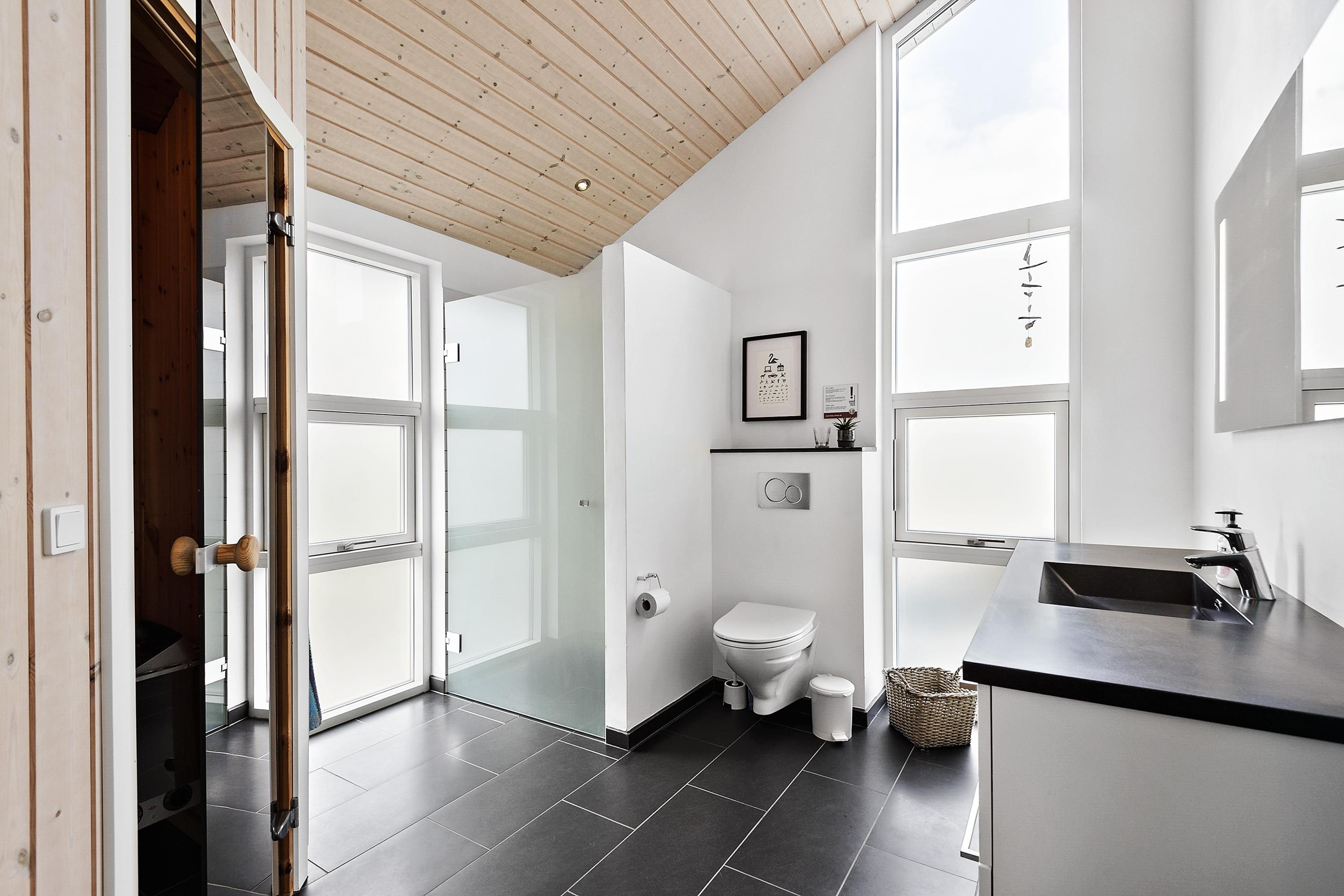 Huset har 2 toiletter hvoraf det ene er ret stort, og indrettet med sauna og brus.