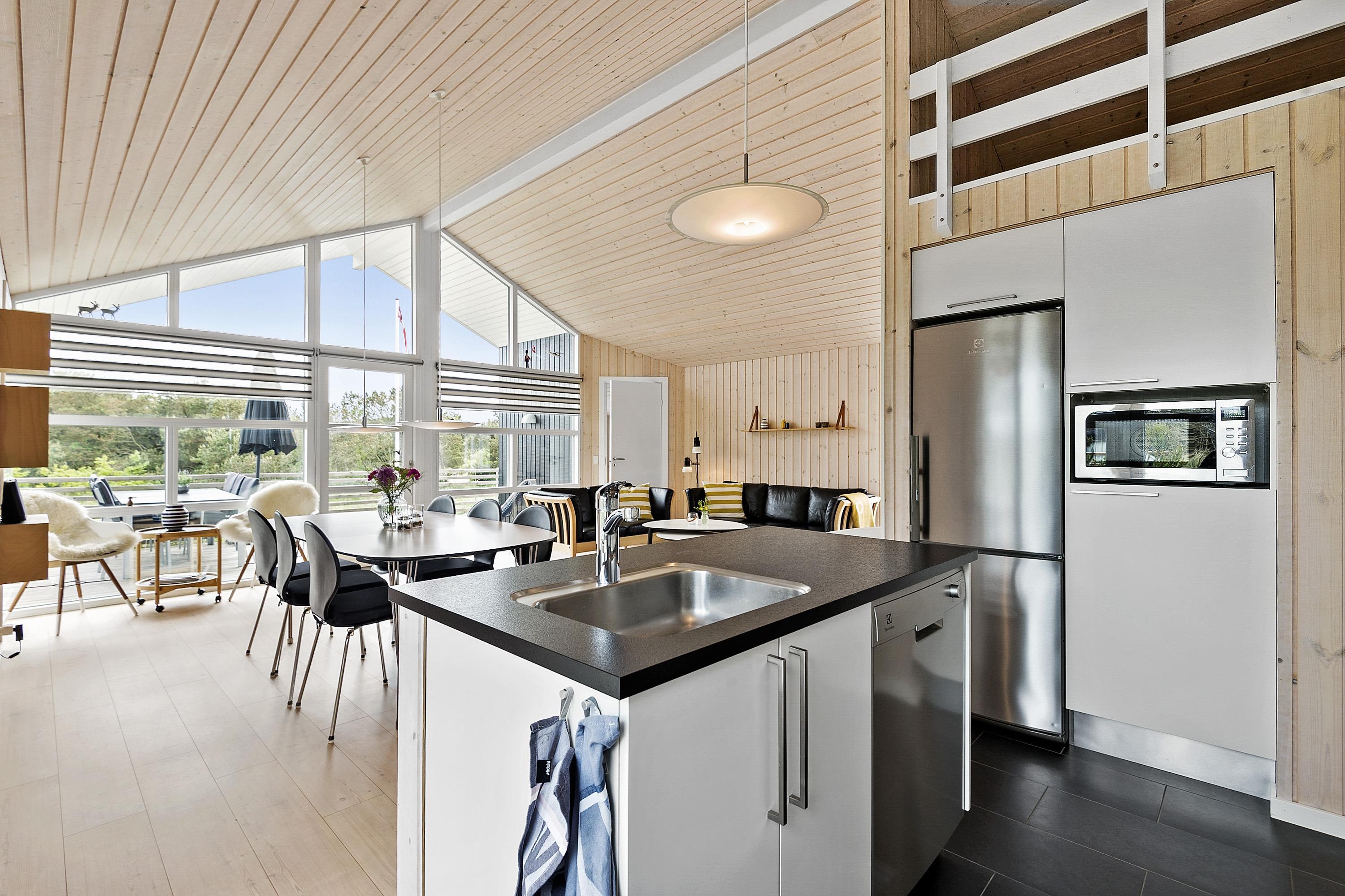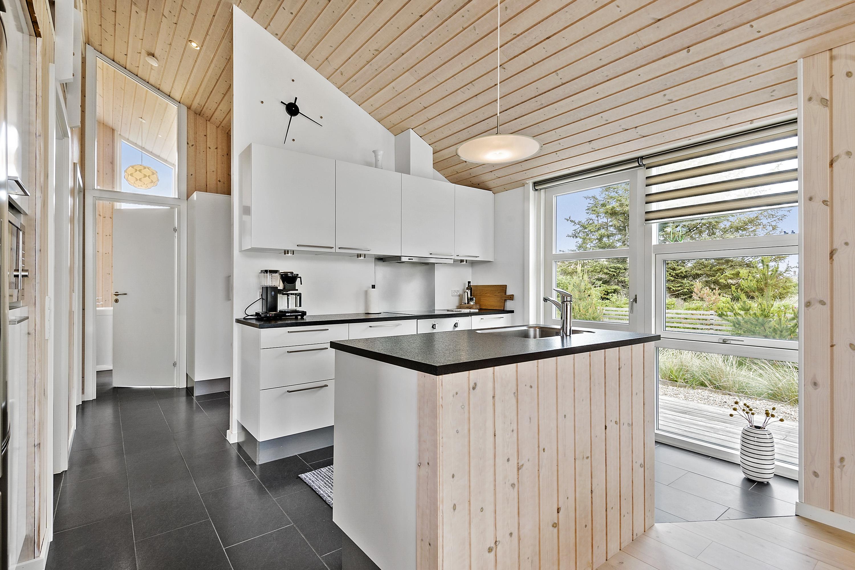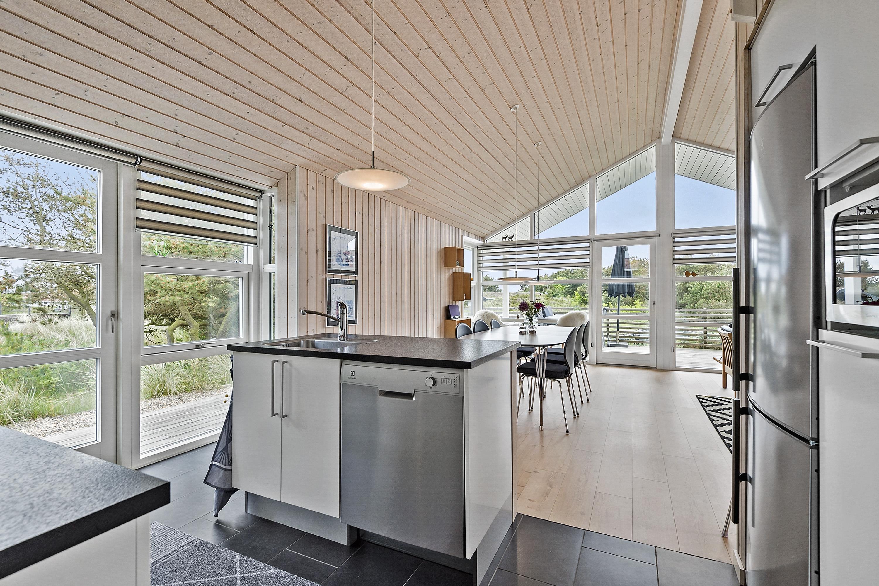 Køkken og stue er et stort rum, hvorfra der er adgang til terrassen.