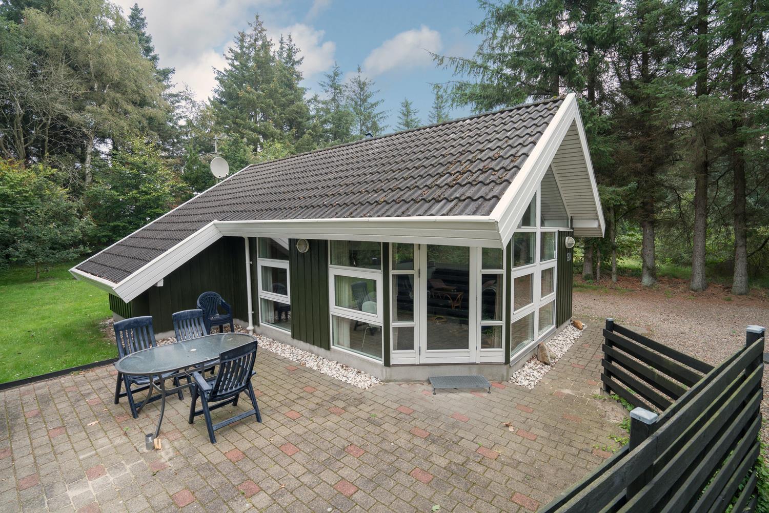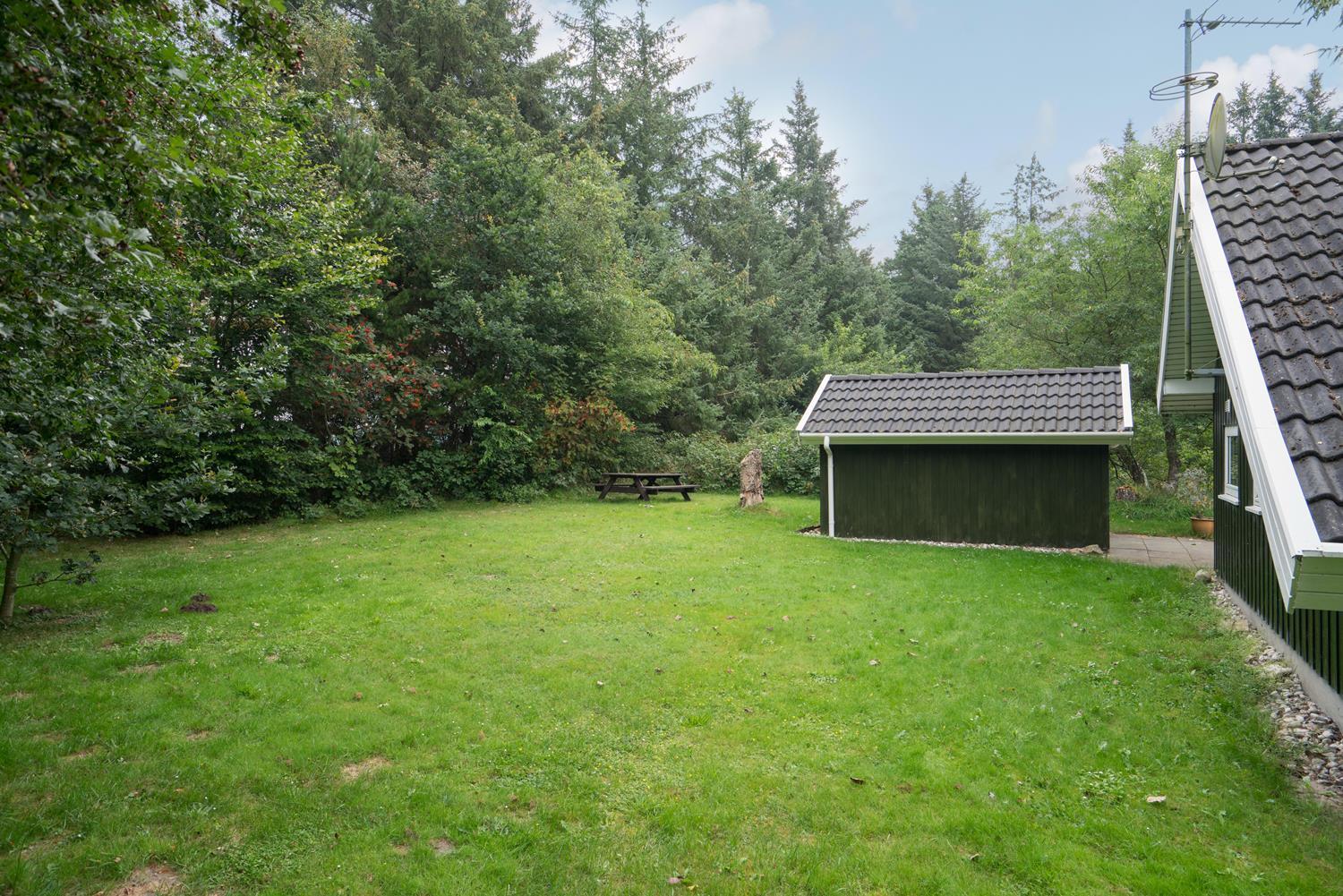 Udenfor finder I en dejlig naturgrund med god plads til leg, solbadning og afslapning. På den delvist overdækkede terrasse kan I nyde morgenkaffen i læ for vinden eller afslutte dagen med et glas vin, mens I lytter til naturens lyde omkring jer.