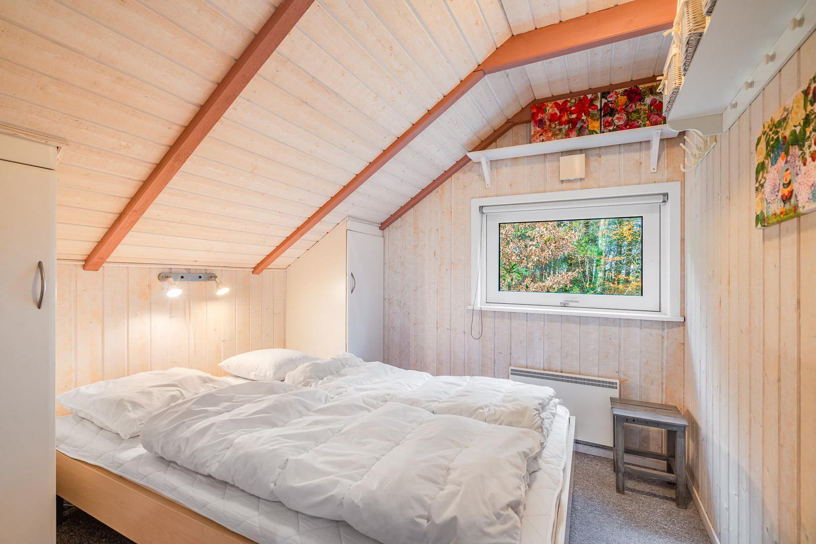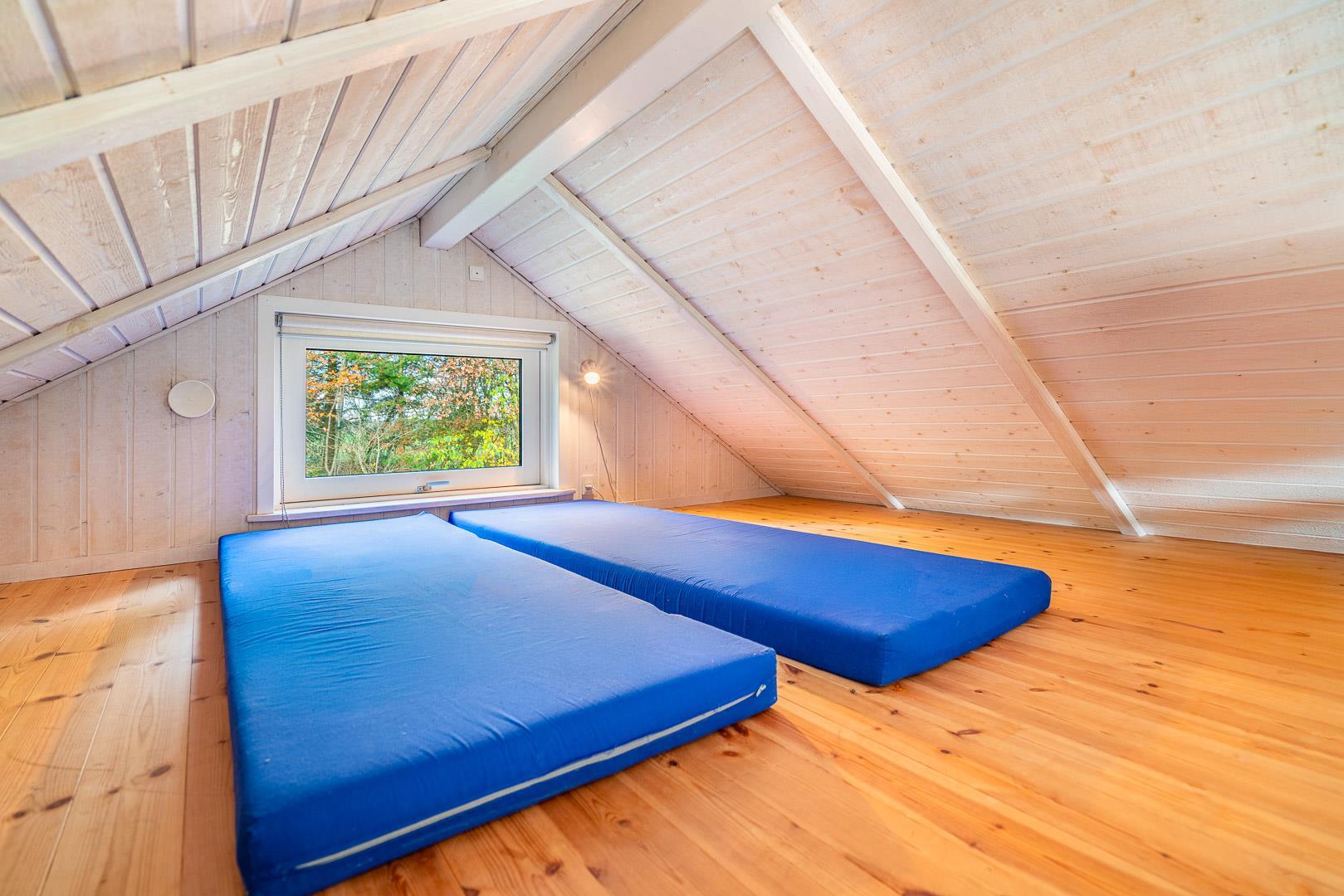 Der er to soveværelser – et med dobbeltseng og et med to enkeltsenge – samt en hyggelig hems, som børnene vil elske. Hemsen egner sig også perfekt som lille læsehjørne eller hyggekrog.