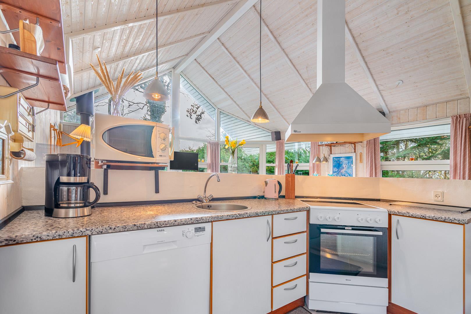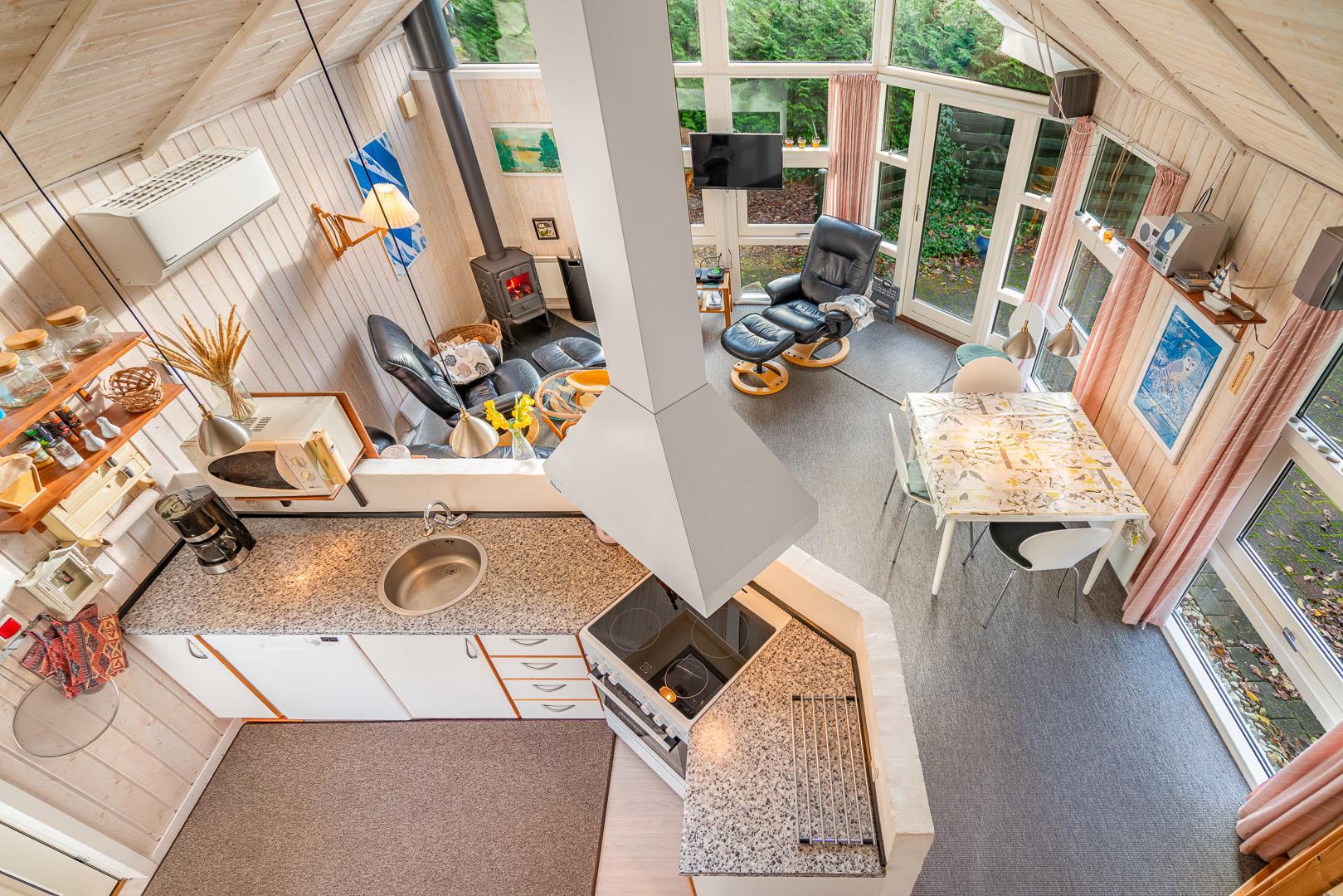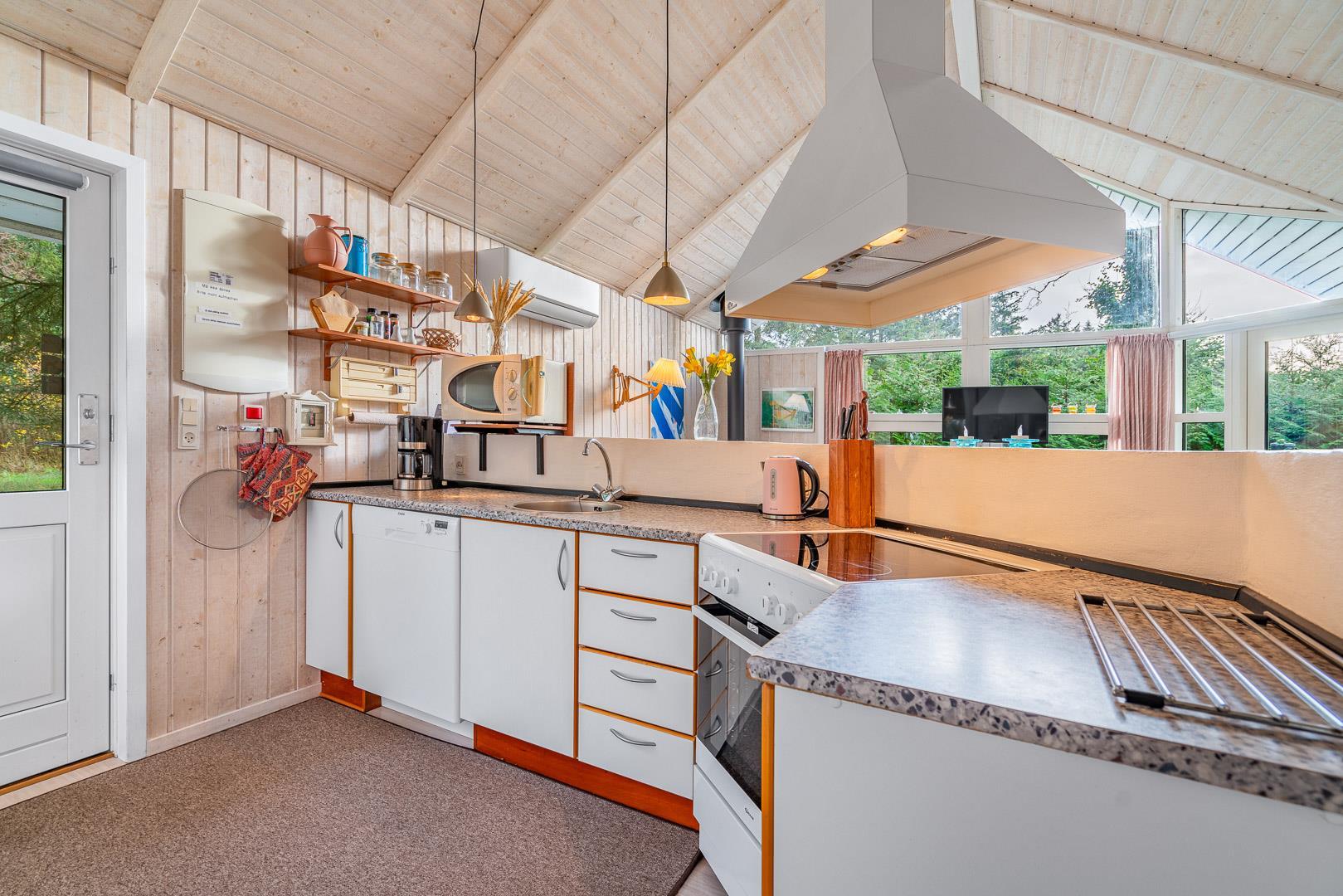 Den åbne stue med køkken og spiseplads fungerer som sommerhusets samlingspunkt. Her kan I lave mad sammen, spille spil eller bare nyde roen foran brændeovnen. Køkkenet er veludstyret og har naturligvis opvaskemaskine, så der er mere tid til afslapning.