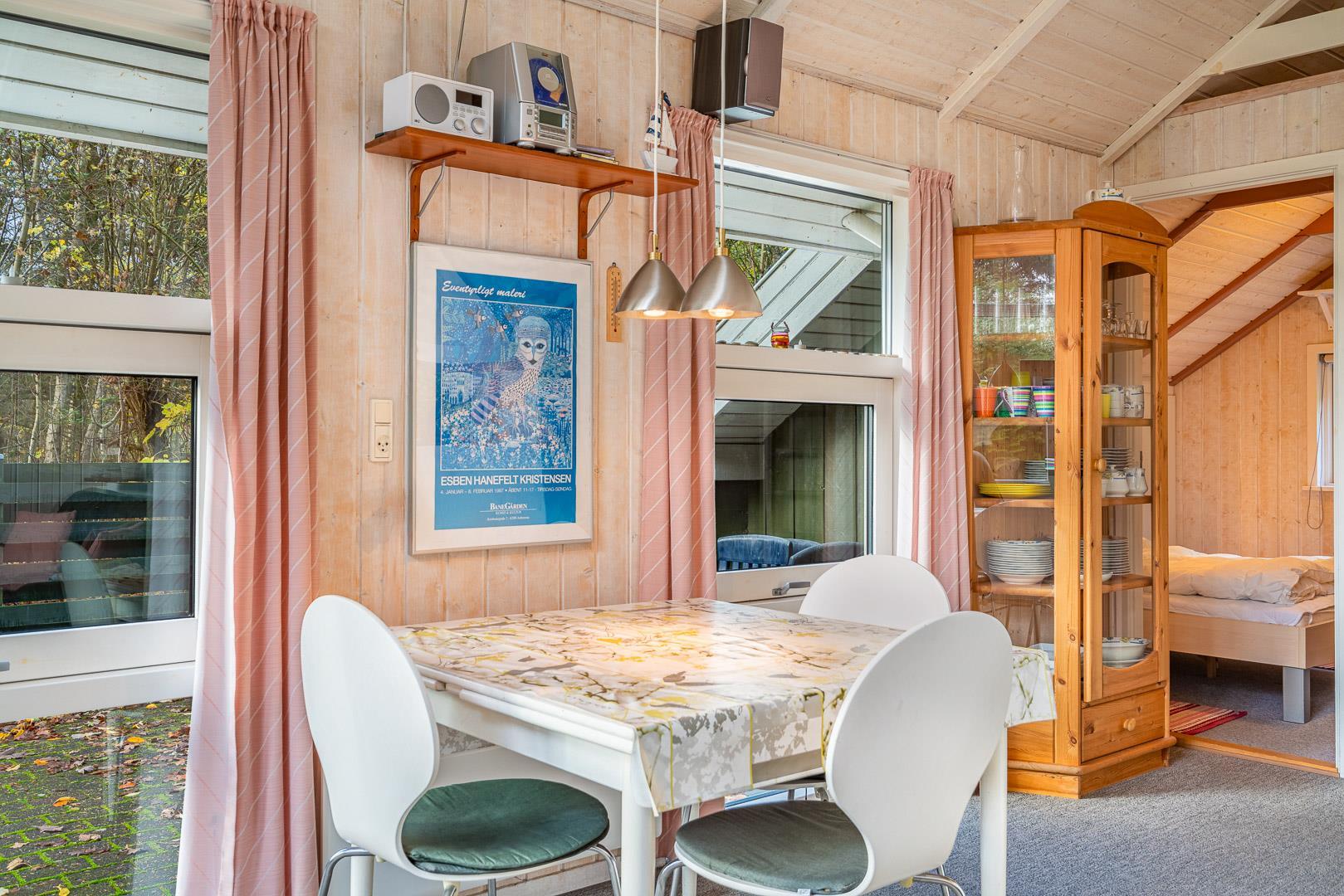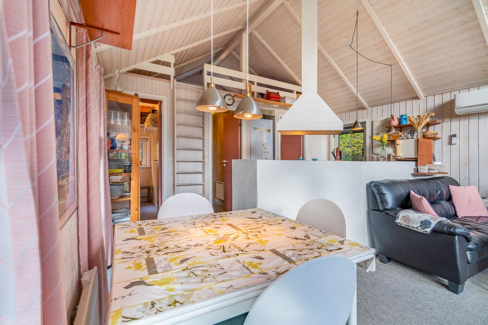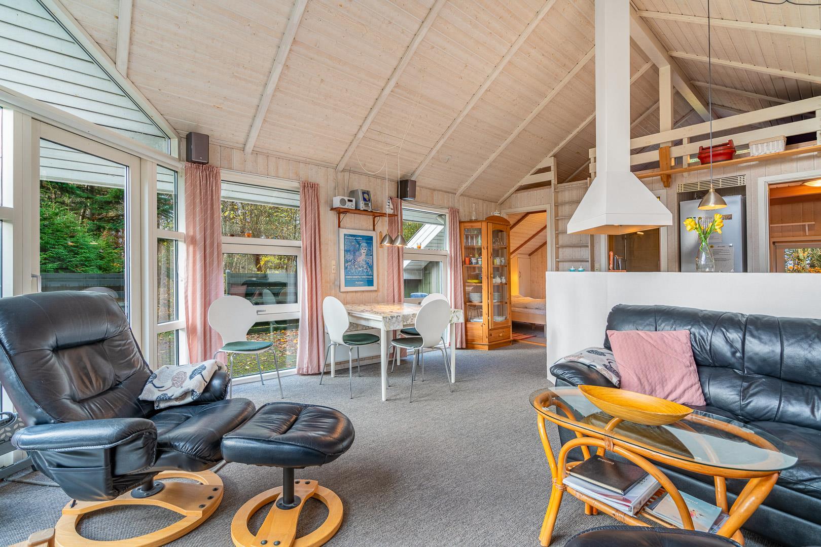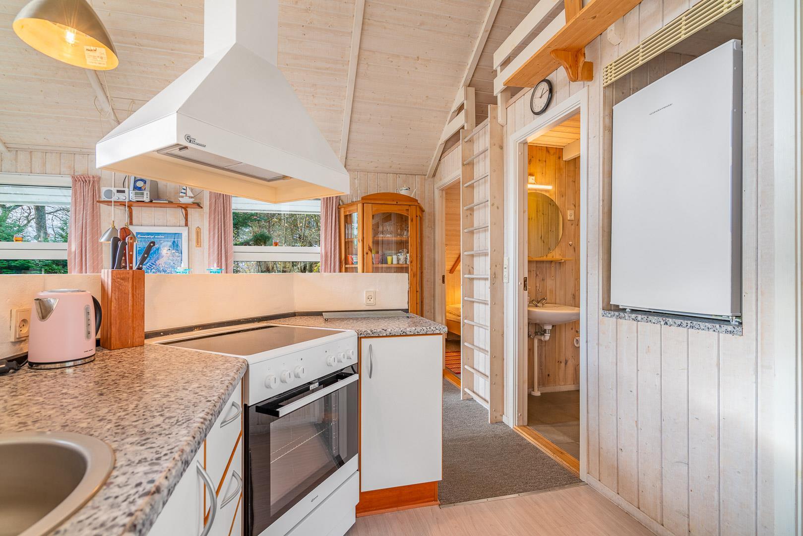 Den åbne stue med køkken og spiseplads fungerer som sommerhusets samlingspunkt. Her kan I lave mad sammen, spille spil eller bare nyde roen foran brændeovnen. Køkkenet er veludstyret og har naturligvis opvaskemaskine, så der er mere tid til afslapning.