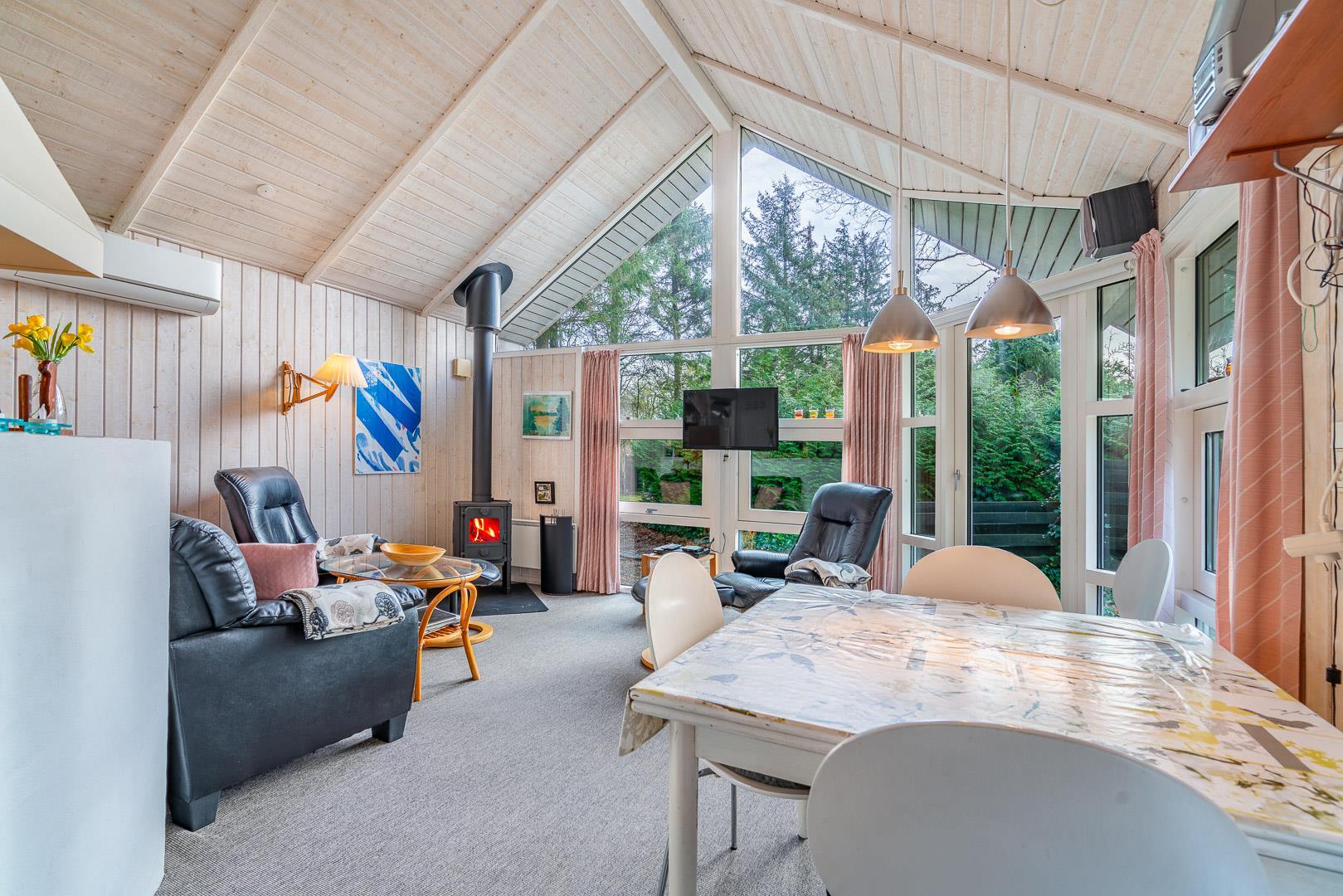 Takket være varmepumpen kan sommerhuset opvarmes effektivt og miljøvenligt, og i de kolde måneder giver brændeovnen ekstra varme og stemning. Badeværelset har gulvvarme, så du starter dagen med varme fødder og ekstra komfort.