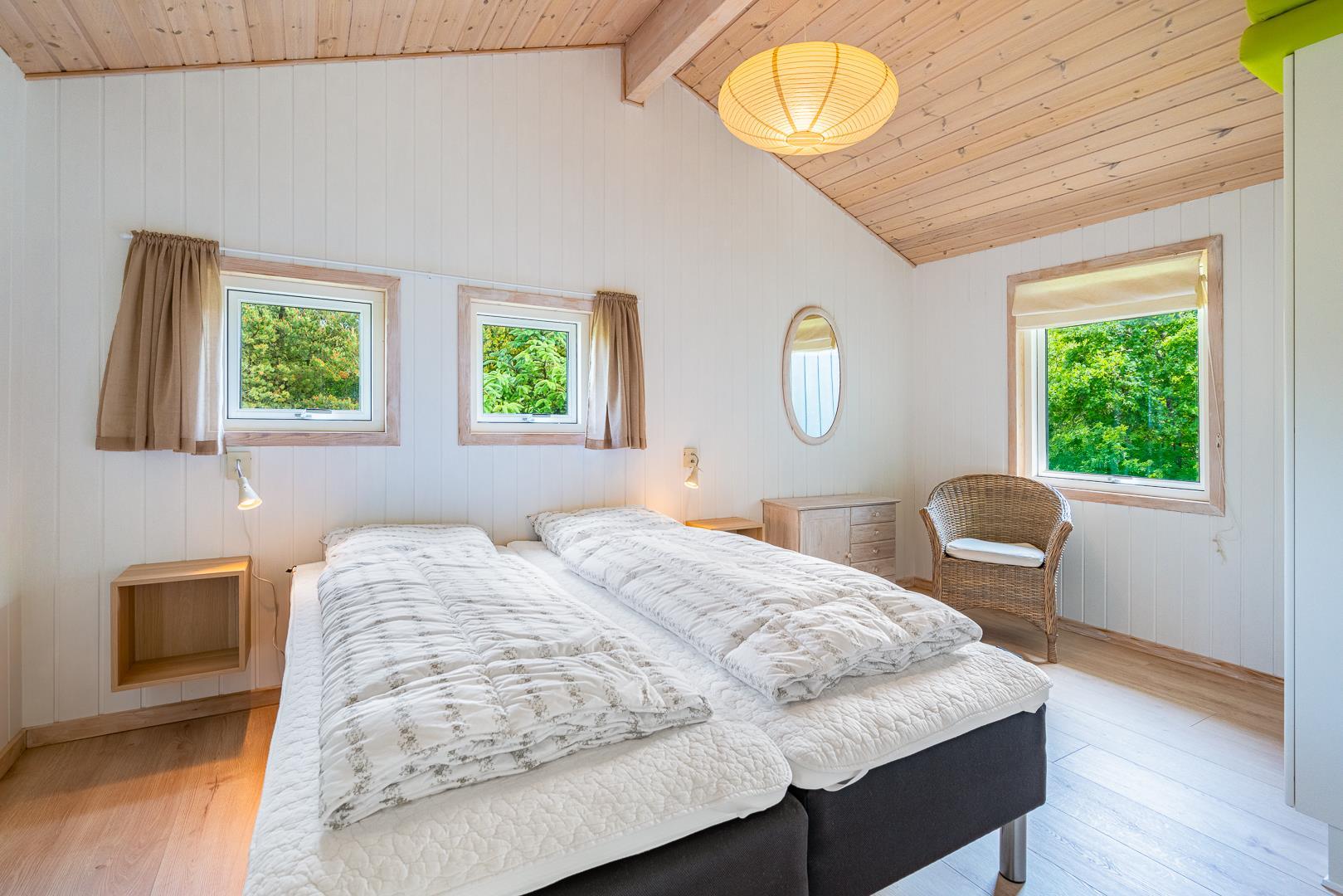 Der er to soveværelser: ét med dobbeltseng, og èt med to enkeltsenge – oplagt til børn eller medrejsende.